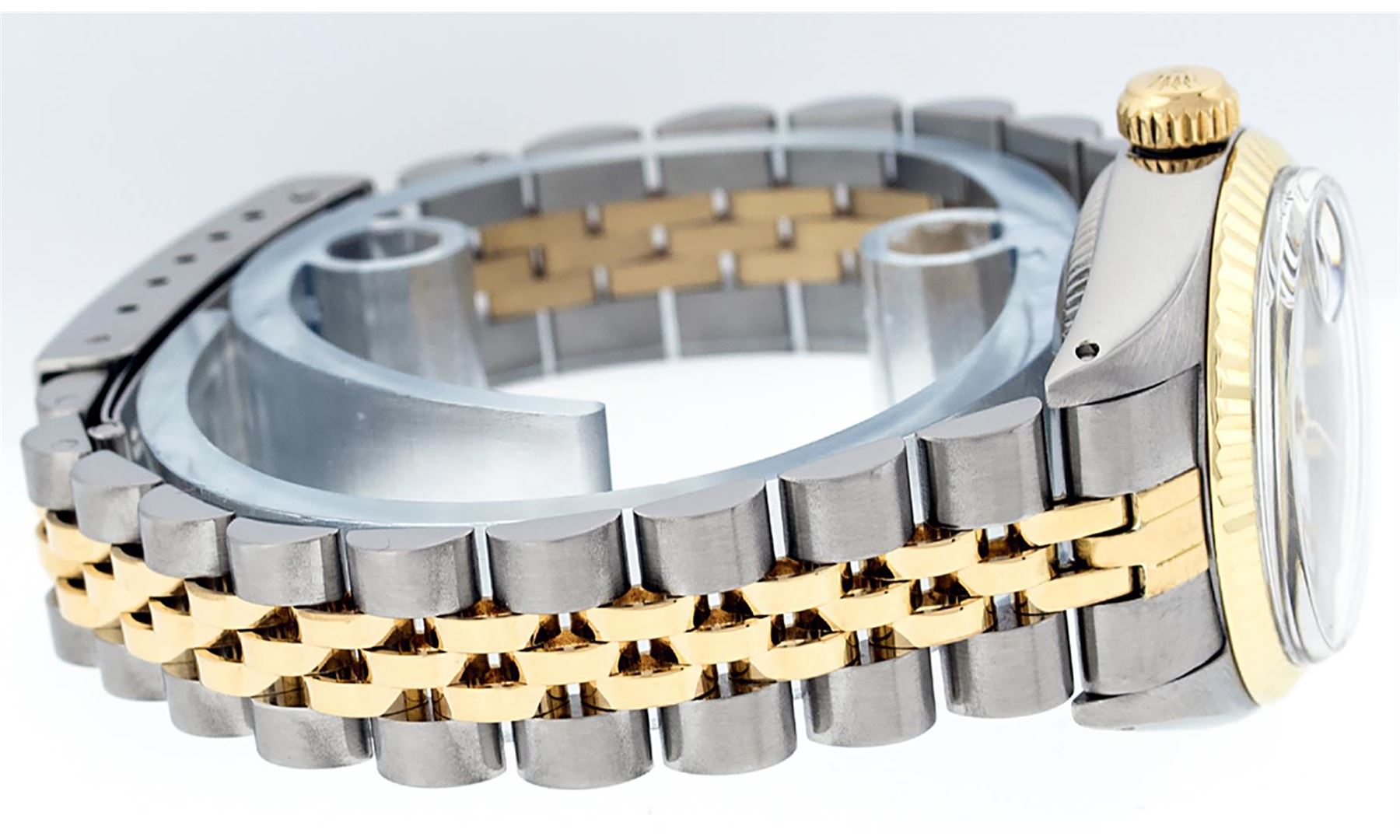One Ladies Pre Owned Two Tone 14K Yellow Gold And Stainless Steel Rolex Polished, Serviced & Electronically Tested, Rolex 14K Yellow Gold & Stainless Steel Case: 26mm, Rolex Yellow Gold Crown, Rolex Bezel: 14K Yellow Gold Fluted Bezel. Custom Crystal: Plexiglass With Date Window. Hands: Luminescent Hands. Rolex Movement: Automatic Winding Movement 2030. Rolex Dial: White Index With Dash Track & Lumi Dots. Date Window: 3 O'Clock Position Date Display, Model: Datejust. Condition: G-6 Extra Fine. Rolex Bracelet: Two Tone 14K Yellow Gold & Stainless Steel Jubilee Band. Bright Polish. 6.0 Inch Length, Adjustable. Standard Clasp, With Rolex Logo. This Watch Has Been Serviced Time Tested And Is In Excellent Condition It Is Free Of All Scratches And Dents.
