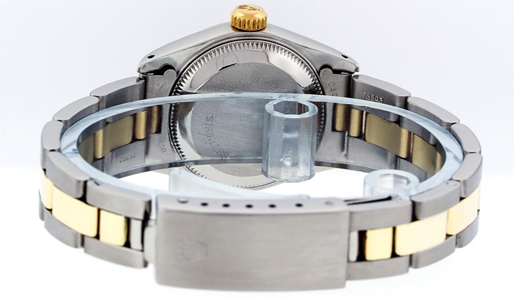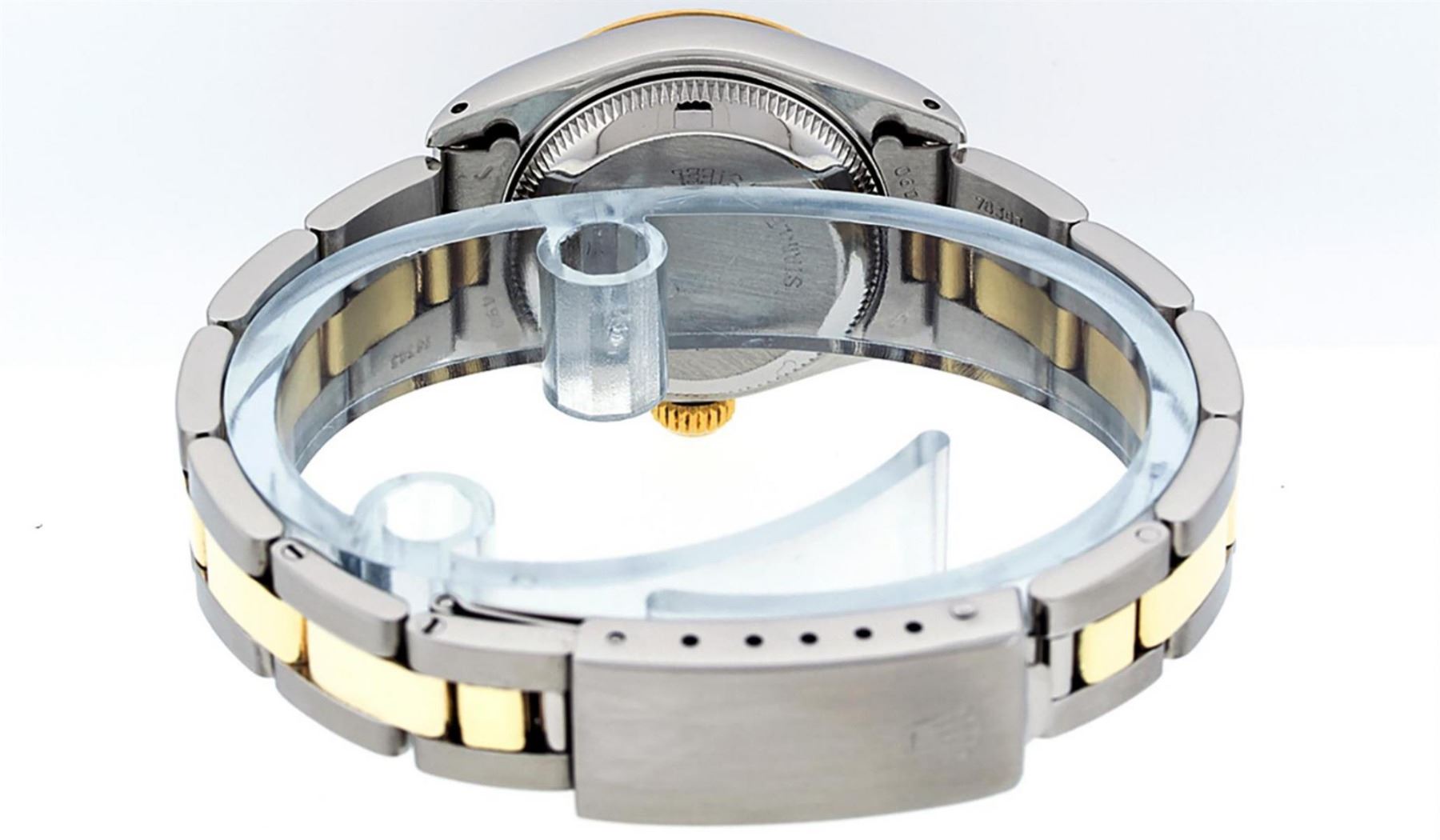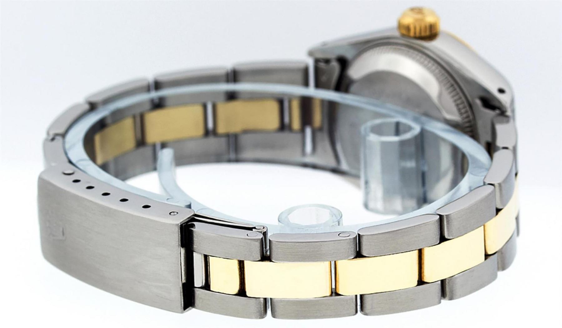 One Ladies Yellow Gold & Stainless Steel Two Tone Rolex Datejust Polished, Serviced & Electronically Tested, Yellow Gold & Stainless Steel Case: 26mm, Yellow Gold Crown, Bezel: Yellow Gold Fluted Bezel. Custom Crystal: New Acrylic Cyclops Lens. Custom Hands: New Luminescent Hands. Movement: Automatic Winding Movement. Custom Dial: White Roman With Square Track. Date Window: 3 O'Clock Position Date Display, Model: Datejust. Condition: G-6 Extra Fine. Bracelet: Two Tone Yellow Gold & Stainless Steel Oyster Band. Bright Polish. 6.0 Inch Length, Adjustable. Standard Clasp, With Rolex Logo. This Watch Has Been Serviced Time Tested And Is In Excellent Condition It Is Free Of All Scratches And Dents.