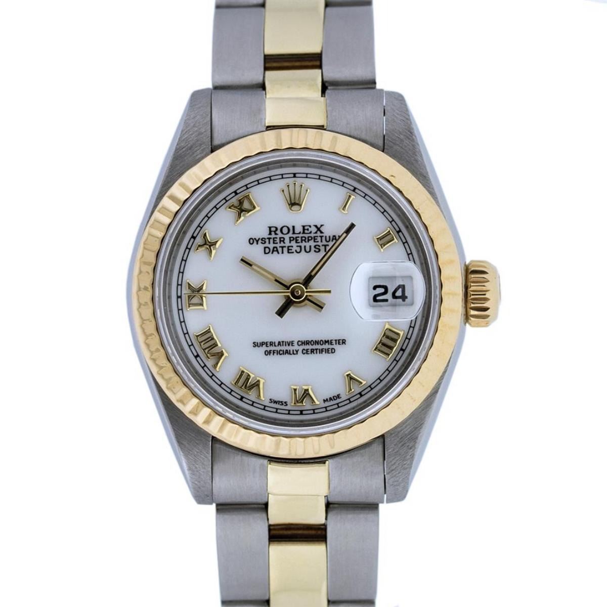 One Ladies Yellow Gold & Stainless Steel Two Tone Rolex Datejust Polished, Serviced & Electronically Tested, Yellow Gold & Stainless Steel Case: 26mm, Yellow Gold Crown, Bezel: Yellow Gold Fluted Bezel. Custom Crystal: New Acrylic Cyclops Lens. Custom Hands: New Luminescent Hands. Movement: Automatic Winding Movement. Custom Dial: White Roman With Square Track. Date Window: 3 O'Clock Position Date Display, Model: Datejust. Condition: G-6 Extra Fine. Bracelet: Two Tone Yellow Gold & Stainless Steel Oyster Band. Bright Polish. 6.0 Inch Length, Adjustable. Standard Clasp, With Rolex Logo. This Watch Has Been Serviced Time Tested And Is In Excellent Condition It Is Free Of All Scratches And Dents.