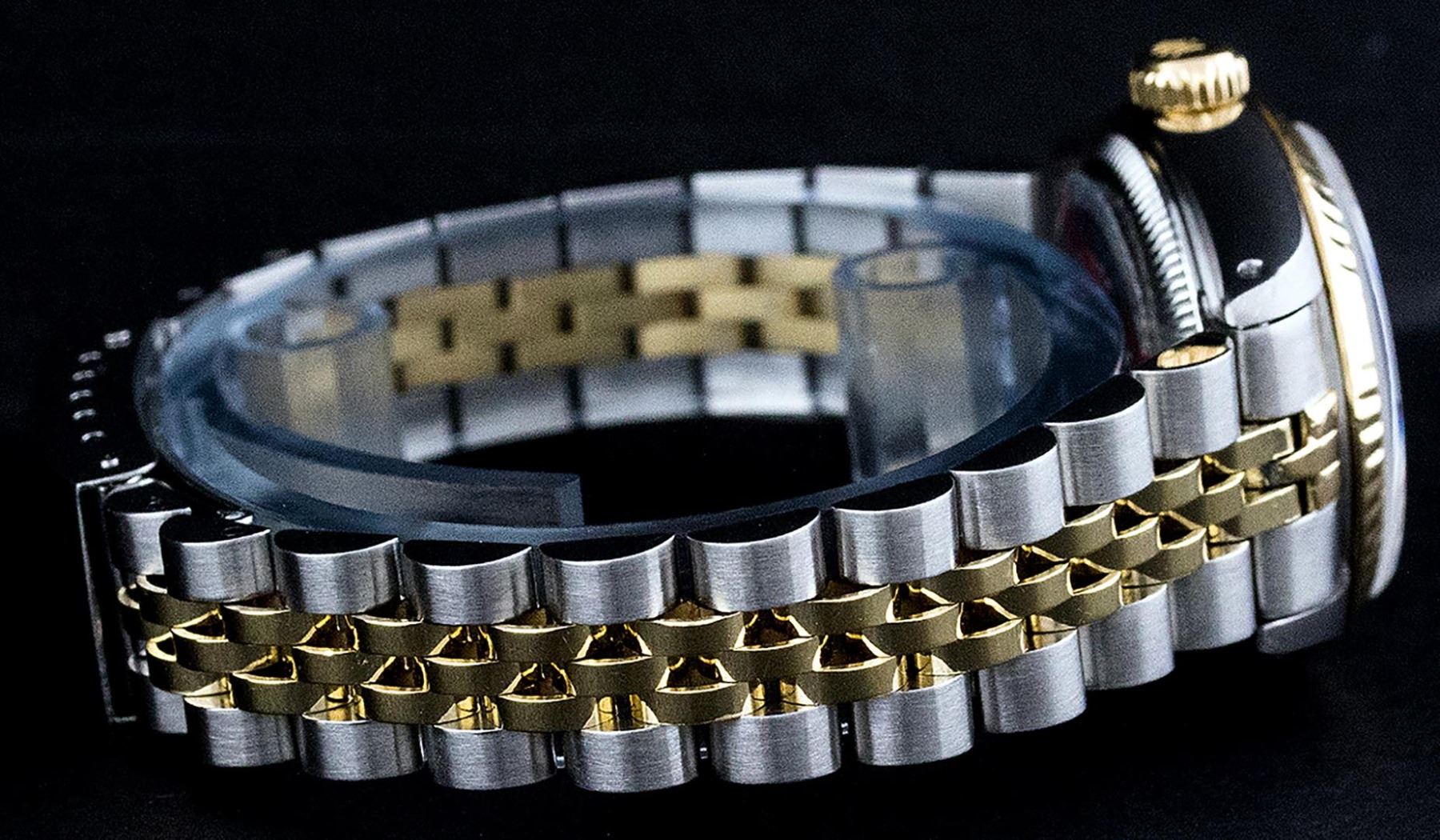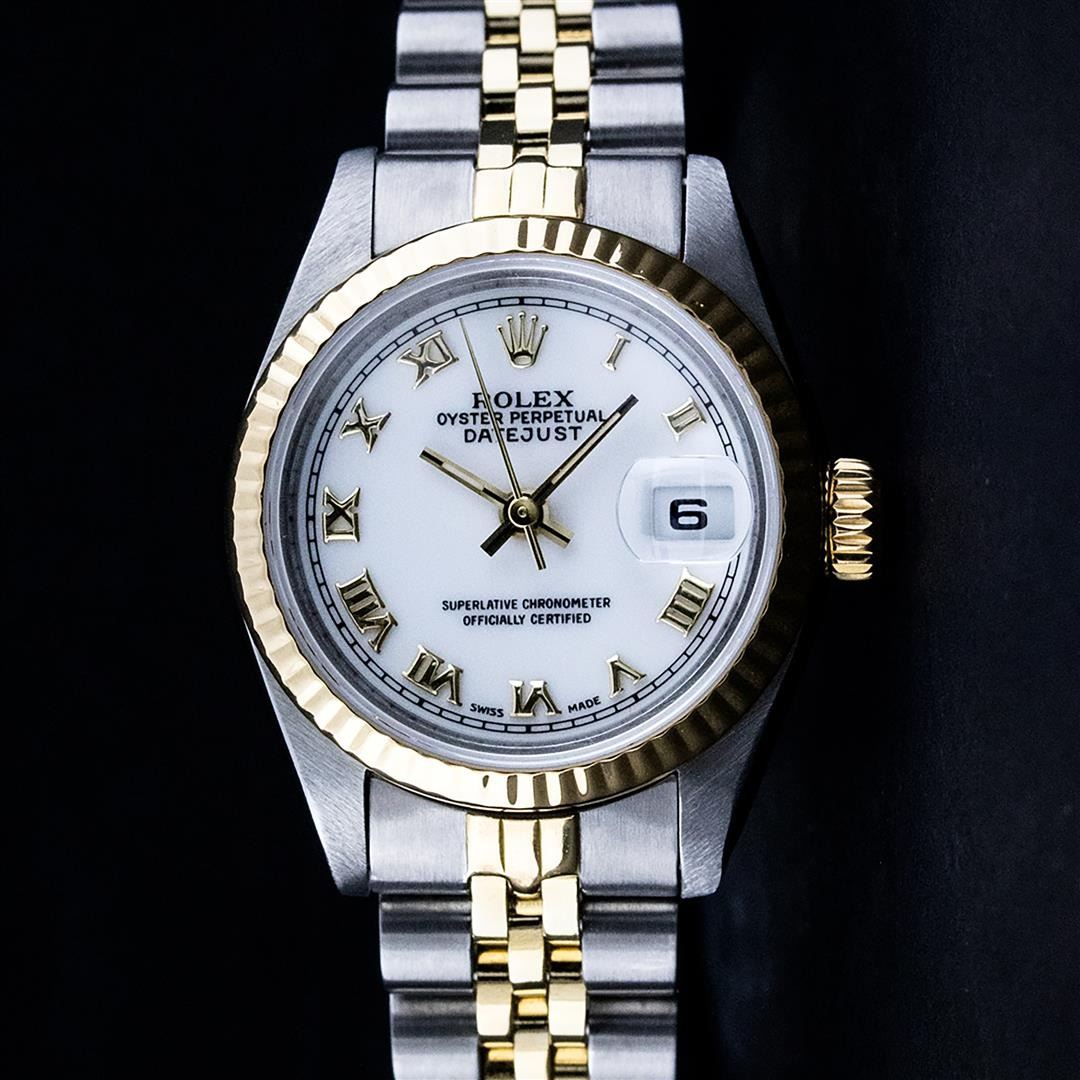 One Ladies Pre Owned Two Tone 14K Yellow Gold & Stainless Steel Rolex Datejust Polished, Serviced & Electronically Tested, Yellow Gold & Stainless Steel Case: 26mm, Yellow Gold Crown, Bezel: 14K Yellow Gold Fluted Bezel. Custom Crystal: New Plexiglass With Date Window. Hands: Luminescent Hands. Rolex Movement: Automatic Winding Movement 2030. Rolex Dial: White Roman With Square Track. Date Window: 3 O'Clock Position Date Display, Model: Datejust. Condition: G-6 Extra Fine. Bracelet: Two Tone 14K Yellow Gold & Stainless Steel Jubilee Band. Bright Polish. 6.0 Inch Length, Adjustable. Standard Clasp, With Rolex Logo. This Watch Has Been Serviced Time Tested And Is In Excellent Condition It Is Free Of All Scratches And Dents.