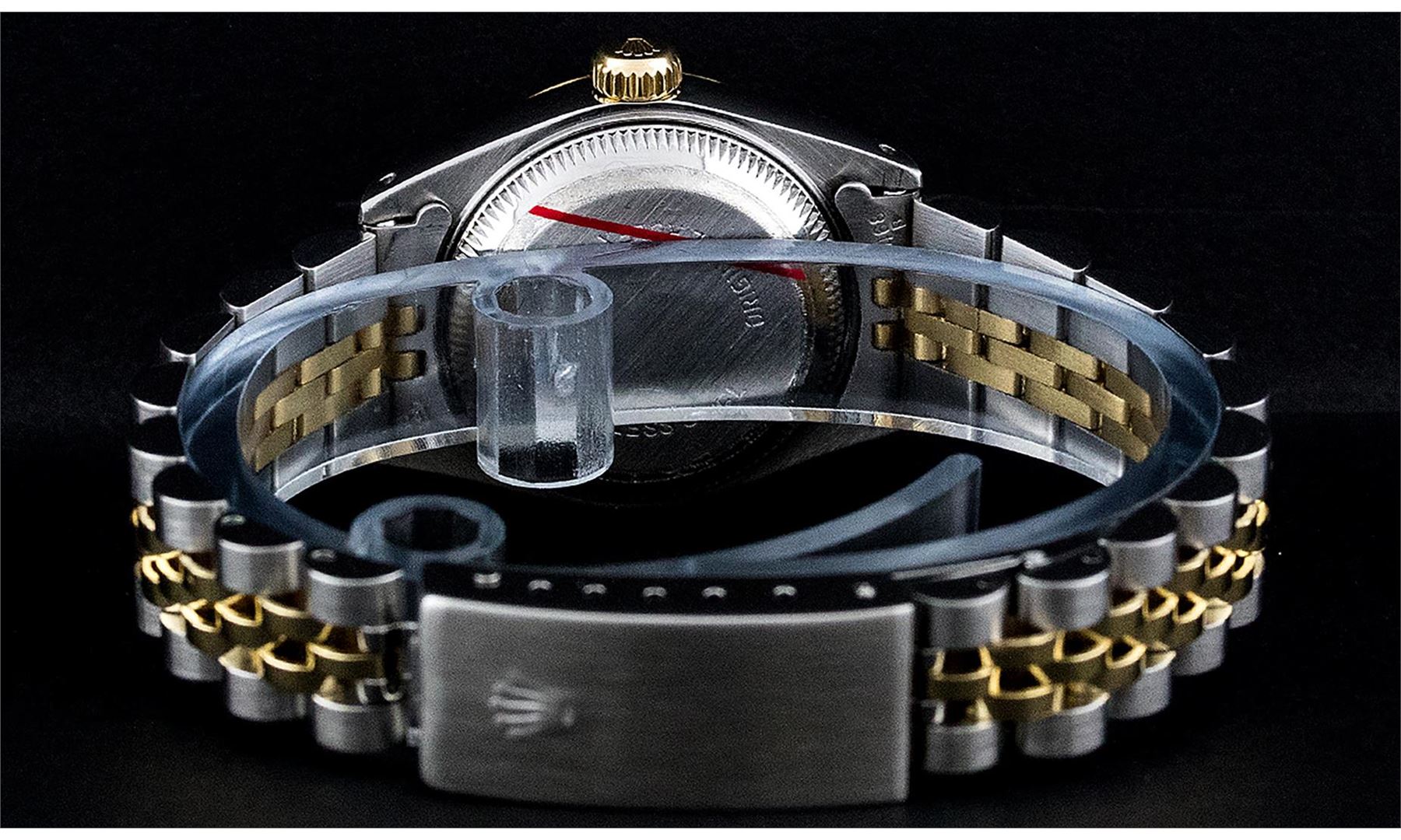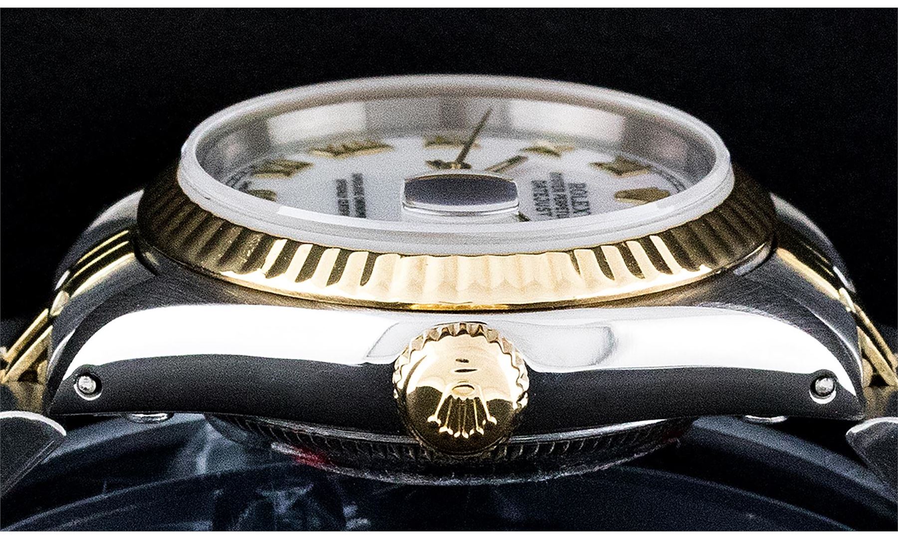 One Ladies Pre Owned Two Tone 14K Yellow Gold & Stainless Steel Rolex Datejust Polished, Serviced & Electronically Tested, Yellow Gold & Stainless Steel Case: 26mm, Yellow Gold Crown, Bezel: 14K Yellow Gold Fluted Bezel. Custom Crystal: New Plexiglass With Date Window. Hands: Luminescent Hands. Rolex Movement: Automatic Winding Movement 2030. Rolex Dial: White Roman With Square Track. Date Window: 3 O'Clock Position Date Display, Model: Datejust. Condition: G-6 Extra Fine. Bracelet: Two Tone 14K Yellow Gold & Stainless Steel Jubilee Band. Bright Polish. 6.0 Inch Length, Adjustable. Standard Clasp, With Rolex Logo. This Watch Has Been Serviced Time Tested And Is In Excellent Condition It Is Free Of All Scratches And Dents.