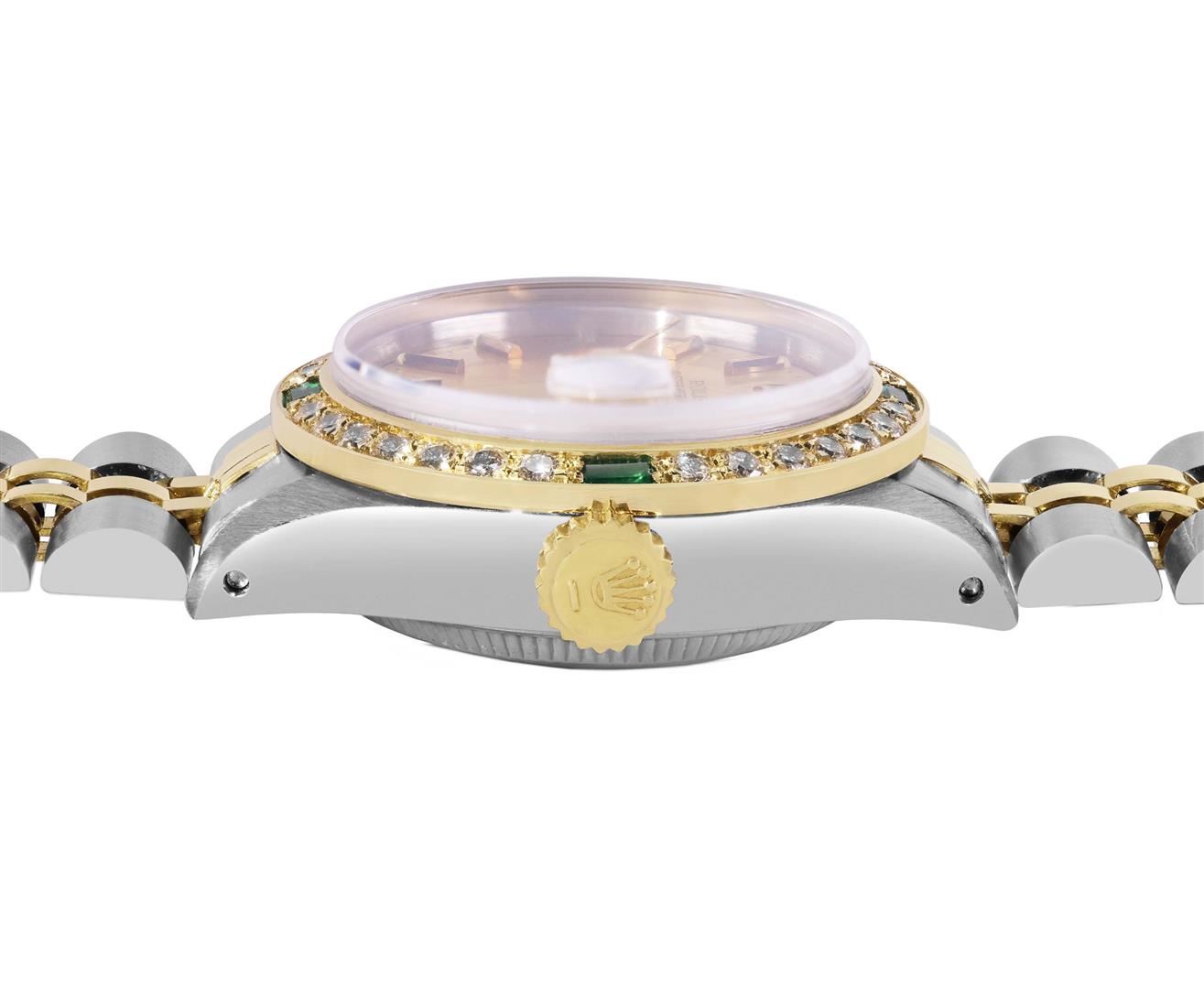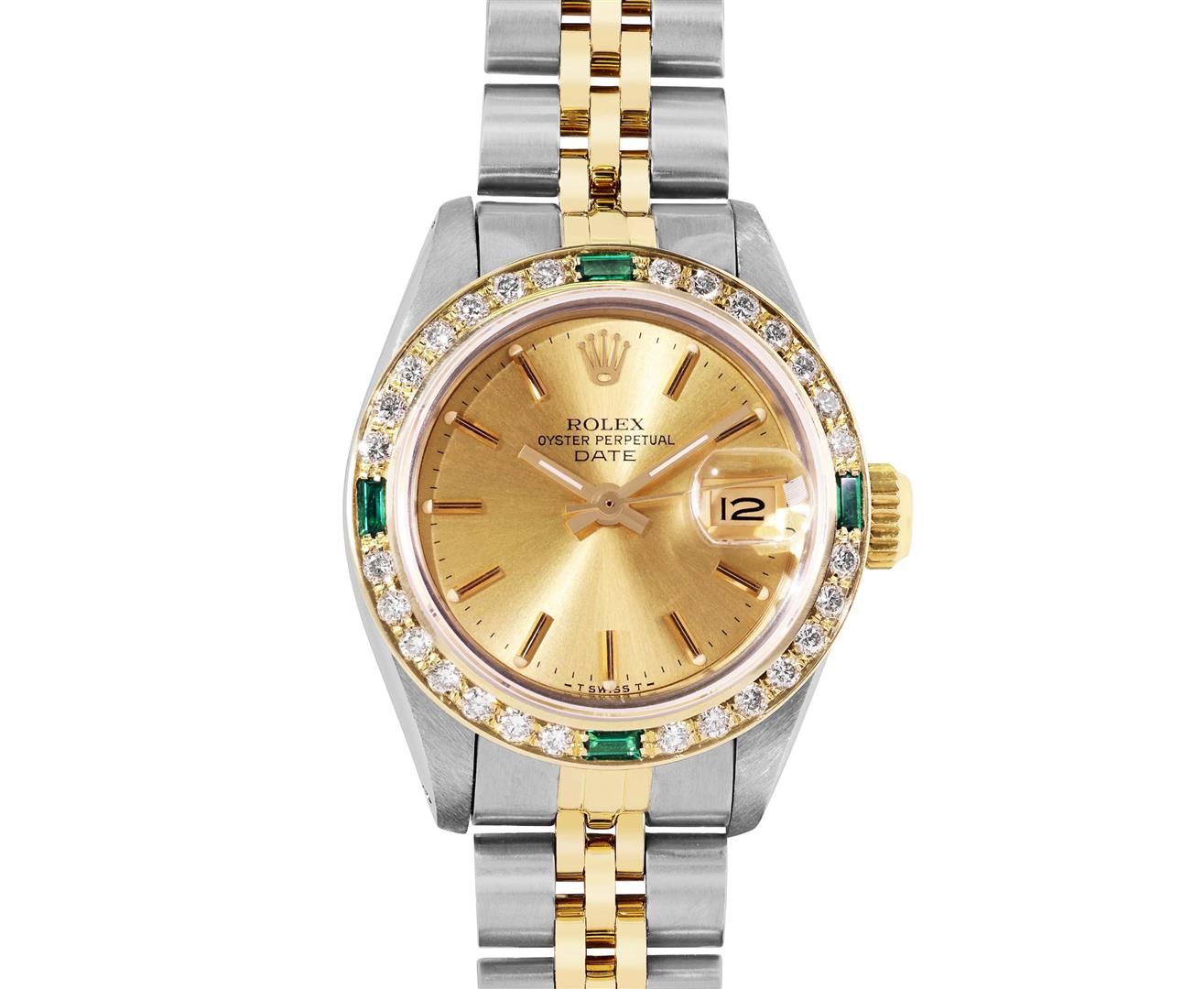 One Rolex Ladies Pre Owned Two Tone Yellow Gold & Stainless Steel Rolex Date Watch Polished, Serviced & Electronically Tested, Rolex Yellow Gold & Stainless Steel Case: 26mm, Rolex Yellow Gold Crown. Custom Bezel: New 18K Yellow Gold Emerald Beadset Diamond Bezel, Diamond + Gem Count: 36 Diamonds + 4 Emeralds, Clarity: SI-VS, Color: G to H. Custom Crystal: New Sapphire Crystal With Date Window. Custom Hands: New Luminescent Hands. Rolex Movement: Automatic Winding Movement 2030. Rolex Factory Dial: Champagne Dial With Baton Index Markers And Dash Track. Date Window: 3 O'Clock Position Date Display, Condition: G-6 Extra Fine. Rolex Bracelet: Two Tone 14K Yellow Gold & Stainless Steel Jubilee Band. Bright Polish & Satin Finish. 6.0 Inch Length, Adjustable. Standard Clasp, With Rolex Logo. This Watch Has Been Serviced Time Tested And Is In Excellent Condition It Is Free Of All Scratches And Dents. This Watch Comes With A Rolex Box.