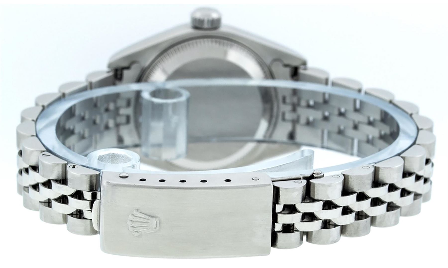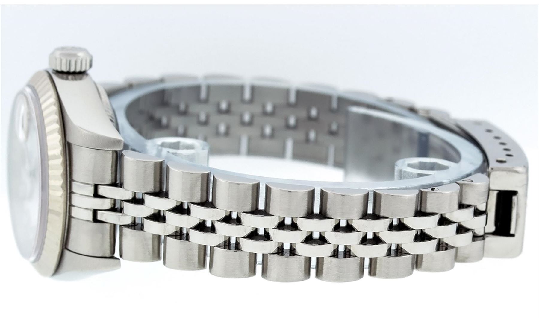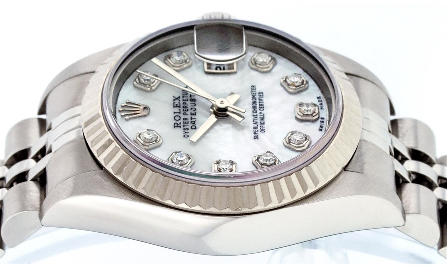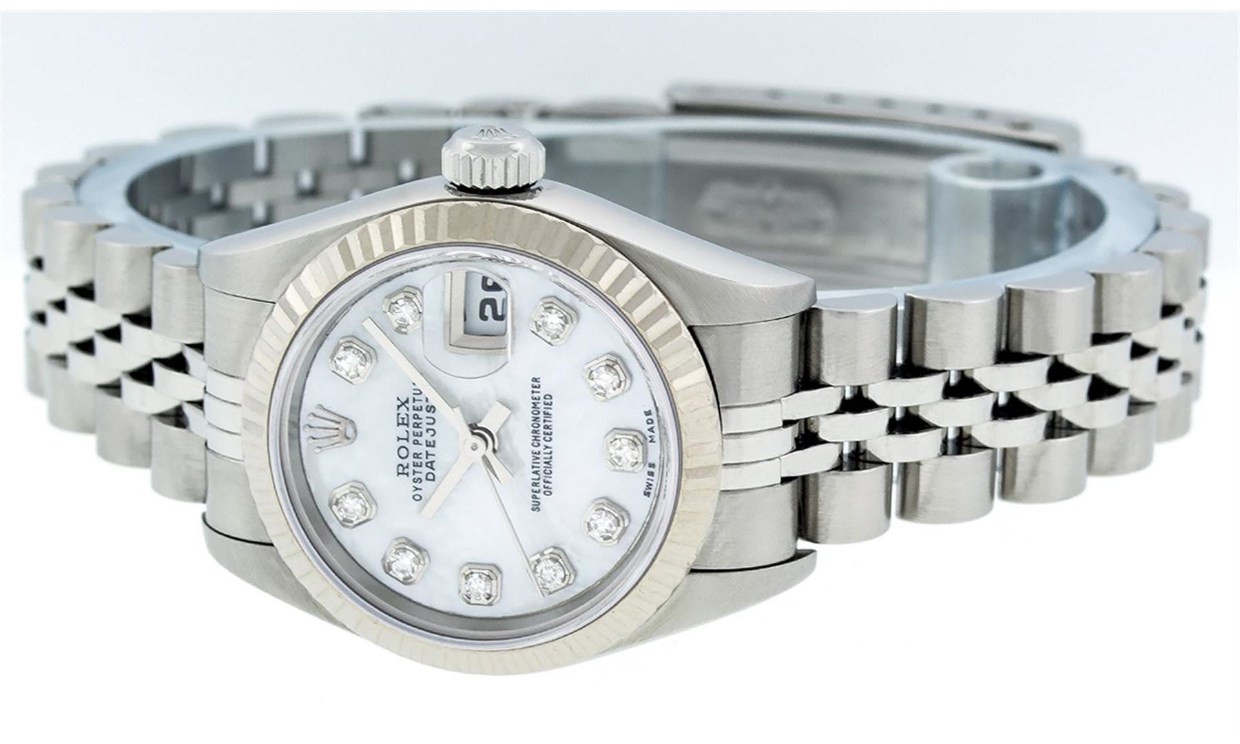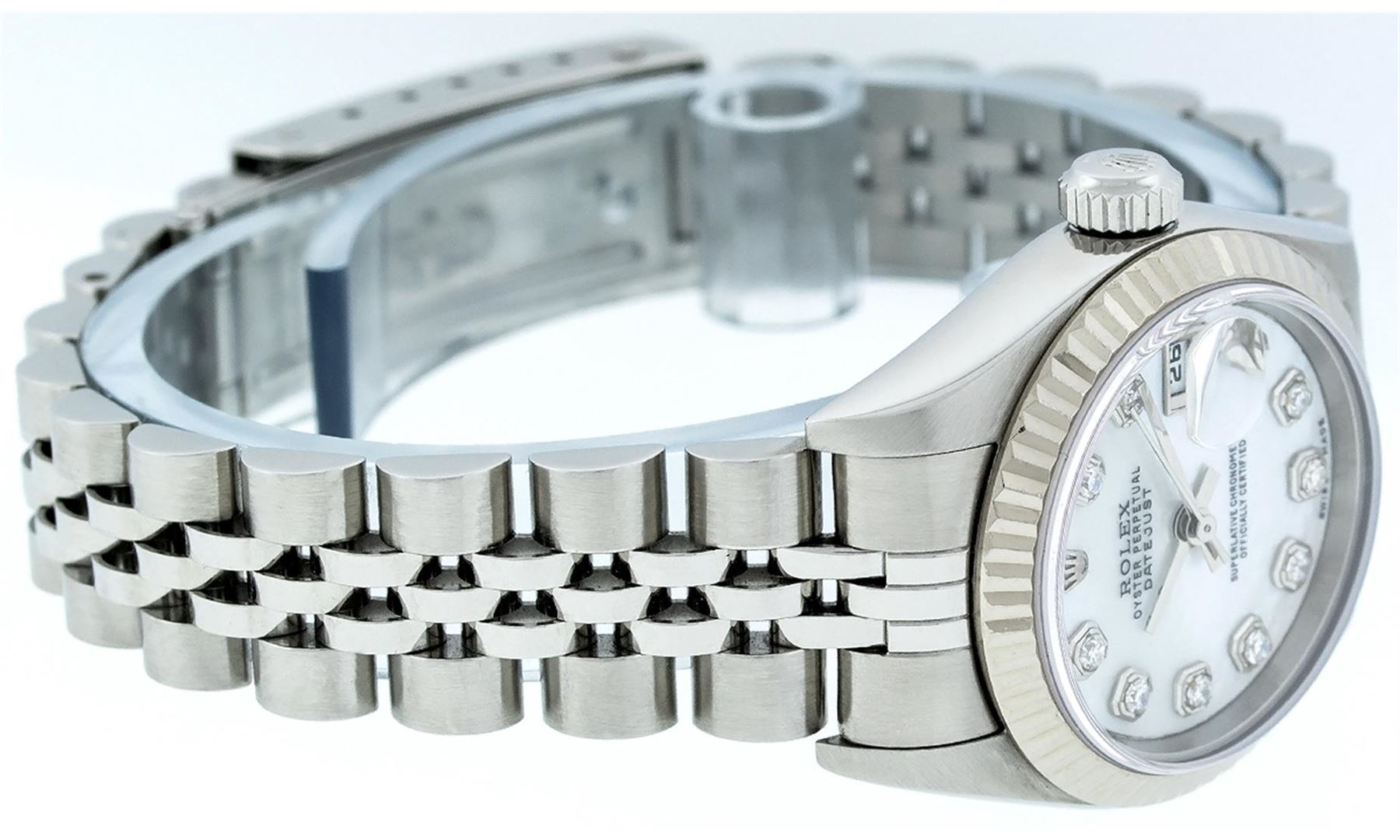 One Ladies Rolex Datejust Polished Bright with Satin Finish, Serviced & Electronically Tested, Stainless Steel Case:26mm, Stainless Steel Crown, Bezel: 18K White Gold Fluted Bezel. Custom Crystal: New Synthetic Sapphire Cyclops Lens. Movement: Automatic Winding Movement Caliber 2235. Custom Dial: Mother Of Pearl Diamond Dial, Diamond Count: 10 Diamonds In Dial, Color: G To H, Clarity: SI-VS. Date Window: 3 O'Clock Position Date Display, Model: No Hole Datejust 79174 Quickset. Condition: G-6 Extra Fine. Bracelet: Stainless Steel Jubilee Band. Bright Polish & Satin Finish. 6.0 Inch Length, Adjustable. Standard Clasp, With Rolex Logo.