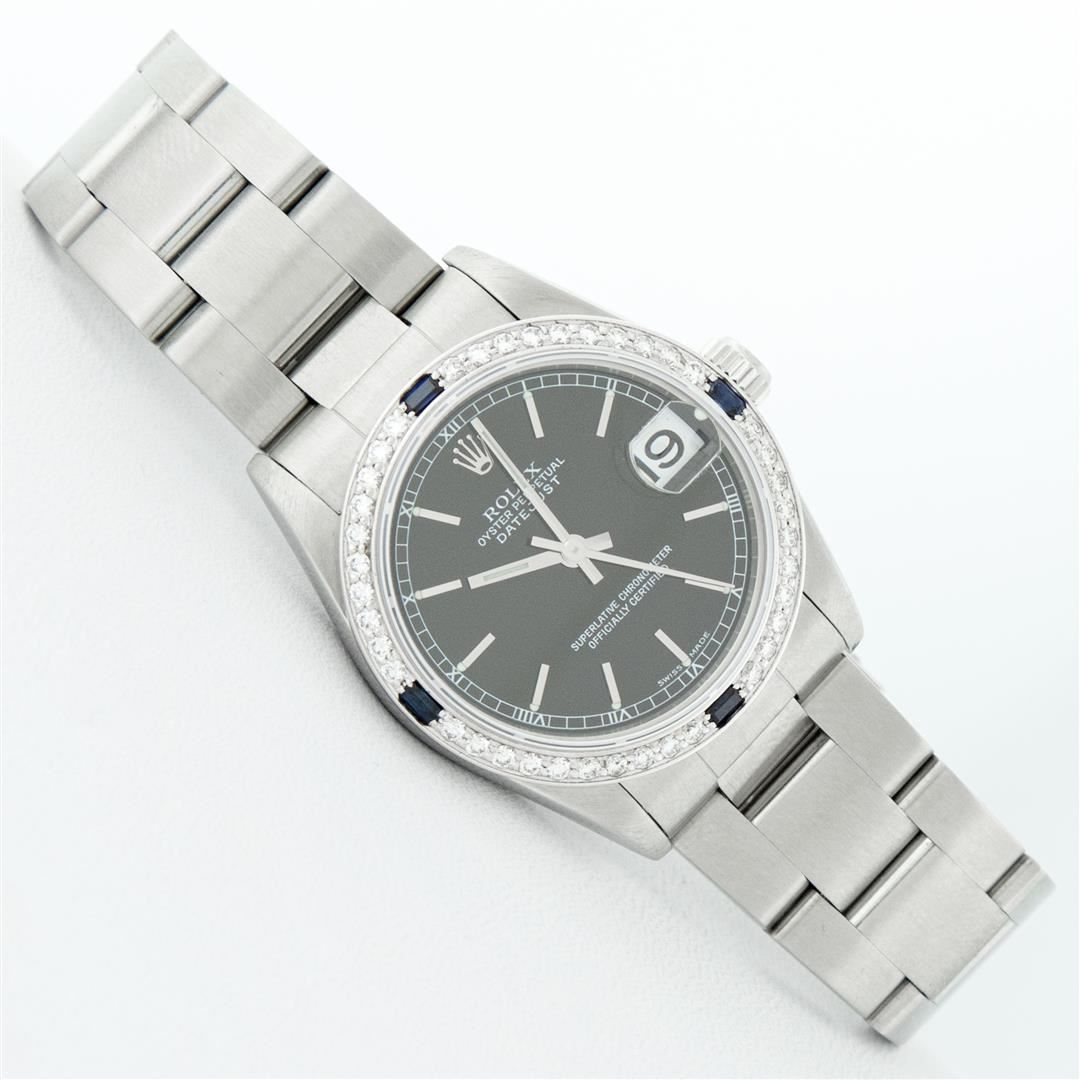 One Women's Midsize Stainless Steel Rolex Datejust Polished, Serviced & Electronically Tested, Rolex Stainless Steel Case Case: 31mm, Rolex Stainless Steel Crown, Custom Bezel: New 18K White Gold Sapphire Beadset Diamond Bezel, Diamond Count: 40 Diamonds + 4 Sapphires On Bezel, Color: G To H, Clarity: VS2-SI1. Custom Crystal: New Sapphire With Magnified Date Window. Custom Hands: New Luminescent Hands. Rolex Movement: Automatic Winding Movement 2235. Rolex Dial: Black Index Dial With Square Roman Track, Date Window: 3 O'Clock Position Date Display, Quickset, Model: Midsize Quickset Datejust. Condition: G-6 Extra Fine. Rolex Bracelet: Stainless Steel Oyster Band. Bright Polish. 6.0 Inch Length, Adjustable. Standard Clasp, With Rolex Logo. This Pre Owned Watch Has Been Serviced Time Tested And Is In Excellent Condition It Is Free Of All Scratches And Dents.