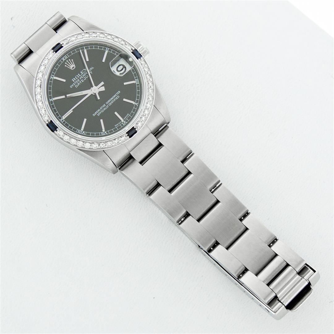 One Women's Midsize Stainless Steel Rolex Datejust Polished, Serviced & Electronically Tested, Rolex Stainless Steel Case Case: 31mm, Rolex Stainless Steel Crown, Custom Bezel: New 18K White Gold Sapphire Beadset Diamond Bezel, Diamond Count: 40 Diamonds + 4 Sapphires On Bezel, Color: G To H, Clarity: VS2-SI1. Custom Crystal: New Sapphire With Magnified Date Window. Custom Hands: New Luminescent Hands. Rolex Movement: Automatic Winding Movement 2235. Rolex Dial: Black Index Dial With Square Roman Track, Date Window: 3 O'Clock Position Date Display, Quickset, Model: Midsize Quickset Datejust. Condition: G-6 Extra Fine. Rolex Bracelet: Stainless Steel Oyster Band. Bright Polish. 6.0 Inch Length, Adjustable. Standard Clasp, With Rolex Logo. This Pre Owned Watch Has Been Serviced Time Tested And Is In Excellent Condition It Is Free Of All Scratches And Dents.