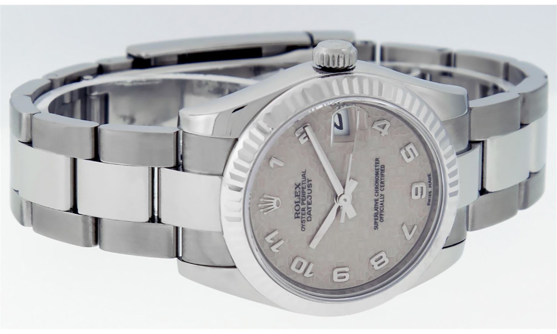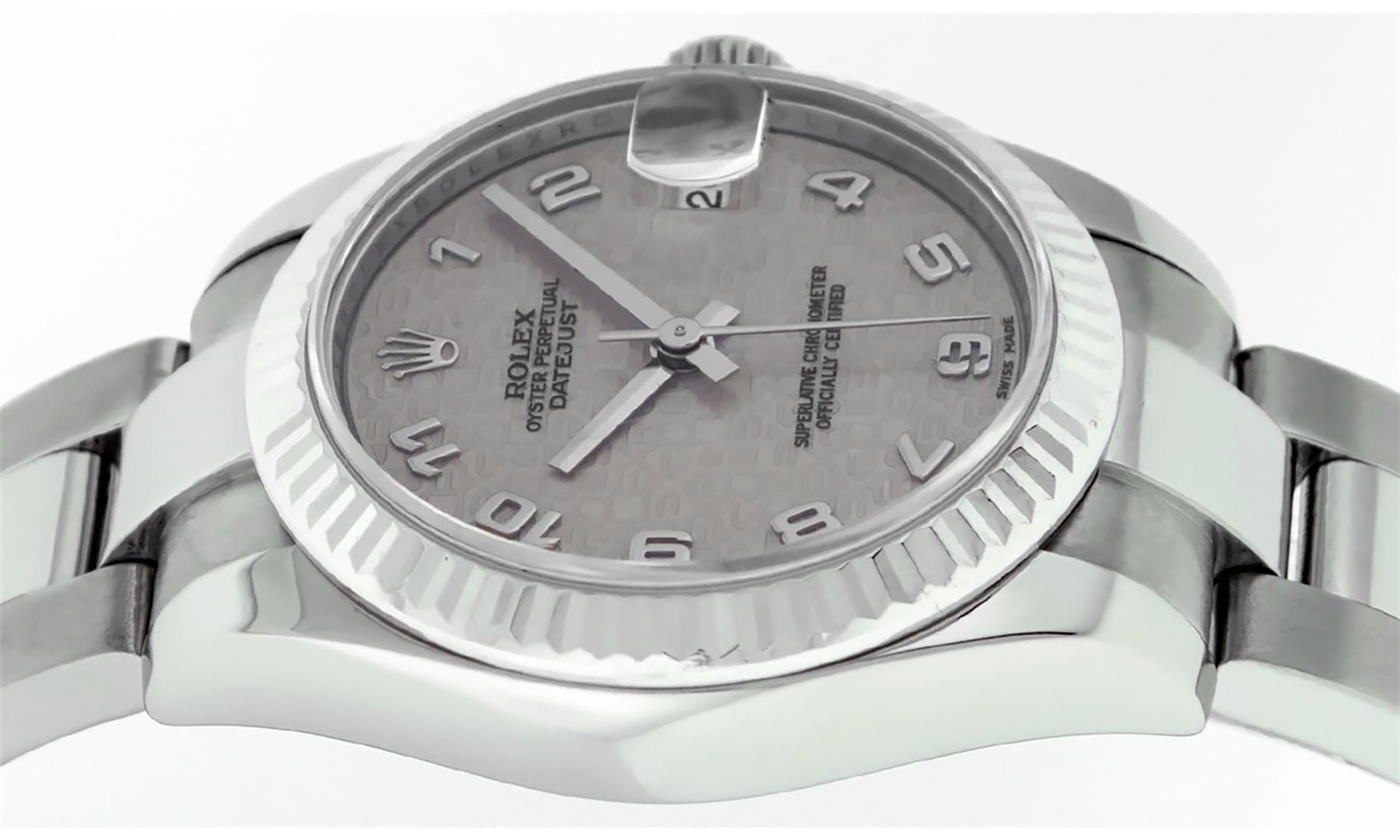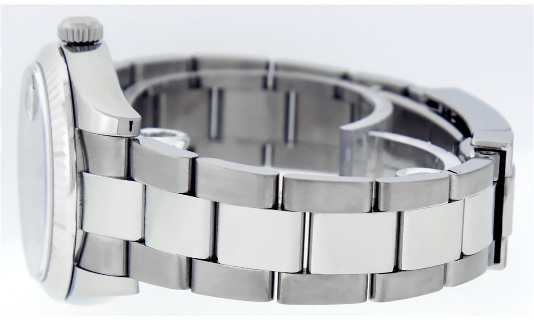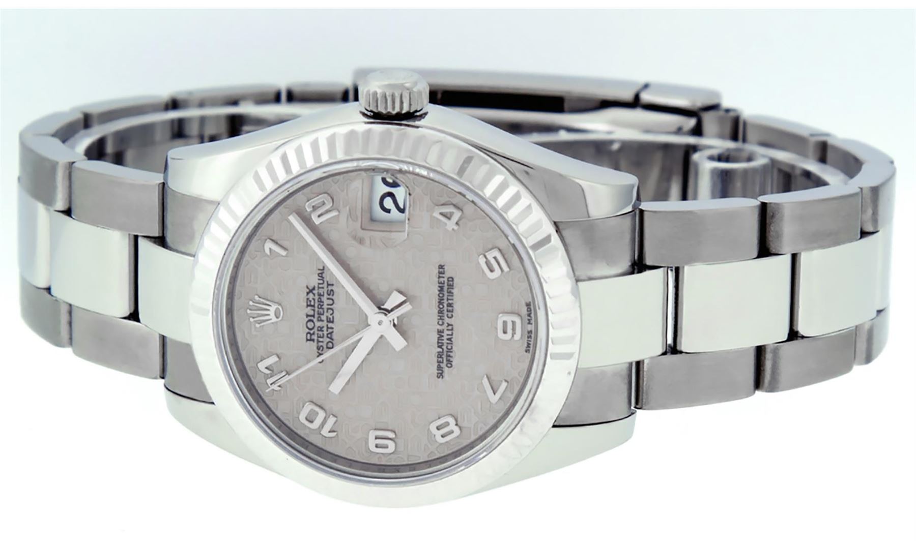 One Womens Midsize Stainless Steel Rolex Datejust Polished, Serviced & Electronically Tested, Rolex Stainless Steel Case Case: 31mm, Rolex Stainless Steel Crown, Rolex Bezel: 18K White Gold Fluted Bezel, Crystal: Sapphire With Cyclops Lens. Hands: White Hands. Rolex Movement: Automatic Winding Movement Caliber 2235. Rolex Dial: Cream Jubilee Dial With Arabic Hour Markers, Date Window: 3 O'Clock Position Date Display, Quickset, Model: Midsize Datejust. Condition: G-6 Extra Fine. Rolex Bracelet: Stainless Steel Oyster Band. Bright Polish. 6.0 Inch Length, Adjustable. Standard Clasp, With Rolex Logo. This Pre Owned Watch Has Been Serviced Time Tested And Is In Excellent Condition It Is Free Of All Scratches And Dents.