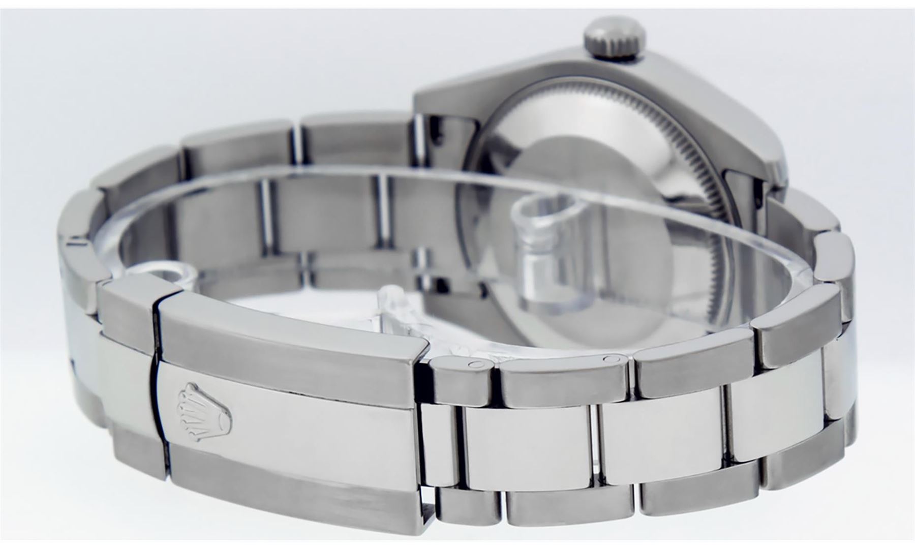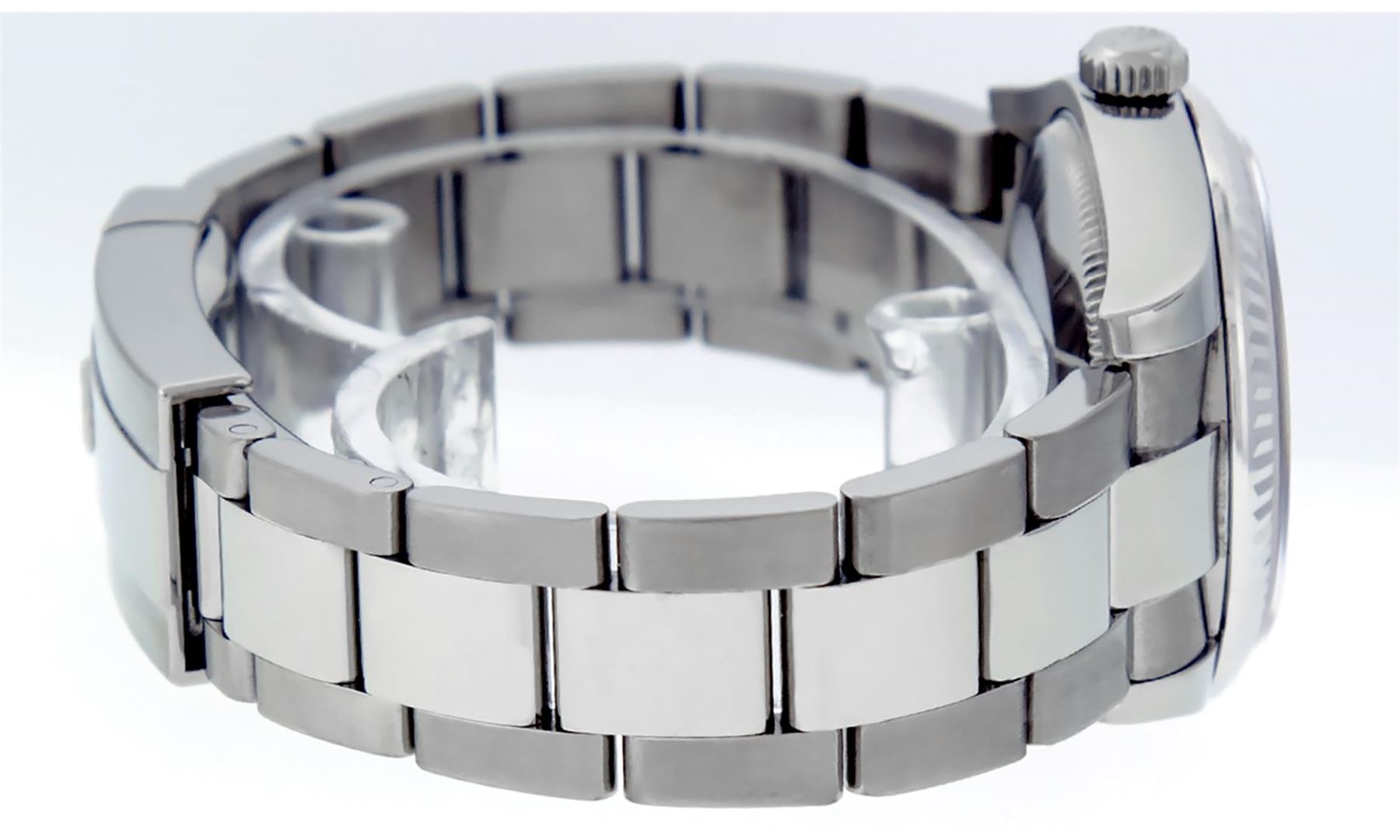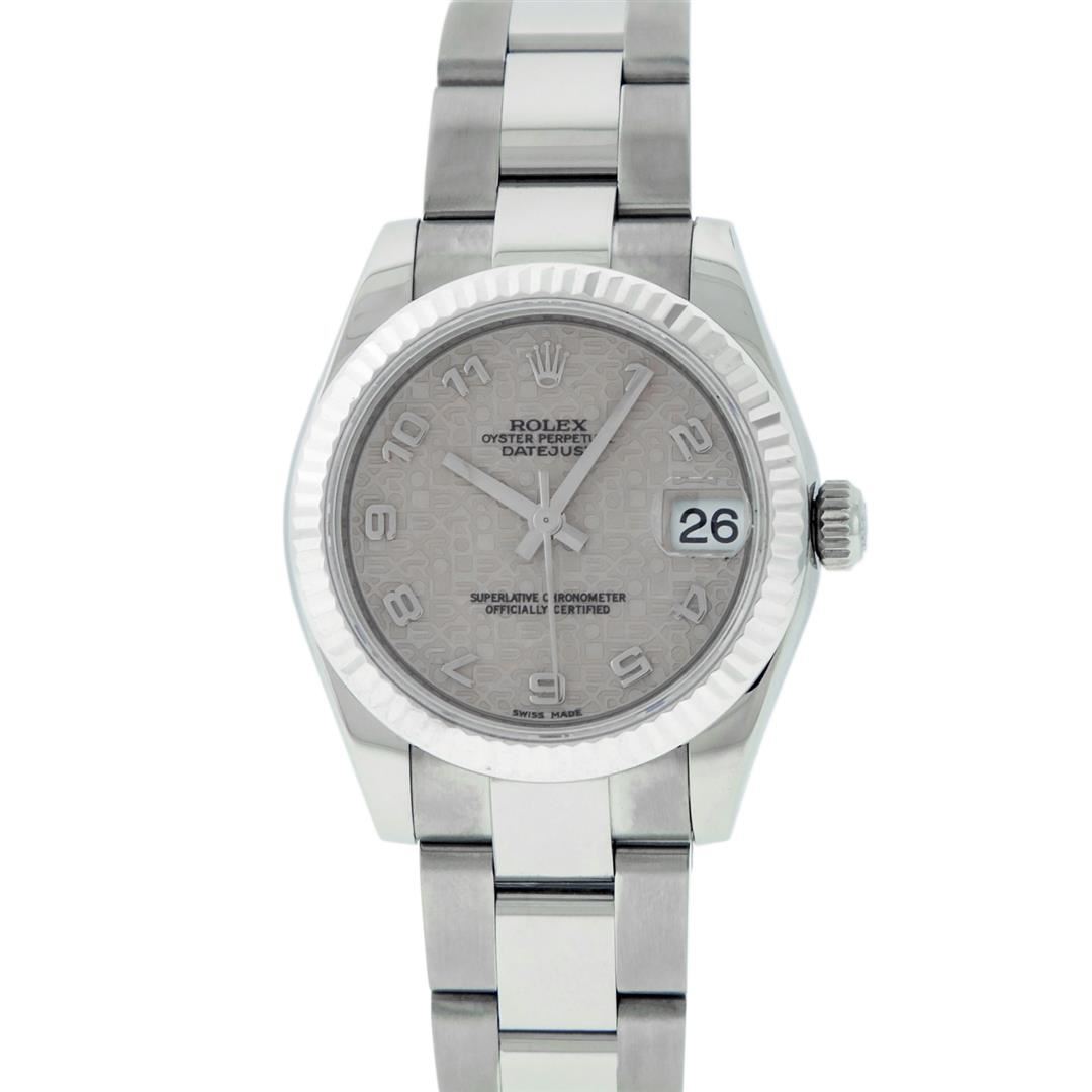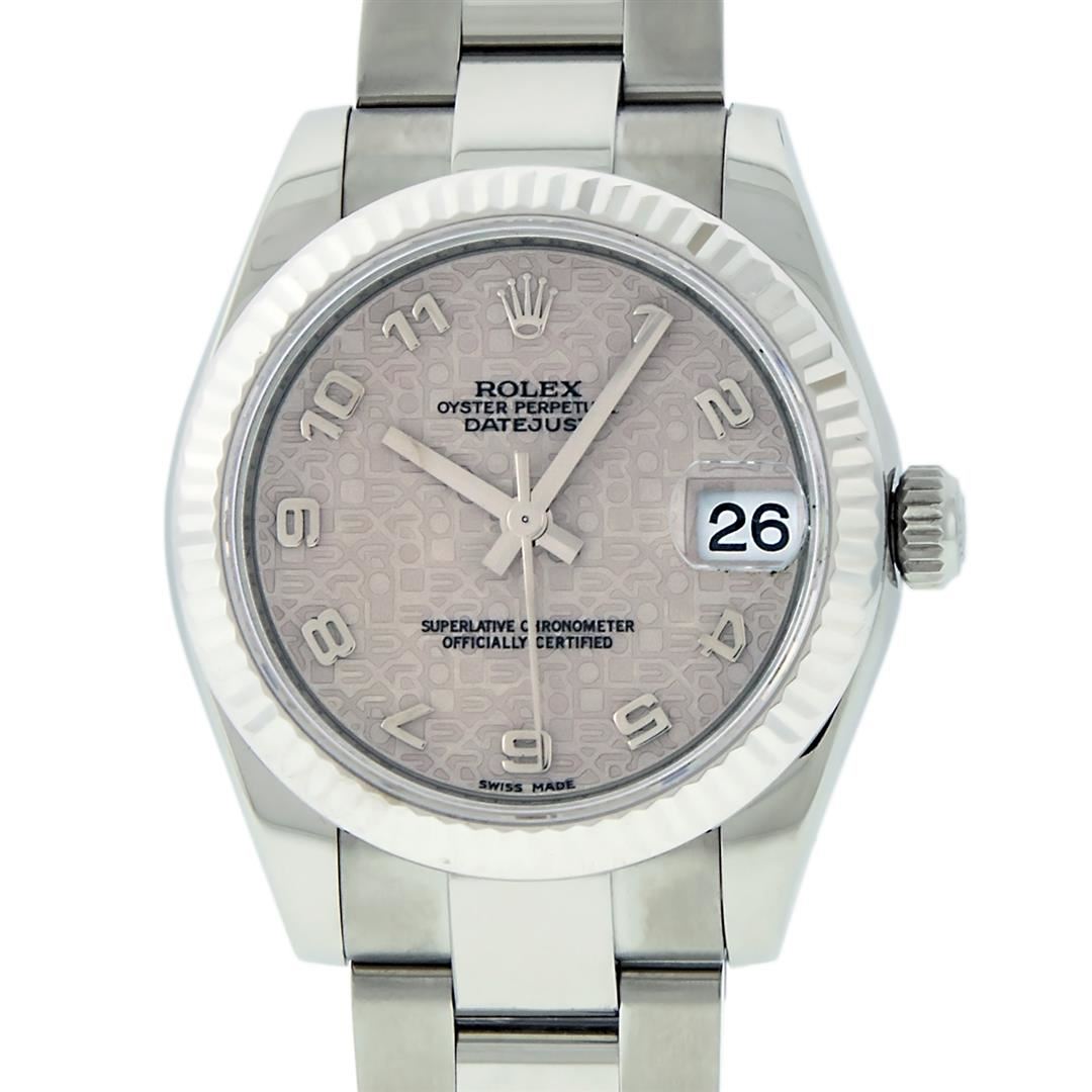 One Womens Midsize Stainless Steel Rolex Datejust Polished, Serviced & Electronically Tested, Rolex Stainless Steel Case Case: 31mm, Rolex Stainless Steel Crown, Rolex Bezel: 18K White Gold Fluted Bezel, Crystal: Sapphire With Cyclops Lens. Hands: White Hands. Rolex Movement: Automatic Winding Movement Caliber 2235. Rolex Dial: Cream Jubilee Dial With Arabic Hour Markers, Date Window: 3 O'Clock Position Date Display, Quickset, Model: Midsize Datejust. Condition: G-6 Extra Fine. Rolex Bracelet: Stainless Steel Oyster Band. Bright Polish. 6.0 Inch Length, Adjustable. Standard Clasp, With Rolex Logo. This Pre Owned Watch Has Been Serviced Time Tested And Is In Excellent Condition It Is Free Of All Scratches And Dents.
