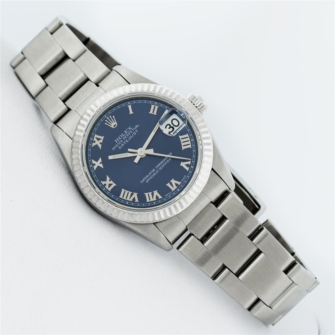 One Women's Rolex Midsize Stainless Steel Datejust Polished, Serviced & Electronically Tested, Rolex Stainless Steel Case Case: 31mm, Rolex Stainless Steel Crown, Rolex Bezel: 18K White Gold Fluted Bezel, Crystal: Sapphire With Cyclops Lens. Hands: Lumi Hands. Rolex Movement: Automatic Winding Movement 2235. Rolex Dial: Factory Blue Dial With Roman Hour Markers And Square Track. Date Window: 3 O'Clock Position Date Display, Quickset, Model: Midsize Quickset Datejust. Condition: G-6 Extra Fine. Rolex Bracelet: Stainless Steel Oyster Band. Bright Polish. 6.0 Inch Length, Adjustable. Standard Clasp, With Rolex Logo. This Pre Owned Watch Has Been Serviced Time Tested And Is In Excellent Condition It Is Free Of All Scratches And Dents.