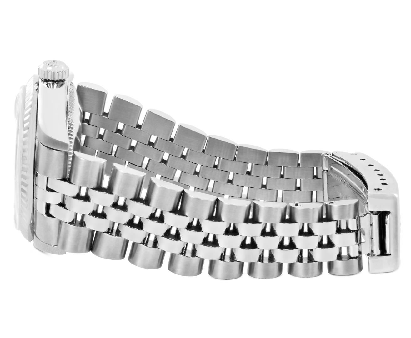One Rolex Ladies Sapphire Pre Owned Stainless Steel Datejust Wristwatch Polished with Satin Finish, Serviced & Electronically Tested, Stainless Steel Case: 31mm, Stainless Steel Crown, Bezel: 18K White Gold Fluted Bezel. Crystal: Sapphire With Magnifying Date Window. Hands: Luminescent Hands. Rolex Movement: Automatic Winding Movement 2235. Rolex Factory Dial: Silver With Index Hour Markers. Date Window: 3 O'Clock Position Date Display, Model: Quickset Datejust. Condition: G-6 Extra Fine. Rolex Bracelet: Stainless Steel Jubilee Band. Bright Polish And Satin Finish. 6.0 Inch Length, Adjustable. Standard Clasp, With Rolex Logo. This Watch Has Been Serviced Time Tested And Is In Excellent Condition It Is Free Of All Scratches And Dents.