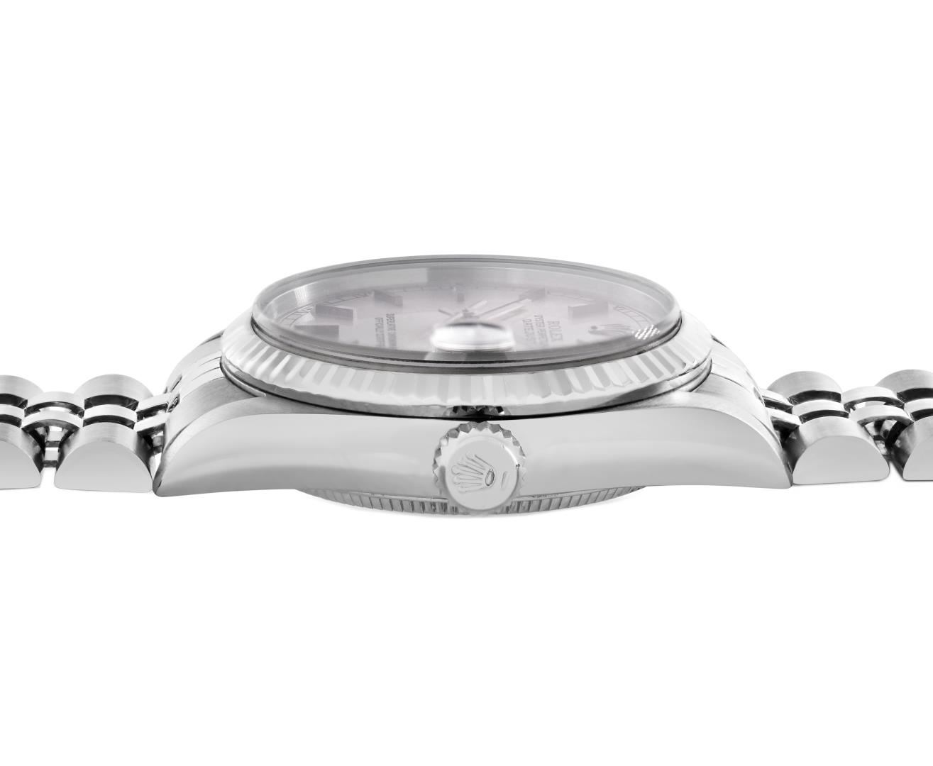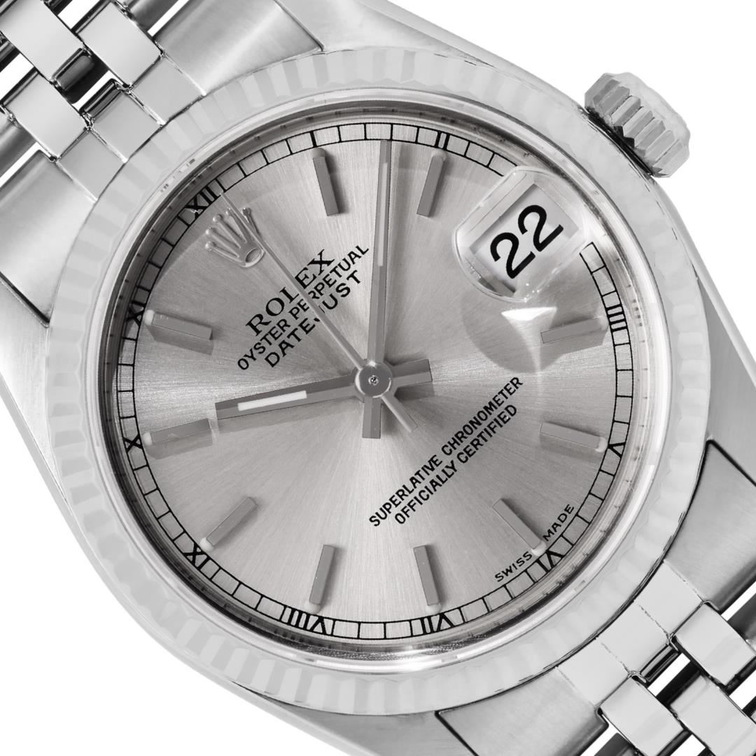 One Rolex Ladies Sapphire Pre Owned Stainless Steel Datejust Wristwatch Polished with Satin Finish, Serviced & Electronically Tested, Stainless Steel Case: 31mm, Stainless Steel Crown, Bezel: 18K White Gold Fluted Bezel. Crystal: Sapphire With Magnifying Date Window. Hands: Luminescent Hands. Rolex Movement: Automatic Winding Movement 2235. Rolex Factory Dial: Silver With Index Hour Markers. Date Window: 3 O'Clock Position Date Display, Model: Quickset Datejust. Condition: G-6 Extra Fine. Rolex Bracelet: Stainless Steel Jubilee Band. Bright Polish And Satin Finish. 6.0 Inch Length, Adjustable. Standard Clasp, With Rolex Logo. This Watch Has Been Serviced Time Tested And Is In Excellent Condition It Is Free Of All Scratches And Dents.