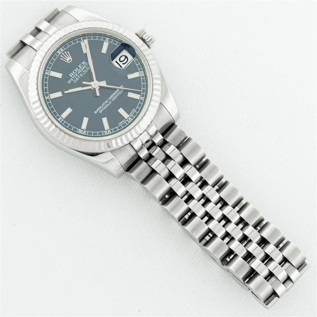 One Women's Midsize Stainless Steel Rolex Datejust Polished, Serviced & Electronically Tested, Stainless Steel Case Case: 31mm, Stainless Steel Crown, Bezel: 18K White Gold Fluted Bezel, Crystal: Sapphire With Magnified Date Window. Hands: Luminescent Hands. Rolex Movement: Automatic Winding Movement Caliber 2235. Rolex Dial: Blue Index Dial With Square Roman Track, Date Window: 3 O'Clock Position Date Display, Quickset, Model: Sapphire Quickset Midsize Datejust. Condition: G-6 Extra Fine. Rolex Bracelet: Stainless Steel Jubilee Band With Hidden Clasp. Bright Polish. 6.0 Inch Length, Adjustable. Hidden Clasp, With Rolex Logo. This Pre Owned Watch Has Been Serviced Time Tested And Is In Excellent Condition It Is Free Of All Scratches And Dents.