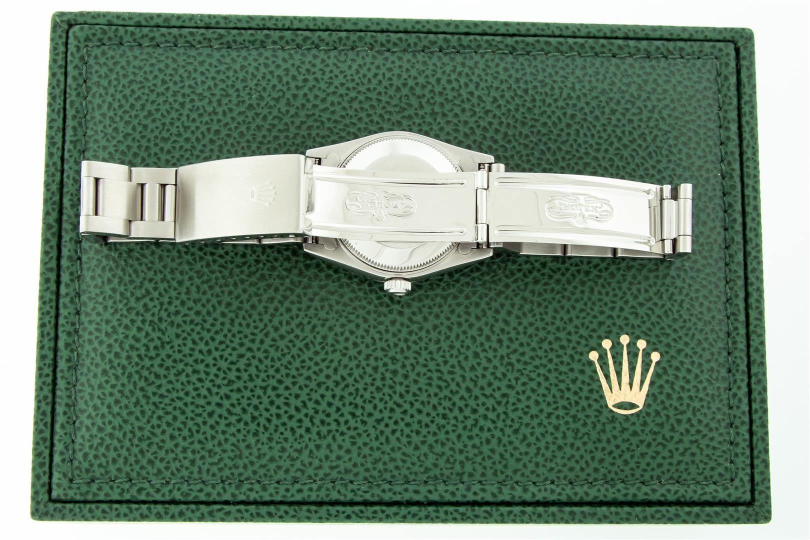 One Women's Pre Owned Midsize Stainless Steel Rolex Datejust Polished, Serviced & Electronically Tested, Rolex Stainless Steel Case Case: 31mm, Rolex Stainless Steel Crown, Custom Bezel: New 18K White Gold Sapphire Beadset Diamond Bezel, Diamond Count: 40 Diamonds + 4 Sapphires On Bezel, Color: G To H, Clarity: VS2-SI1. Custom Crystal: New Sapphire With Magnified Date Window. Custom Hands: New Luminescent Hands. Rolex Movement: Automatic Winding Movement 2235. Rolex Dial: Black Index Dial, Date Window: 3 O'Clock Position Date Display, Quickset, Model: Midsize Datejust. Condition: G-6 Extra Fine. Rolex Bracelet: Stainless Steel Oyster Band. Bright Polish. 6.0 Inch Length, Adjustable. Standard Clasp, With Rolex Logo. This Watch Has Been Serviced Time Tested And Is In Excellent Condition It Is Free Of All Scratches And Dents. This Watch Comes With A Rolex Box.