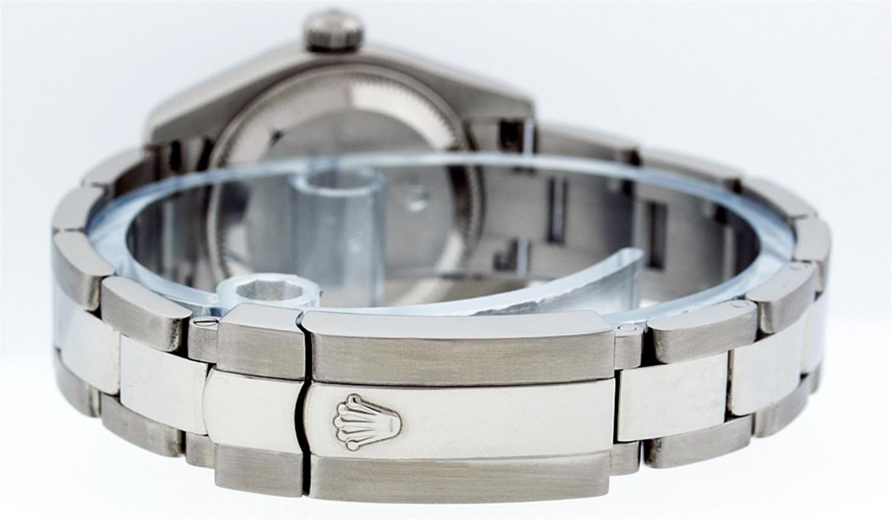 One New Style Ladies Quickset Stainless Steel Rolex Datejust Polished Bright with Satin Finish, Serviced & Electronically Tested, Stainless Steel Case: 26mm, Stainless Steel Crown, Bezel: Stainless Steel Smooth Bezel. Custom Crystal: New Scratch Resistant Sapphire Cyclops Lens. Custom Hands: New Luminescent Hands. Movement: Automatic Winding Movement. Custom Dial: Blue Vignette Single Cut VS Diamond Dial, Diamond Count: 10 Single Cut Diamonds In Dial, Color: G to H, Clarity: VS. Date Window: 3 O'Clock Position Date Display, Model: 179160 Quickset Datejust. Condition: G-6 Extra Fine. Bracelet: Stainless Steel Oyster Band. Bright Polish & Satin Finish. 6.0 Inch Length, Adjustable. Standard Clasp, With Rolex Logo. This Watch Has Been Serviced Time Tested And Is In Excellent Condition It Is Free Of All Scratches And Dents. This Watch Comes With A Rolex Box.