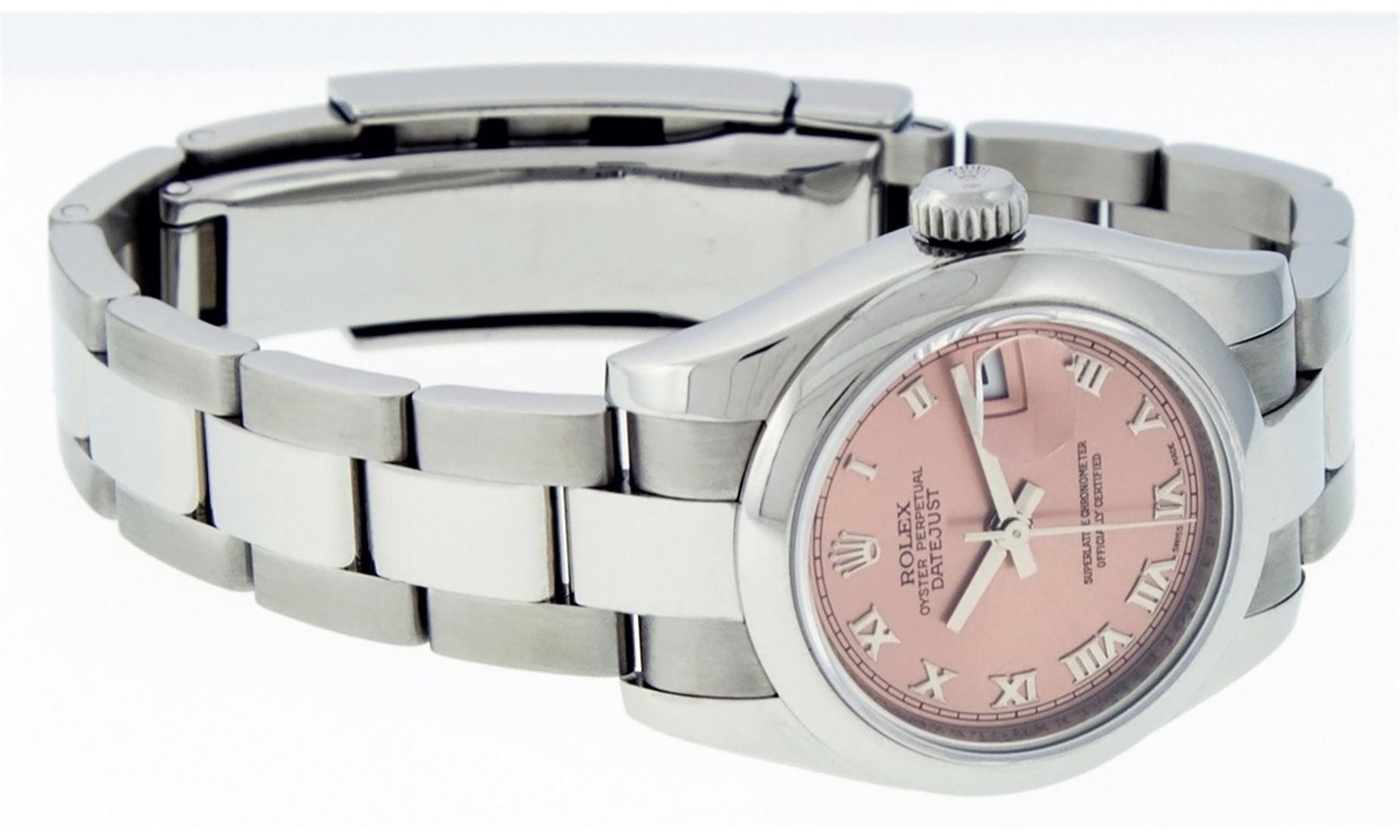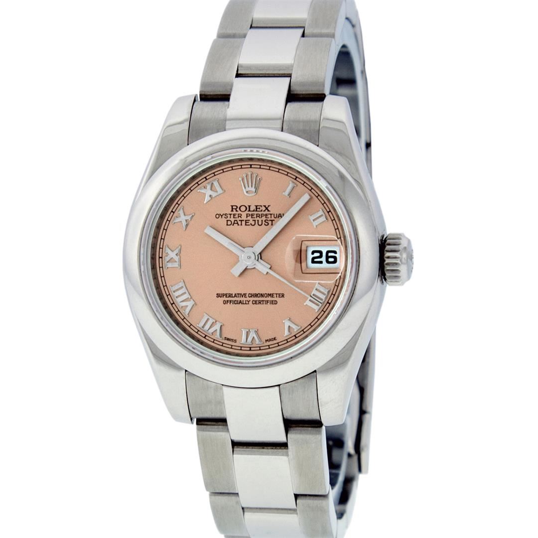 One New Style Ladies Pre Owned Quickset Stainless Steel Rolex Datejust Polished Bright with Satin Finish, Serviced & Electronically Tested, Rolex Stainless Steel Case: 26mm, Rolex Stainless Steel Crown, Rolex Bezel: Stainless Steel Smooth Bezel. Crystal: Sapphire With Magnified Date Window. Hands: Solid Hands. Rolex Movement: Automatic Winding Movement 2235. Rolex Dial: Salmon Roman Dial With Square Track. Date Window: 3 O'Clock Position Date Display, Model: Quickset 179160. Condition: G-6 Extra Fine. Rolex Bracelet: Stainless Steel Oyster Band. Bright Polish & Satin Finish. 6.0 Inch Length, Adjustable. Standard Clasp, With Rolex Logo. This Watch Has Been Serviced Time Tested And Is In Excellent Condition It Is Free Of All Scratches And Dents.