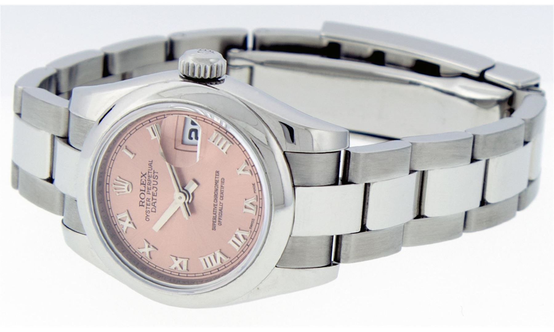 One New Style Ladies Pre Owned Quickset Stainless Steel Rolex Datejust Polished Bright with Satin Finish, Serviced & Electronically Tested, Rolex Stainless Steel Case: 26mm, Rolex Stainless Steel Crown, Rolex Bezel: Stainless Steel Smooth Bezel. Crystal: Sapphire With Magnified Date Window. Hands: Solid Hands. Rolex Movement: Automatic Winding Movement 2235. Rolex Dial: Salmon Roman Dial With Square Track. Date Window: 3 O'Clock Position Date Display, Model: Quickset 179160. Condition: G-6 Extra Fine. Rolex Bracelet: Stainless Steel Oyster Band. Bright Polish & Satin Finish. 6.0 Inch Length, Adjustable. Standard Clasp, With Rolex Logo. This Watch Has Been Serviced Time Tested And Is In Excellent Condition It Is Free Of All Scratches And Dents.