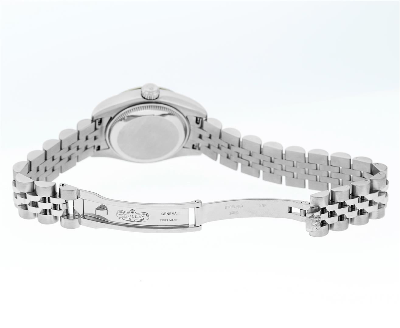 One New Style Ladies Pre Owned Quickset Stainless Steel Rolex Datejust Polished Bright with Satin Finish, Serviced & Electronically Tested, Rolex Stainless Steel Case: 26mm. Rolex Stainless Steel Crown, Rolex Bezel: 18K White Gold Fluted Bezel. Crystal: Sapphire With Magnified Date Window. Hands: Lumi Hands. Rolex Movement: Quickset Automatic Winding Movement 2235. Rolex Dial: White Index With Dash Track. Date Window: 3 O'Clock Position Date Display, Model: Sapphire Quickset Datejust. Condition: G-6 Extra Fine. Rolex Bracelet: Stainless Steel Jubilee Band With Hidden Clasp. Bright Polish & Satin Finish. 6.0 Inch Length, Adjustable. Hidden Clasp, With Rolex Logo. This Watch Has Been Serviced Time Tested And Is In Excellent Condition It Is Free Of All Scratches And Dents.