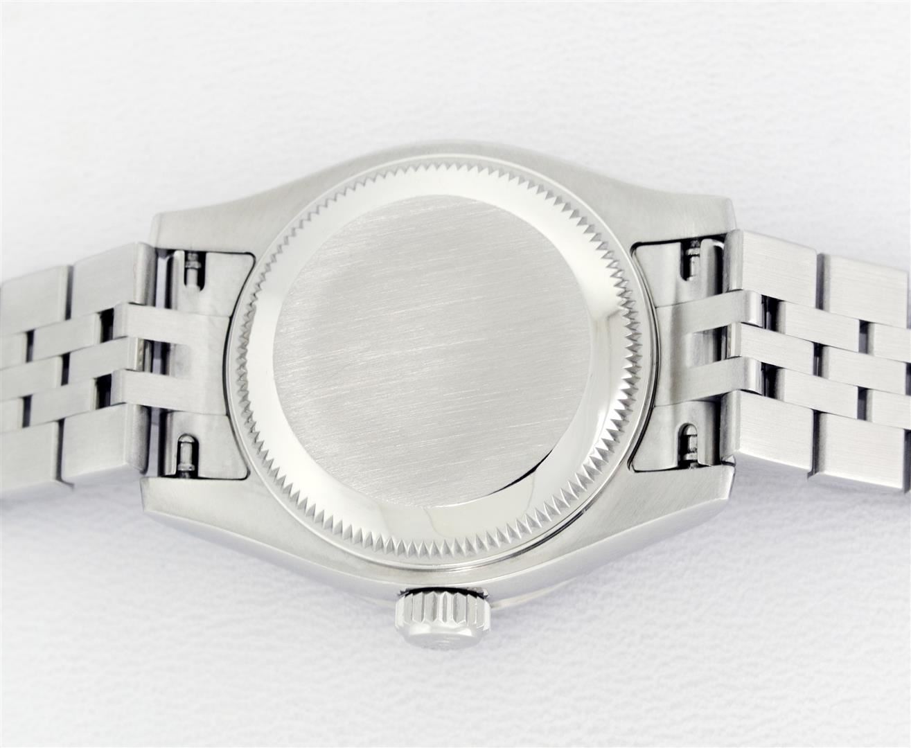 One Ladies Pre Owned Quickset Stainless Steel Rolex Datejust Polished Bright with Satin Finish, Serviced & Electronically Tested, Rolex Stainless Steel Case: 26mm. Rolex Stainless Steel Crown, Custom Bezel: New 18K White Gold Beadset And Ruby Bezel, Stone Count: 28 Diamonds + 4 Rubies, Diamond Color: G To H, Clarity: SI-VS. Crystal: Sapphire With Magnified Date Window. Hands: Lumi Hands. Rolex Movement: Quickset Automatic Winding Movement 2235. Rolex Dial: White Index With Dash Track. Date Window: 3 O'Clock Position Date Display, Model: Sapphire Quickset Datejust. Condition: G-6 Extra Fine. Rolex Bracelet: Stainless Steel Jubilee Band With Hidden Clasp. Bright Polish & Satin Finish. 6.0 Inch Length, Adjustable. Hidden Clasp, With Rolex Logo. This Watch Has Been Serviced Time Tested And Is In Excellent Condition It Is Free Of All Scratches And Dents.