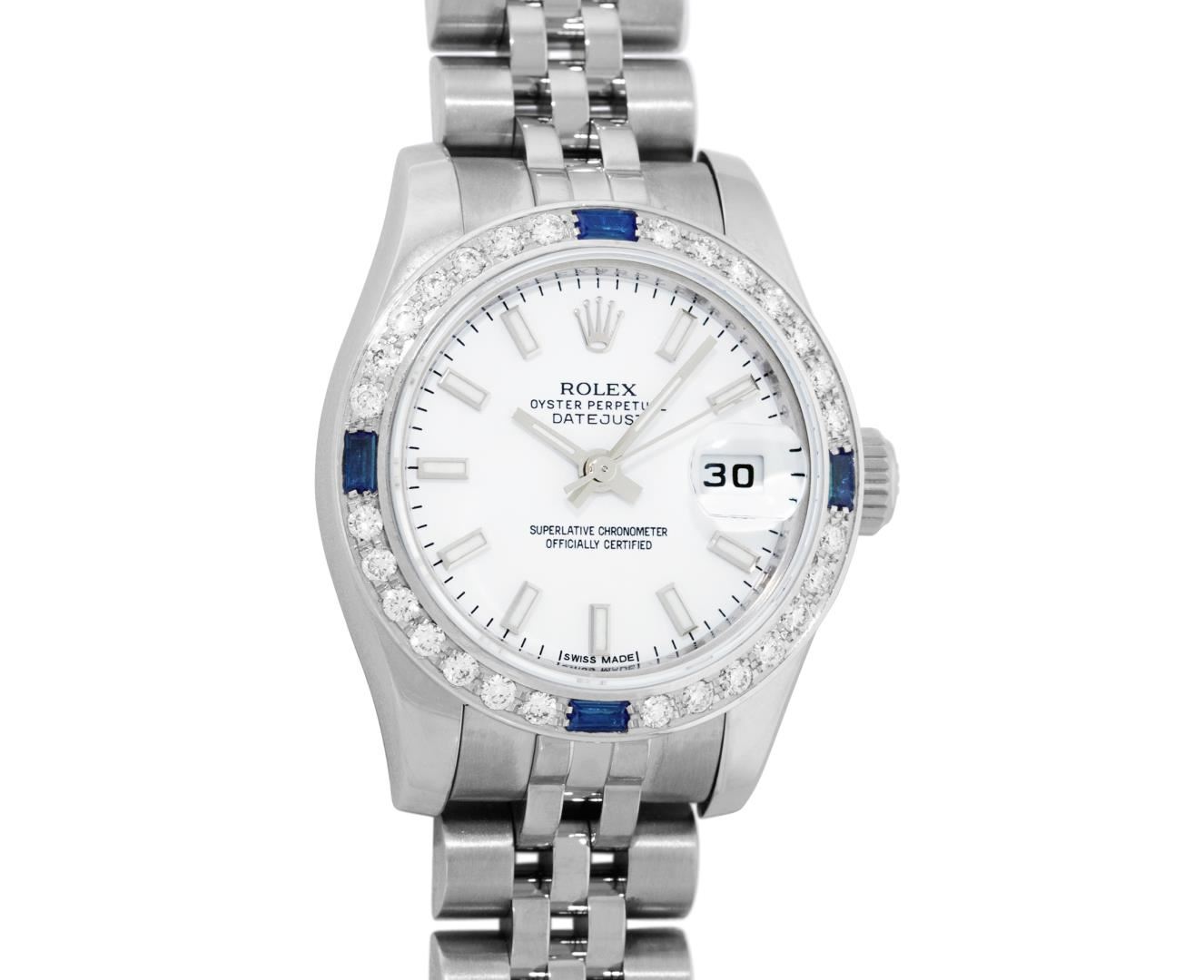 One New Style Ladies Rolex Pre Owned Quickset Stainless Steel Datejust Polished Bright with Satin Finish, Serviced And Electronically Tested, Rolex Stainless Steel Case: 26mm. Rolex Stainless Steel Crown, Custom Bezel: New 18K White Gold Beadset And Sapphire Bezel, Stone Count: 28 Diamonds + 4 Sapphires. Crystal: Sapphire With Magnified Date Window. Hands: Lumi Hands. Rolex Movement: Quickset Automatic Winding Movement 2235. Rolex Dial: White Index With Dash Track. Date Window: 3 O'Clock Position Date Display, Model: Sapphire Quickset Datejust. Condition: G-6 Extra Fine. Rolex Bracelet: Stainless Steel Jubilee Band With Hidden Clasp. Bright Polish And Satin Finish. 6.0 Inch Length, Adjustable. Hidden Clasp, With Rolex Logo. This Watch Has Been Serviced Time Tested And Is In Excellent Condition It Is Free Of All Scratches And Dents.