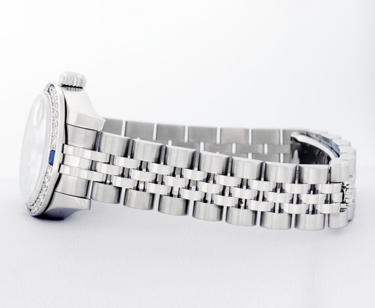 One New Style Ladies Rolex Pre Owned Quickset Stainless Steel Datejust Polished Bright with Satin Finish, Serviced And Electronically Tested, Rolex Stainless Steel Case: 26mm. Rolex Stainless Steel Crown, Custom Bezel: New 18K White Gold Beadset And Sapphire Bezel, Stone Count: 28 Diamonds + 4 Sapphires. Crystal: Sapphire With Magnified Date Window. Hands: Lumi Hands. Rolex Movement: Quickset Automatic Winding Movement 2235. Rolex Dial: White Index With Dash Track. Date Window: 3 O'Clock Position Date Display, Model: Sapphire Quickset Datejust. Condition: G-6 Extra Fine. Rolex Bracelet: Stainless Steel Jubilee Band With Hidden Clasp. Bright Polish And Satin Finish. 6.0 Inch Length, Adjustable. Hidden Clasp, With Rolex Logo. This Watch Has Been Serviced Time Tested And Is In Excellent Condition It Is Free Of All Scratches And Dents.