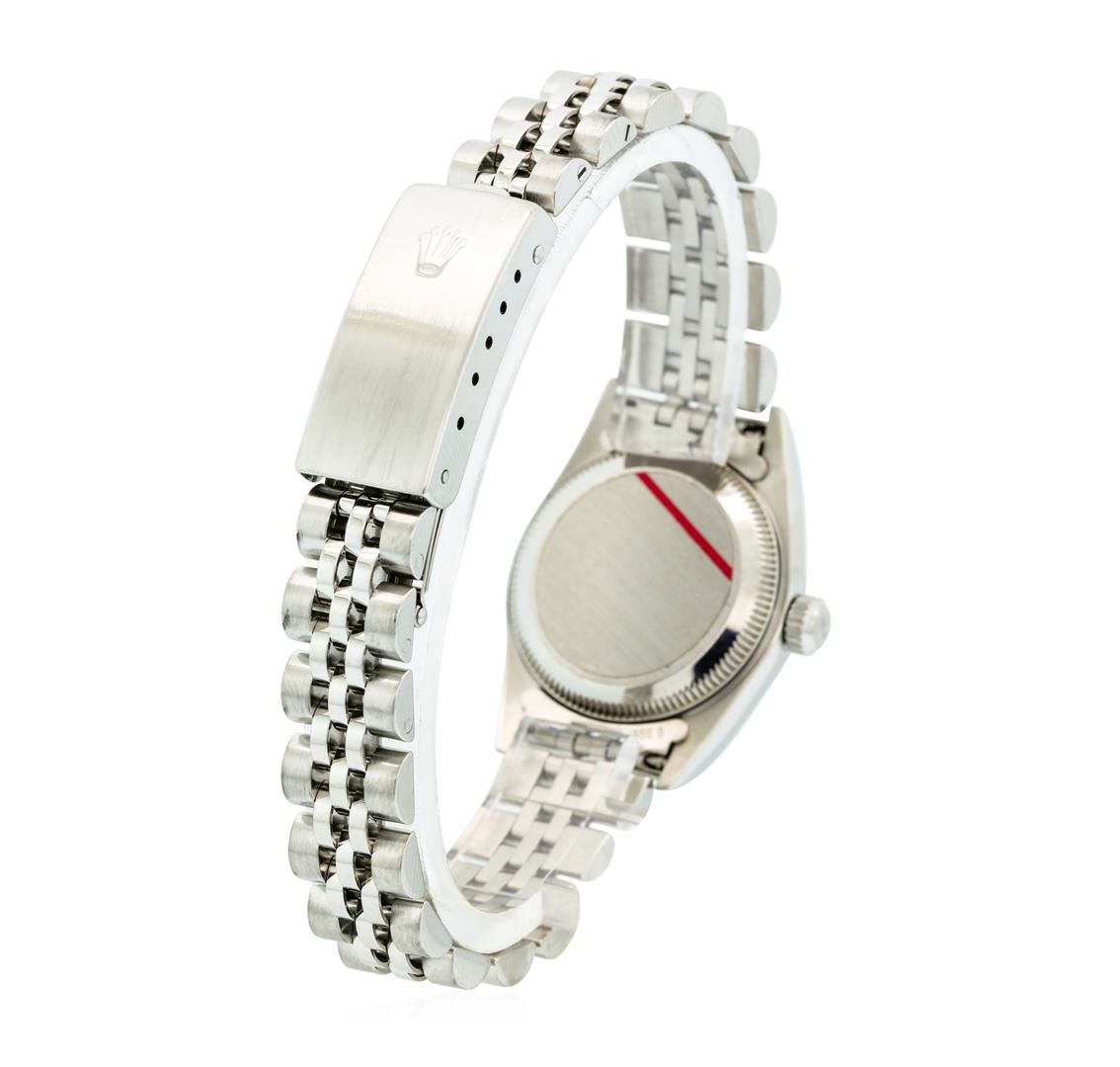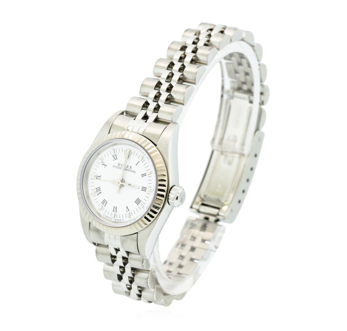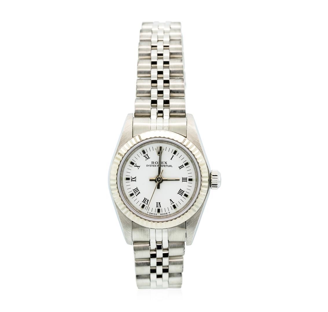 One ladies Rolex Oyster Perpetual model stainless steel wristwatch electronically tested, Case: 25mm oyster, Rolex Signature Crown: twinlock with high relief logo, 18KT White Gold Bezel: fluted, Crystal: synthetic sapphire lens. Movement: mechanical, stem wind, Rolex signed Dial: Porcelain White, with baton hands, Roman numerals and indices, Circa: 1999, Condition: G-7 Near Mint, Bracelet: bright polish & brushed finish stainless steel jubilee links. Three removable links. Six and one quarter inch length, adjustable. Rolex signed clasp, with high relief logo. Total Weight of Watch 47.47gm. AIG Appraised at $5,050.00.