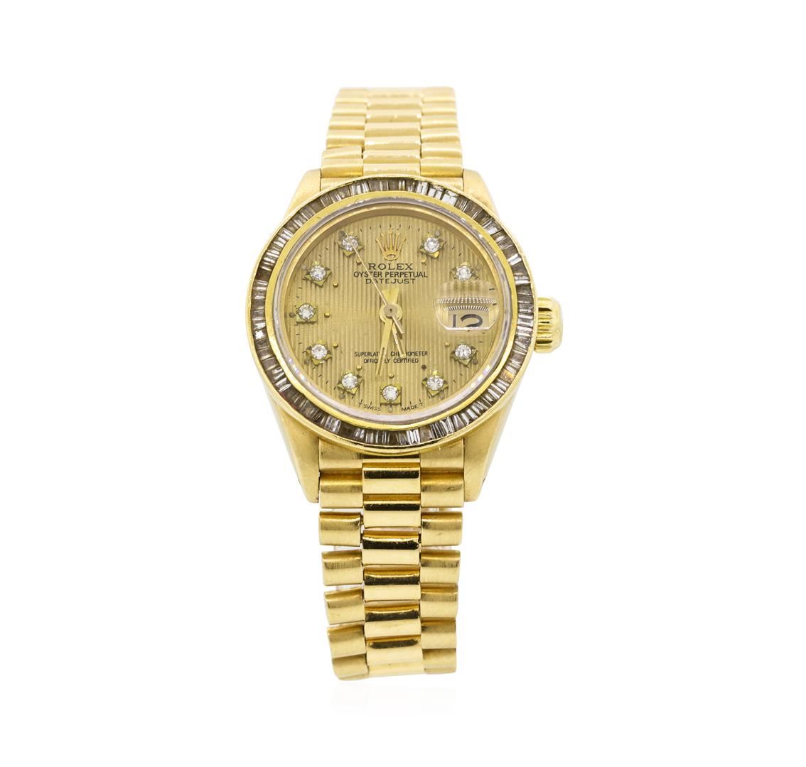 One ladies, hand crafted & machine milled Rolex Lady President the DateJust model wristwatch electro-chemically tested 18KT yellow gold. Circa: 1978, Case: 26mm oyster, Rolex Signature Crown: twinlock with logo, Custom Bezel: diamond set, Custom Crystal: synthetic sapphire cyclops lens.Movement: automatic, Custom Dial: Champagne color, tapestry design, baton hands, & diamond markers, Date Display: 3 o'clock position, non-quick set, Bracelet: 18KT yellow gold Lady President, Condition: G-5 Fine. Bright polish & satin finish. Six inch length. Swiss & Rolex Hallmarked concealed deployment clasp, with logo. Containing: Ten prong set single cut diamonds, measuring 1.40 - 1.40 x 0.84mm (depth est.) approximate total weight of 10 Stones = 0.10ct. Graded in the setting. Clarity: VS-1 to VS-2 Color G - H Seventy-Seven channel set baguette cut (tapered) diamonds, measuring from 1.50 x 0.80 x 0.56mm (depth est.) to 1.70 x 1.40 x 0.98mm (depth est.) approximate total weight of 77 Stones = 0.96ct. Graded in the setting. Clarity: VVS-1 to VS-1 Color G - I. Total Weight of Diamonds 1.06ct. Total Weight of Watch 75.09gm. AIG Appraised at $20,000.00.