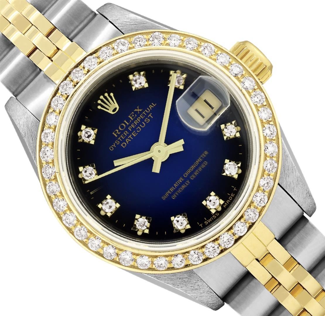 One Rolex Ladies Pre Owned Two Tone 18K Yellow Gold & Stainless Steel Rolex Datejust Polished, Serviced & Electronically Tested, Rolex Yellow Gold & Stainless Steel Case: 26mm, Rolex Yellow Gold Crown. Custom Bezel: New 18K Yellow Gold Beadset Diamond Bezel, Diamond Count: 32 Diamonds On Bezel. Crystal: Sapphire Crystal With Date Window. Custom Hands: New Solid Hands. Rolex Movement: 2135 Automatic Winding Movement. Custom Dial: Custom Blue Vignette Dial With Added Genuine VVS Diamond Hour Markers And Dash Track, Diamond Count: 10 Diamonds On Dial. Date Window: 3 O'Clock Position Date Display, Condition: G-6 Extra Fine. Rolex Bracelet: Two Tone 18K Yellow Gold & Stainless Steel Jubilee Band. Bright Polish & Satin Finish. 6.0 Inch Length, Adjustable. Standard Fold Clasp, With Rolex Logo. This Watch Has Been Serviced Time Tested And Is In Excellent Condition It Is Free Of All Scratches And Dents. This Watch Comes With A Rolex Box.