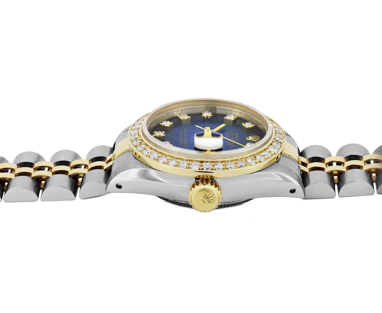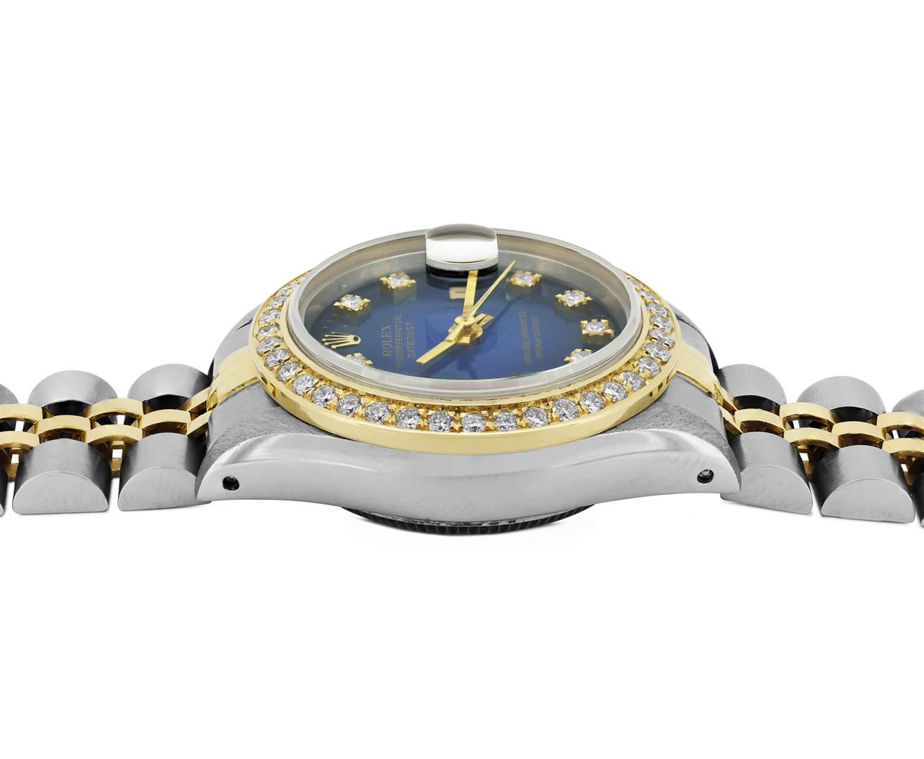 One Rolex Ladies Pre Owned Two Tone 18K Yellow Gold & Stainless Steel Rolex Datejust Polished, Serviced & Electronically Tested, Rolex Yellow Gold & Stainless Steel Case: 26mm, Rolex Yellow Gold Crown. Custom Bezel: New 18K Yellow Gold Beadset Diamond Bezel, Diamond Count: 32 Diamonds On Bezel. Crystal: Sapphire Crystal With Date Window. Custom Hands: New Solid Hands. Rolex Movement: 2135 Automatic Winding Movement. Custom Dial: Custom Blue Vignette Dial With Added Genuine VVS Diamond Hour Markers And Dash Track, Diamond Count: 10 Diamonds On Dial. Date Window: 3 O'Clock Position Date Display, Condition: G-6 Extra Fine. Rolex Bracelet: Two Tone 18K Yellow Gold & Stainless Steel Jubilee Band. Bright Polish & Satin Finish. 6.0 Inch Length, Adjustable. Standard Fold Clasp, With Rolex Logo. This Watch Has Been Serviced Time Tested And Is In Excellent Condition It Is Free Of All Scratches And Dents. This Watch Comes With A Rolex Box.