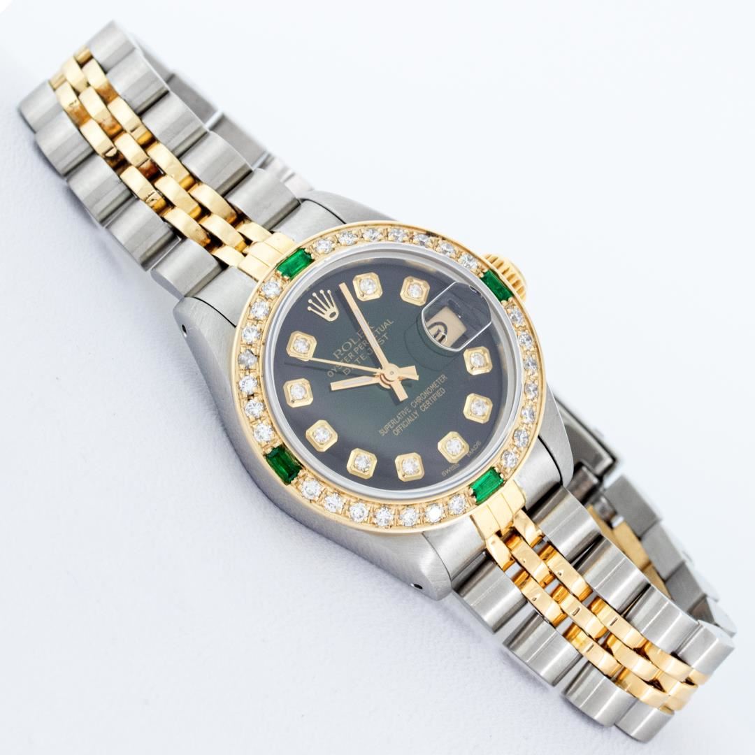One Ladies Pre Owned Quickset Two Tone 18K Yellow Gold And Stainless Steel Rolex Datejust Polished, Serviced And Electronically Tested, Yellow Gold And Stainless Steel Case: 26mm, Yellow Gold Crown, Custom Bezel: New 18K Yellow Gold Emerald Beadset Diamond Bezel, Diamond + Gem Count: 28 Diamonds + 4 Emeralds. Custom Crystal: New Sapphire With Date Window. Custom Hands: New Luminescent Hands. Rolex Movement: Automatic Winding Movement 2135. Custom Dial: Custom Green Vignette Dial With Added Diamond Hour Markers, Diamond Count: 10 Diamond in Dial. Date Window: 3 O'Clock Position Date Display, Model: Quickset Datejust, Condition: G-6 Extra Fine. Rolex Bracelet: Two Tone Yellow Gold And Stainless Steel Jubilee Band. Bright Polish. 6.0 Inch Length, Adjustable. Standard Clasp, With Rolex Logo. This Watch Has Been Serviced Time Tested And Is In Excellent Condition It Is Free Of All Scratches And Dents.