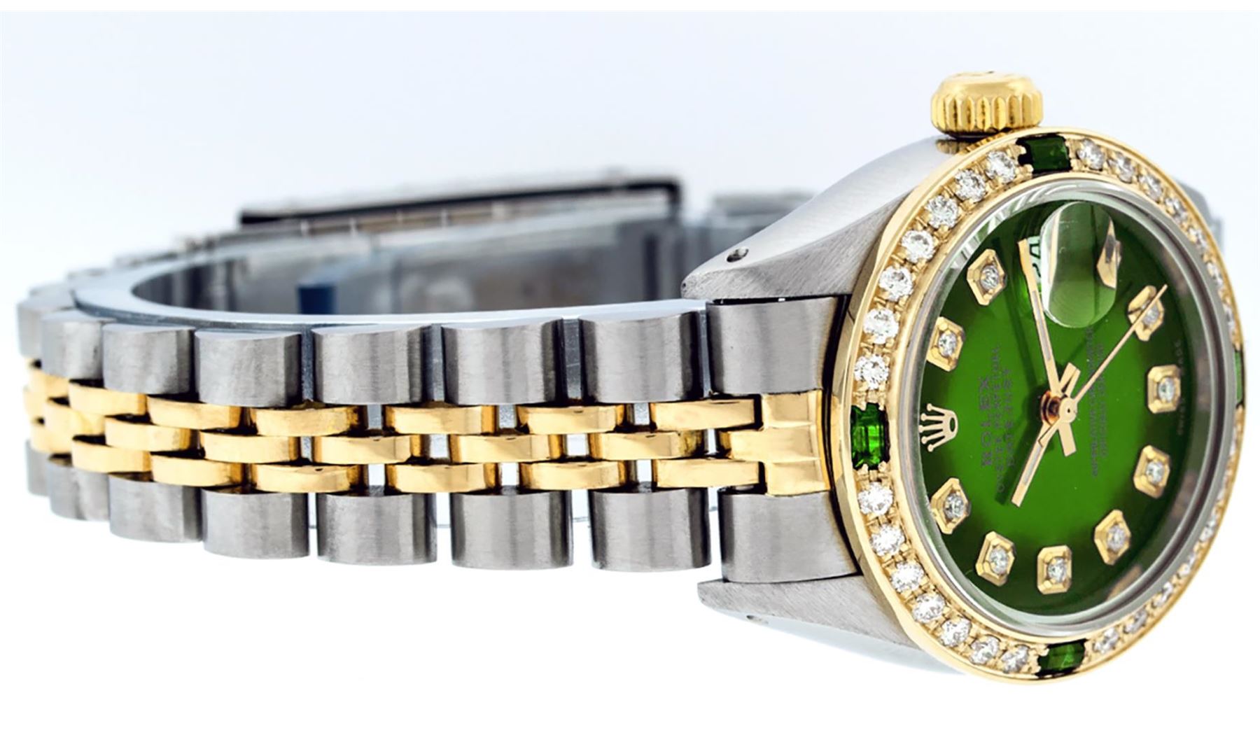 One Ladies Pre Owned Quickset Two Tone 18K Yellow Gold And Stainless Steel Rolex Datejust Polished, Serviced And Electronically Tested, Yellow Gold And Stainless Steel Case: 26mm, Yellow Gold Crown, Custom Bezel: New 18K Yellow Gold Emerald Beadset Diamond Bezel, Diamond + Gem Count: 28 Diamonds + 4 Emeralds. Custom Crystal: New Sapphire With Date Window. Custom Hands: New Luminescent Hands. Rolex Movement: Automatic Winding Movement 2135. Custom Dial: Custom Green Vignette Dial With Added Diamond Hour Markers, Diamond Count: 10 Diamond in Dial. Date Window: 3 O'Clock Position Date Display, Model: Quickset Datejust, Condition: G-6 Extra Fine. Rolex Bracelet: Two Tone Yellow Gold And Stainless Steel Jubilee Band. Bright Polish. 6.0 Inch Length, Adjustable. Standard Clasp, With Rolex Logo. This Watch Has Been Serviced Time Tested And Is In Excellent Condition It Is Free Of All Scratches And Dents.