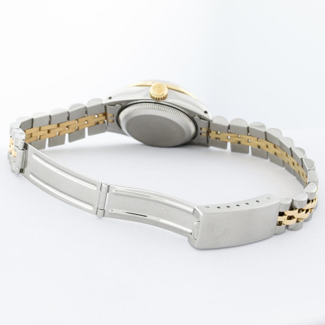 One Ladies Pre Owned Quickset Two Tone 18K Yellow Gold And Stainless Steel Rolex Datejust Polished, Serviced And Electronically Tested, Yellow Gold And Stainless Steel Case: 26mm, Yellow Gold Crown, Custom Bezel: New 18K Yellow Gold Emerald Beadset Diamond Bezel, Diamond + Gem Count: 28 Diamonds + 4 Emeralds. Custom Crystal: New Sapphire With Date Window. Custom Hands: New Luminescent Hands. Rolex Movement: Automatic Winding Movement 2135. Custom Dial: Custom Green Vignette Dial With Added Diamond Hour Markers, Diamond Count: 10 Diamond in Dial. Date Window: 3 O'Clock Position Date Display, Model: Quickset Datejust, Condition: G-6 Extra Fine. Rolex Bracelet: Two Tone Yellow Gold And Stainless Steel Jubilee Band. Bright Polish. 6.0 Inch Length, Adjustable. Standard Clasp, With Rolex Logo. This Watch Has Been Serviced Time Tested And Is In Excellent Condition It Is Free Of All Scratches And Dents.