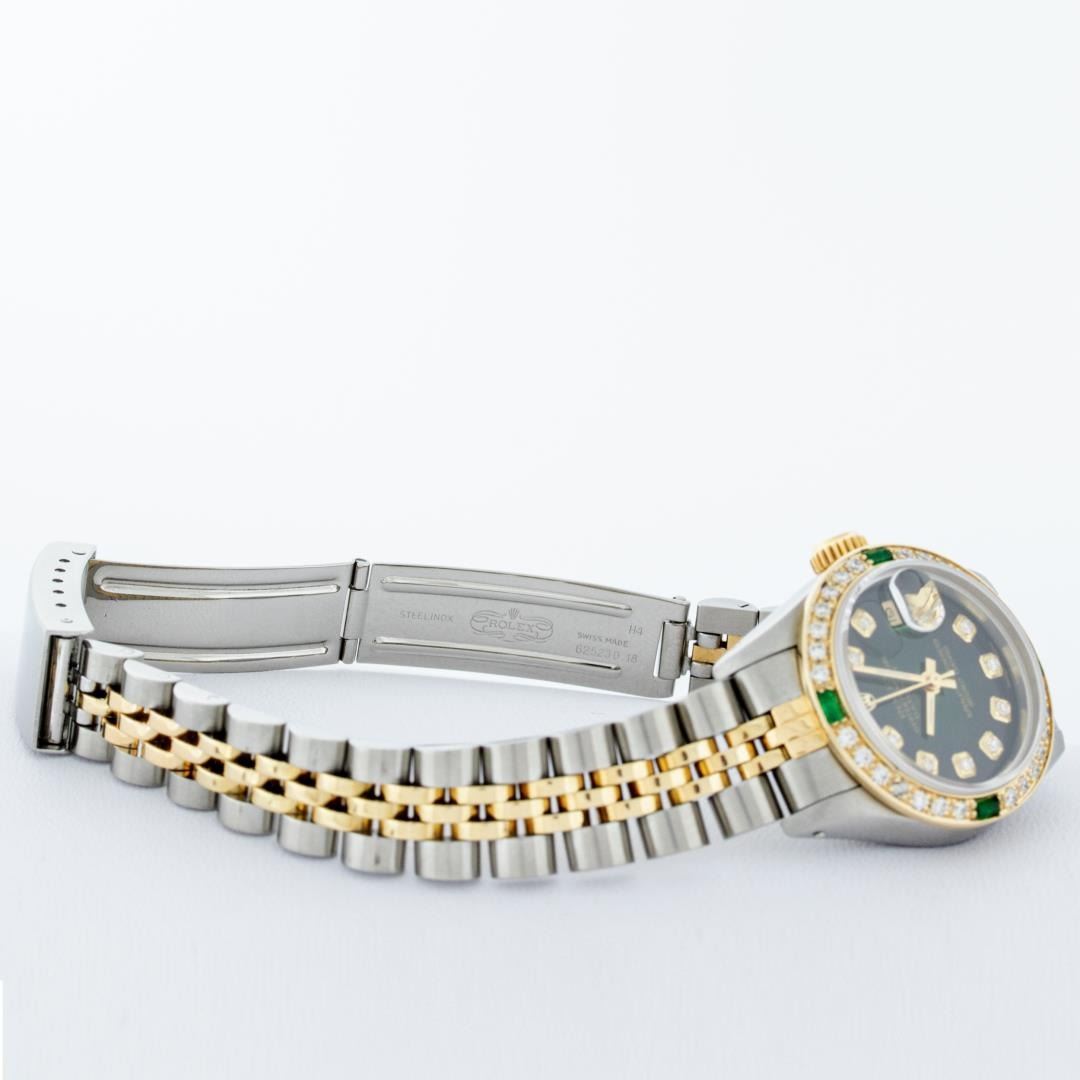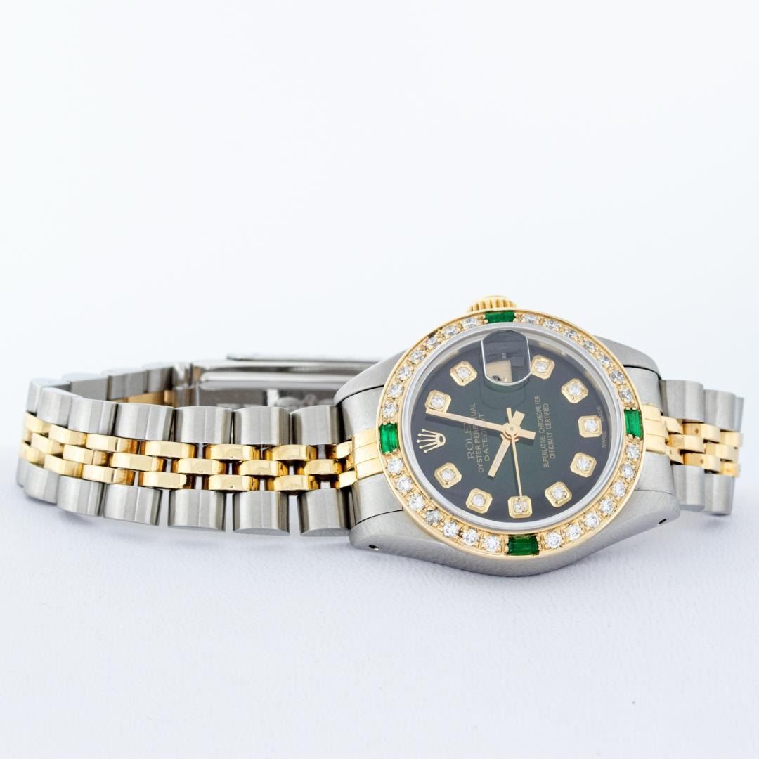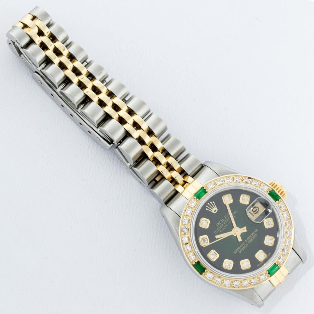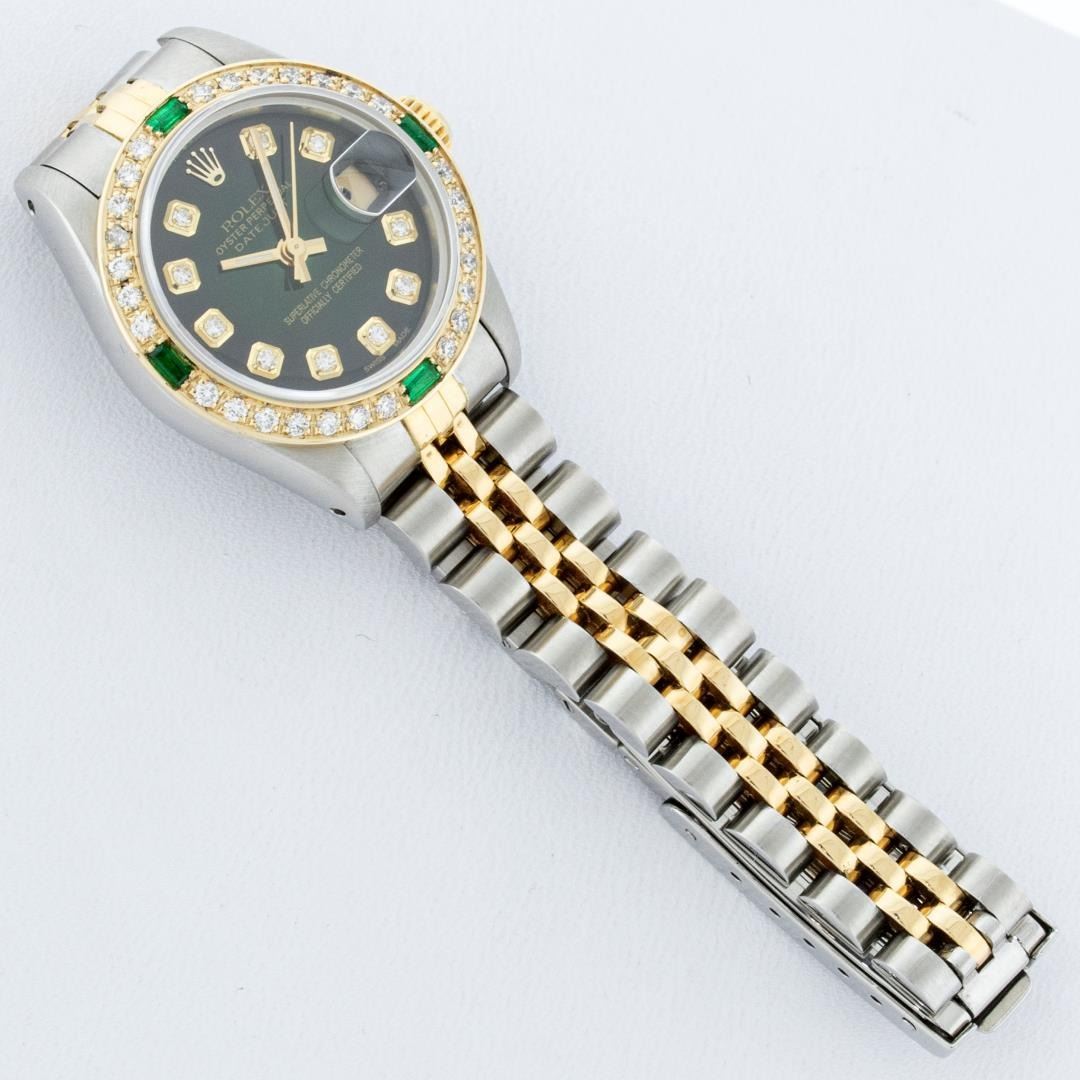 One Ladies Pre Owned Quickset Two Tone 18K Yellow Gold And Stainless Steel Rolex Datejust Polished, Serviced And Electronically Tested, Yellow Gold And Stainless Steel Case: 26mm, Yellow Gold Crown, Custom Bezel: New 18K Yellow Gold Emerald Beadset Diamond Bezel, Diamond + Gem Count: 28 Diamonds + 4 Emeralds. Custom Crystal: New Sapphire With Date Window. Custom Hands: New Luminescent Hands. Rolex Movement: Automatic Winding Movement 2135. Custom Dial: Custom Green Vignette Dial With Added Diamond Hour Markers, Diamond Count: 10 Diamond in Dial. Date Window: 3 O'Clock Position Date Display, Model: Quickset Datejust, Condition: G-6 Extra Fine. Rolex Bracelet: Two Tone Yellow Gold And Stainless Steel Jubilee Band. Bright Polish. 6.0 Inch Length, Adjustable. Standard Clasp, With Rolex Logo. This Watch Has Been Serviced Time Tested And Is In Excellent Condition It Is Free Of All Scratches And Dents.