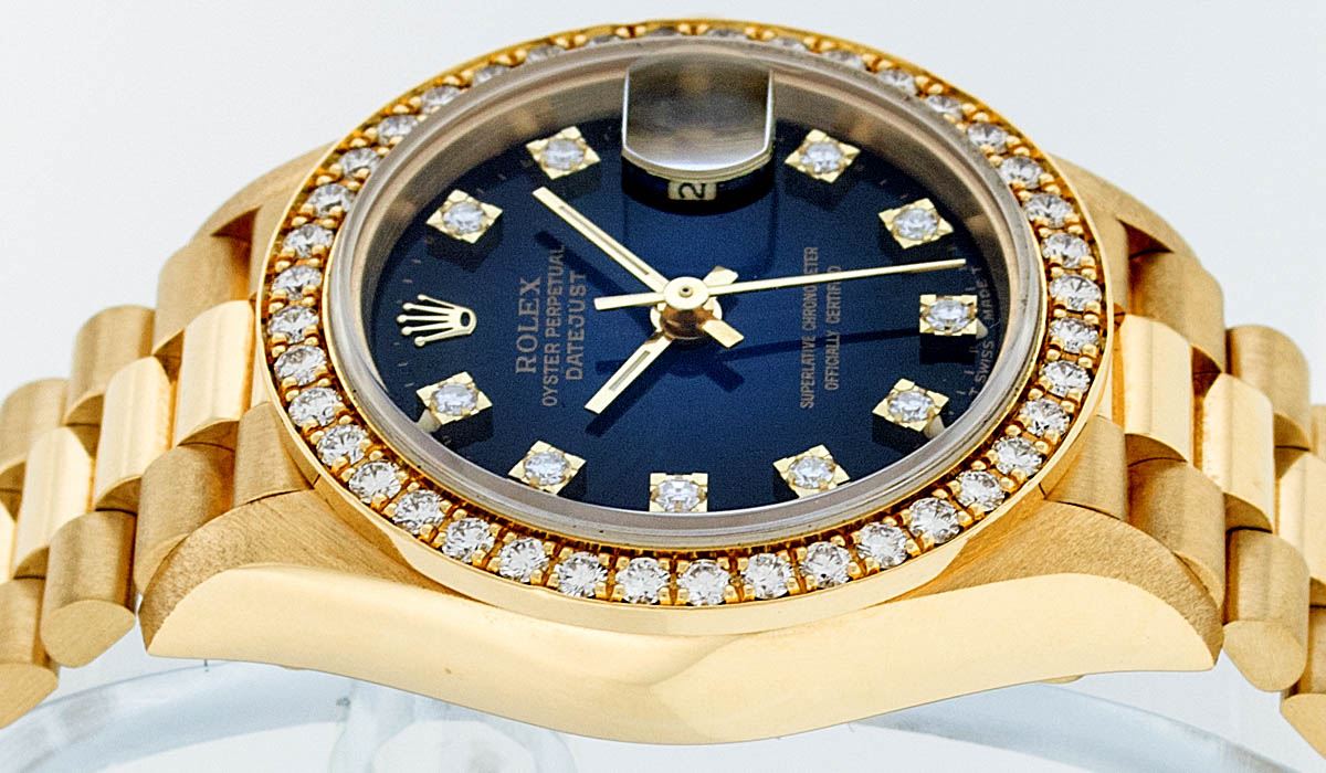 One Ladies 18K Yellow Gold Rolex President Polished, Serviced & Electronically Tested, Yellow Gold Case: 26mm, 18K Yellow Gold Crown, Custom Bezel: 18K Yellow Gold Beadset Diamond Bezel, Diamond Count: 40 Diamonds. Total Weight 1.0 Carat, Clarity: SI-VS, Color: G to H. Custom Crystal: Synthetic Sapphire Cyclops Lens. Movement: Automatic Winding Movement Caliber 2135. Custom Dial: Blue Vignette Diamond With Lumi Dots And Line Track, Stone Count: 10 Diamonds In Dial. Color: G to H, Clarity: VVS. Date Window: 3 O'Clock Position, Model: 69178 2135 Movement Datejust President, Quickset, Condition: G-6 Extra Fine. Bracelet: 18K Yellow Gold President With Hidden Clasp, Bright & Satin Polish. 6.0 Inch Length, Standard President Clasp (Hidden Clasp), With Rolex Logo. Watch Has Been Serviced And Polished It Is Free Of All Scratches And Dents.