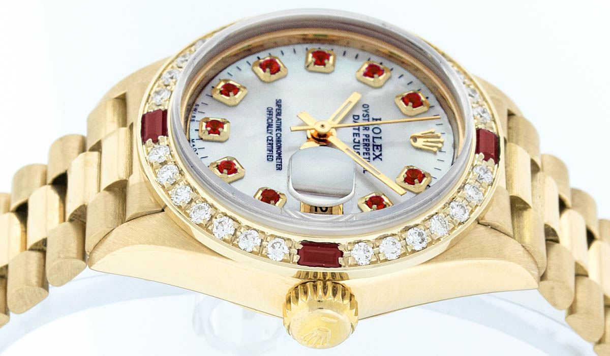 One Ladies 18K Yellow Gold Rolex President Polished, Serviced & Electronically Tested, Yellow Gold Case: 26mm, 18K Yellow Gold Crown, Custom Bezel: 18K Yellow Gold Beadset Diamond Bezel, Diamond Count: 32 Diamonds. Total Weight .70 Carat, Clarity: SI-VS, Color: G to H. Custom Crystal: Synthetic Sapphire Cyclops Lens. Movement: Automatic Winding Movement Caliber 2135. Custom Dial: Mother Of Pearl With Ruby Hour Markers, Stone Count: 10 Rubies In Dial. Date Window: 3 O'Clock Position, Model: Datejust President 69178, Quickset, Condition: G-6 Extra Fine. Bracelet: 18K Yellow Gold President With Hidden Clasp, Bright & Satin Polish. 6.0 Inch Length, Standard President Clasp (Hidden Clasp), With Rolex Logo. Watch Has Been Serviced And Polished It Is Free Of All Scratches And Dents.