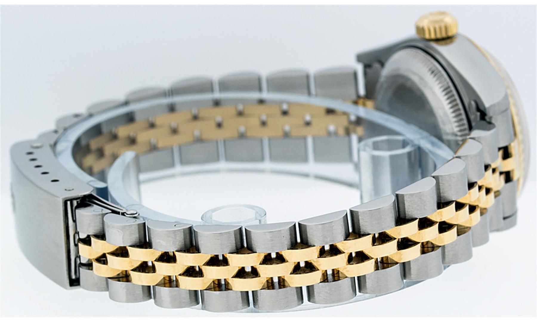 Rolex Ladies Pre Owned 18K Two Tone Yellow Gold & Stainless Steel Rolex Datejust Polished, Serviced & Electronically Tested, Rolex 18K Yellow Gold & Stainless Steel, Rolex Case Size: 26mm, 18K Yellow Gold Crown, Rolex Bezel: New 18K Yellow Gold Fluted Bezel. Custom Crystal: New Acrylic Cyclops Lens. Custom Hands: New Luminescent Hands. Rolex Movement: Automatic Winding Movement. Custom Dial: Refinished To Mother Of Pearl With Added Single Cut Diamond Dial, Diamond Count: 10 Diamonds In Dial, Color: G To H, Clarity VS2. Date Window: 3 O'Clock Position Date Display, Model: Datejust. Condition: G-6 Extra Fine. Rolex Bracelet: Two Tone 18K Yellow Gold & Stainless Steel Jubilee. Bright Polish. 6.0 Inch Length, Adjustable. Standard Clasp, With Rolex Logo. This Watch Has Been Serviced Time Tested And Is In Excellent Condition It Is Free Of All Scratches And Dents.