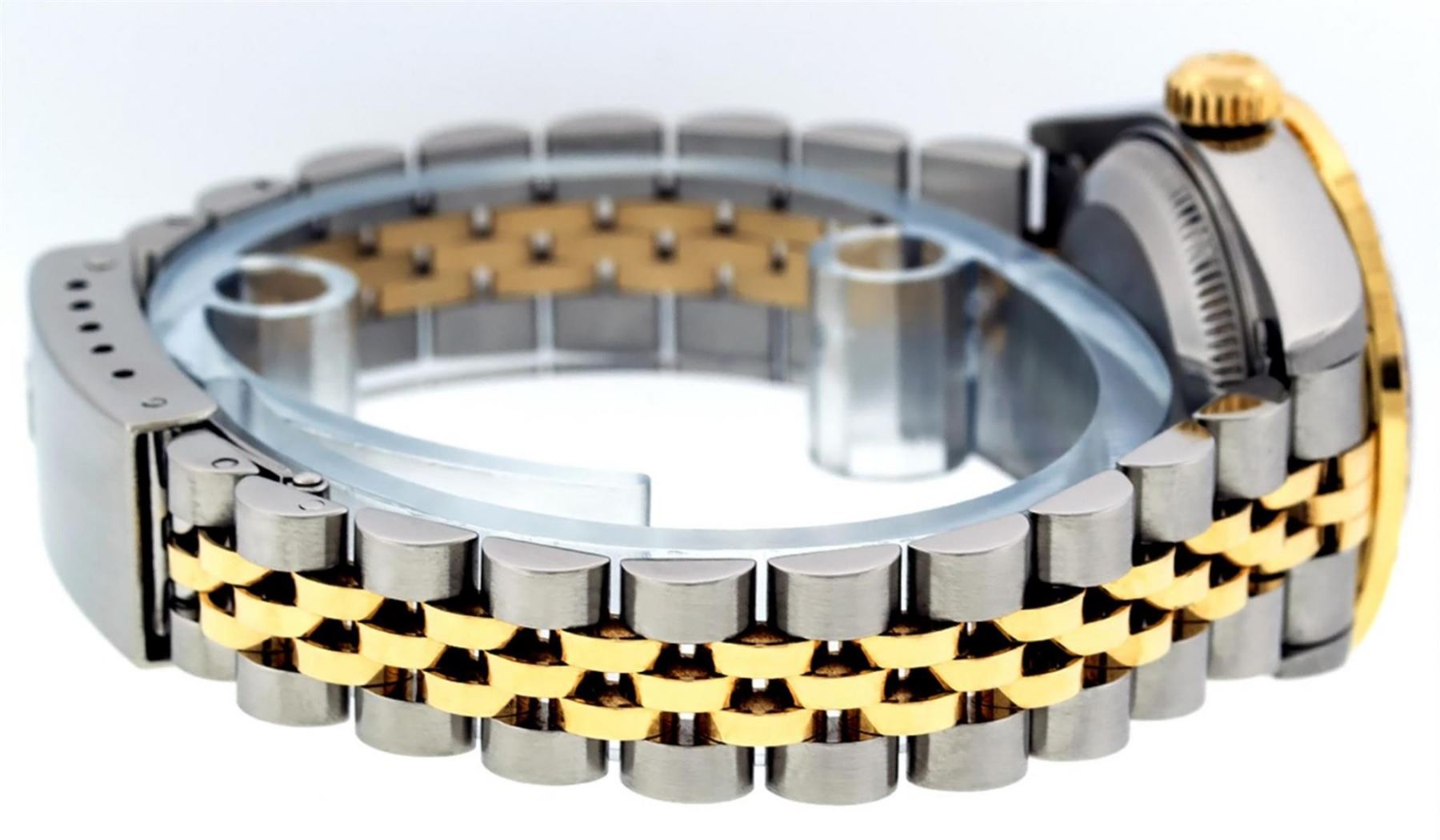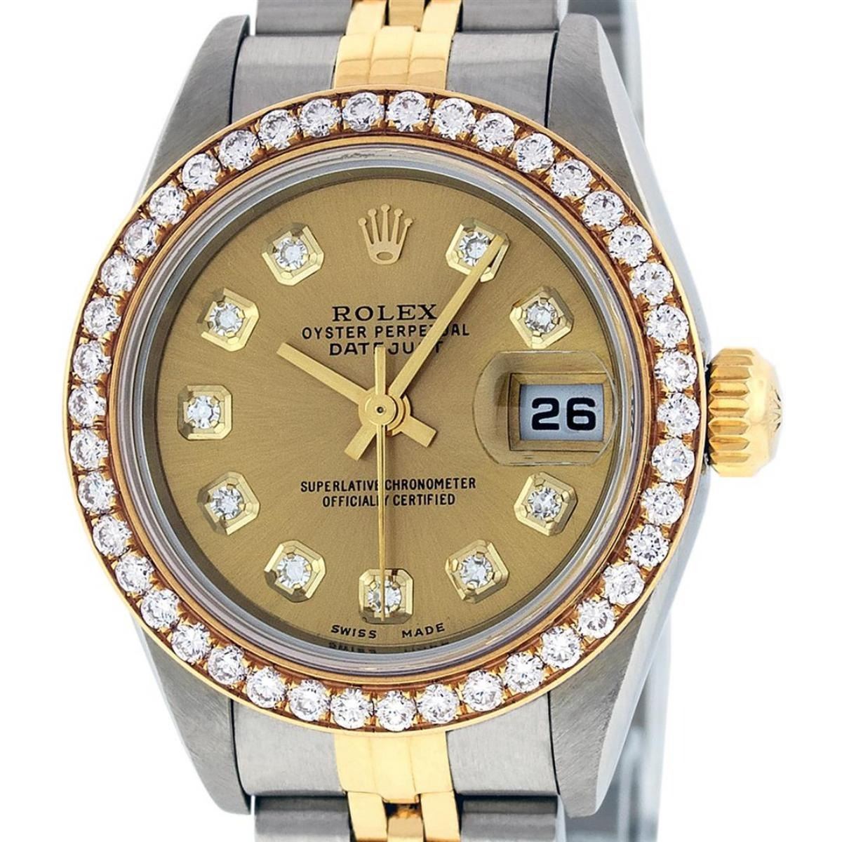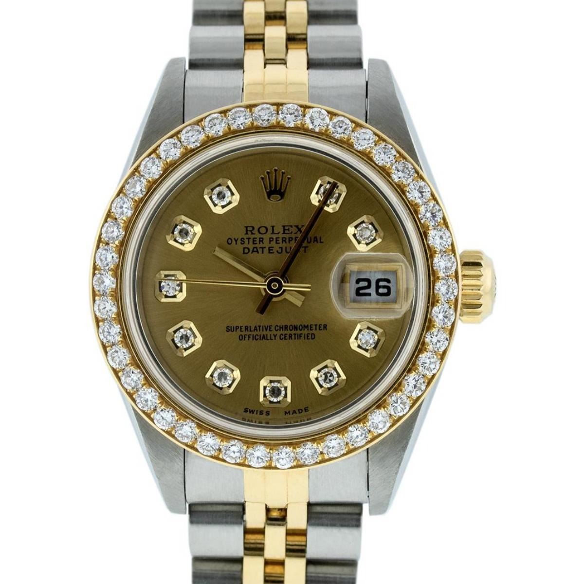 One Ladies Quickset 18K Two Tone Rolex Oyster Perpetual Datejust Polished, Serviced & Electronically Tested, 18K Yellow Gold & Stainless Steel Case: 26mm, 18K Yellow Gold Crown, Custom Bezel: New 18K Yellow Gold Beadset Diamond Bezel, Diamond Count: 42 Diamonds in dial, Total Weight 1.00 Carat, Clarity: SI-VS, Color: G to H. Custom Crystal: New Scratch Resistant Synthetic Sapphire Cyclops Lens. Custom Hands: New Luminescent Hands. Movement: Automatic Winding Movement. Custom Dial: Champagne Single Cut Diamond Dial, Stone Count: 10 Diamonds, Clarity: VS2, Color: G to H. Date Window: 3 O'Clock Position Date Display, Model: Sapphire Quickset Datejust Caliber 2230. Condition: G-6 Extra Fine. Bracelet: Two Tone 18K Yellow Gold & Stainless Steel Jubilee Band. Bright Polish. 6.0 Inch Length, Adjustable. Standard Clasp, With Rolex Logo. This Watch Has Been Serviced Time Tested And Is In Excellent Condition It Is Free Of All Scratches And Dents.