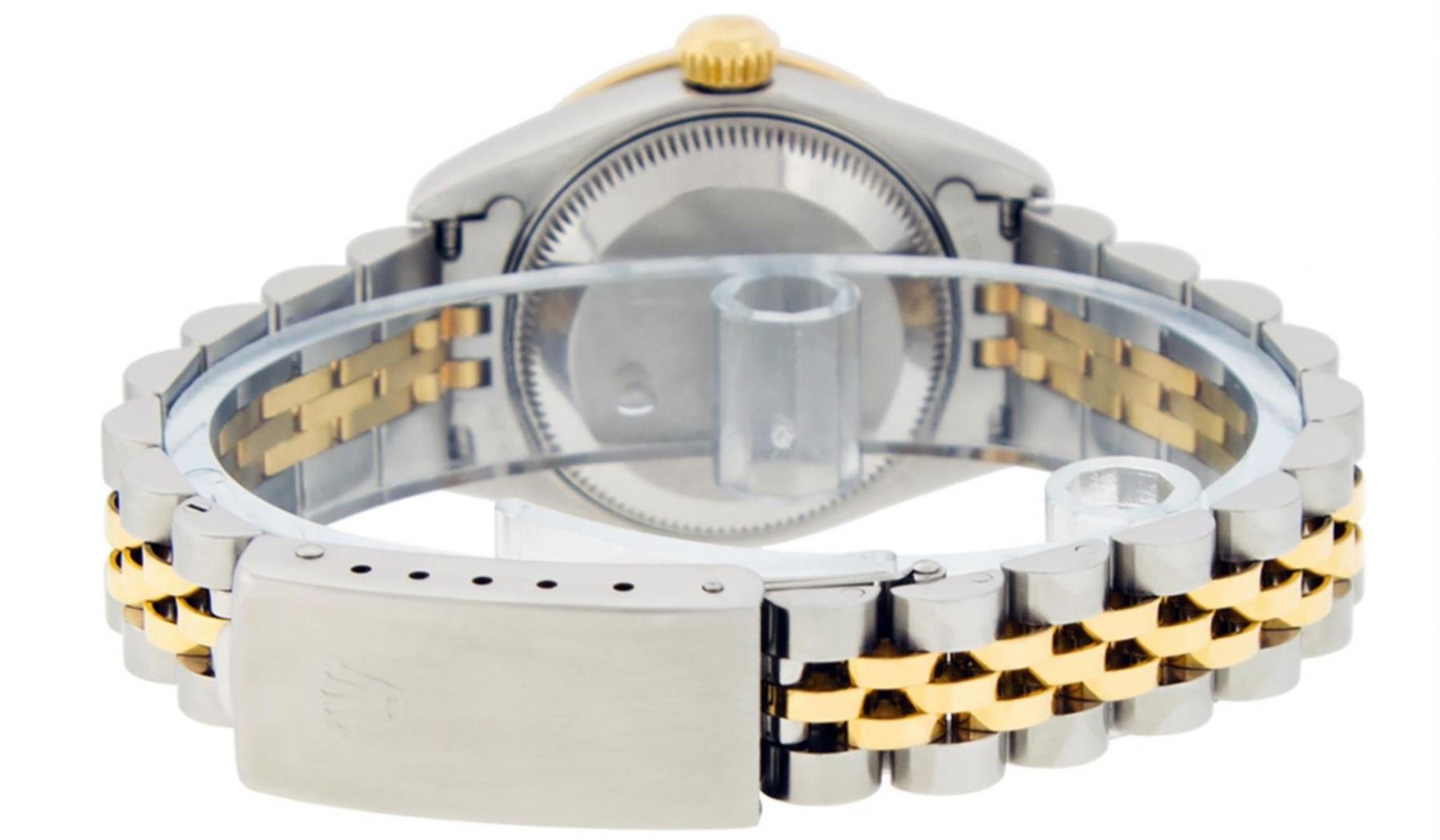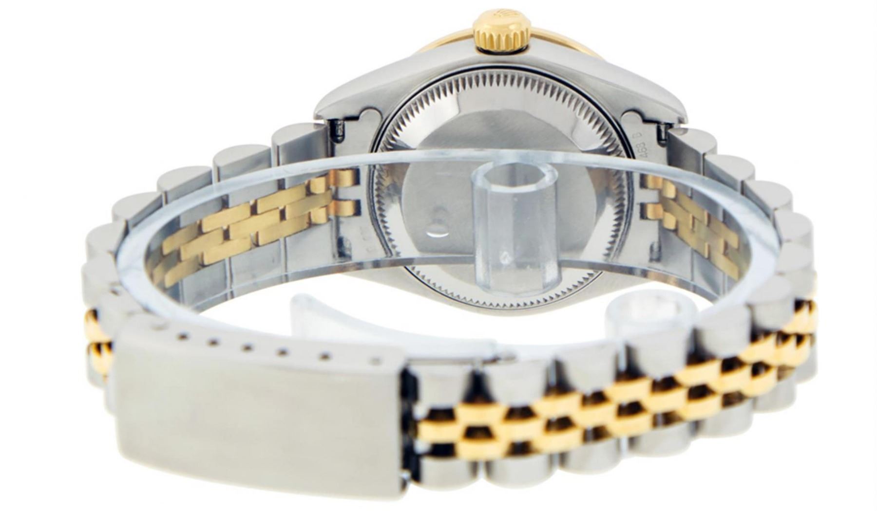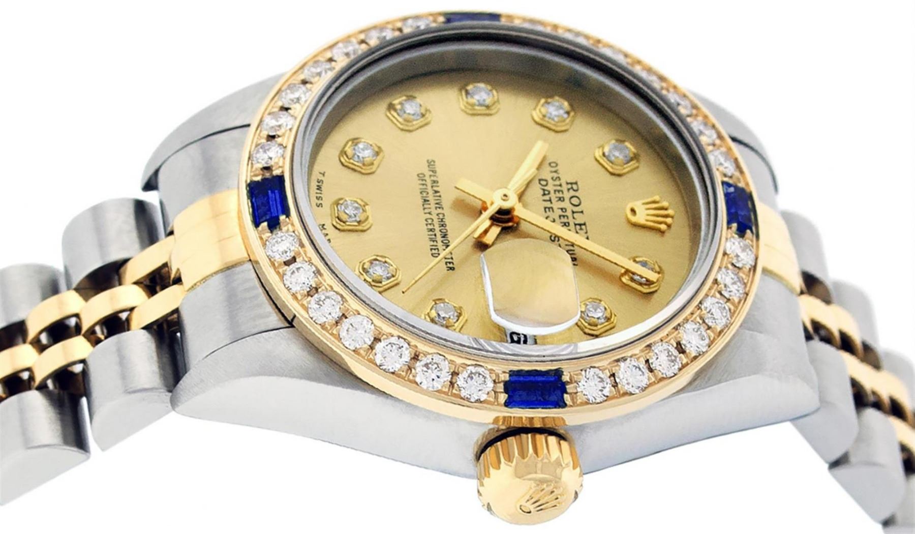 One Ladies 18K Two Tone Rolex Oyster Perpetual Datejust Polished, Serviced & Electronically Tested, 18K Yellow Gold & Stainless Steel Case: 26mm, 18K Yellow Gold Crown, Custom Bezel: New 18K Yellow Gold Sapphire Beadset Diamond Bezel, Diamond + Gem Count: 28 Diamonds + 4 Sapphires Total Weight .70 Carat, Clarity: SI-VS, Color: G to H. Custom Crystal: New Scratch Resistant Synthetic Sapphire Cyclops Lens. Custom Hands: New Luminescent Hands. Movement: Automatic Winding Movement. Custom Dial: Champagne Dial Set With VS Diamond Hour Markers & Dash Track, Diamond Count: 10 Champagne Single Cut Diamonds in Dial, G To H In Color, VS Clarity. Date Window: 3 O'Clock Position Date Display, Model: Datejust, Condition: G-6 Extra Fine. Bracelet: Two Tone 18K Yellow Gold & Stainless Steel Jubilee. Bright Polish. 6.0 Inch Length, Adjustable. Standard Clasp, With Rolex Logo. This Watch Has Been Serviced Time Tested And Is In Excellent Condition It Is Free Of All Scratches And Dents.