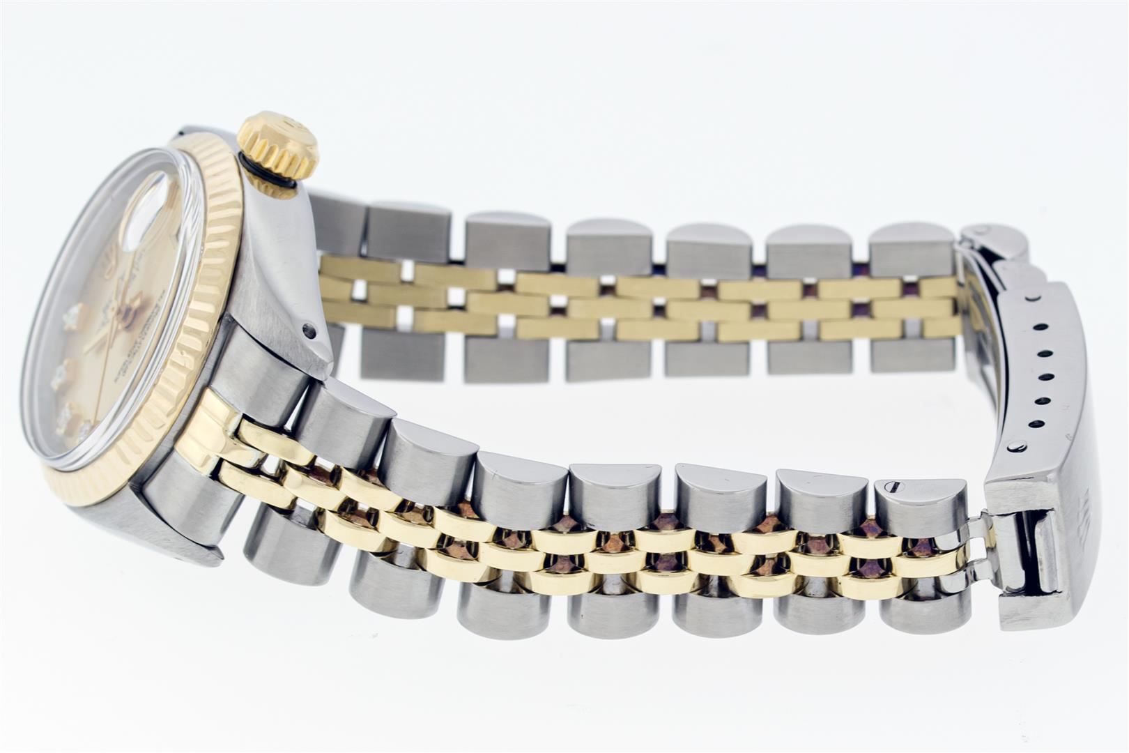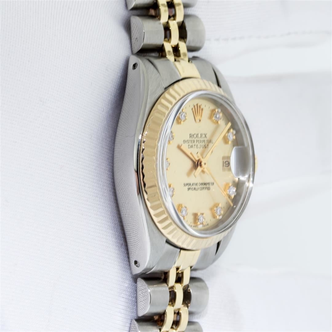 One Ladies Quickset Pre Owned Two Tone 18K Yellow Gold & Stainless Steel Rolex Datejust Polished, Serviced & Electronically Tested, Rolex Yellow Gold & Stainless Steel Case: 26mm, Rolex Yellow Gold Crown, Rolex Bezel: Rolex 18K Yellow Gold Fluted Bezel. Crystal: Sapphire Crystal With Date Window. Hands: Solid Hands. Rolex Movement: Quickset Automatic Winding Movement. Rolex Factory Dial: Champagne With Diamond Hour Markers And Dash Track, Diamond Count: 10 Diamonds In Dial. Date Window: 3 O'Clock Position Date Display, Model: Quickset Datejust. Condition: G-6 Extra Fine. Rolex Bracelet: Two Tone 18K Yellow Gold & Stainless Steel Jubilee Band. Bright Polish. 6.0 Inch Length, Adjustable. Standard Clasp, With Rolex Logo. This Watch Has Been Serviced Time Tested And Is In Excellent Condition It Is Free Of All Scratches And Dents.