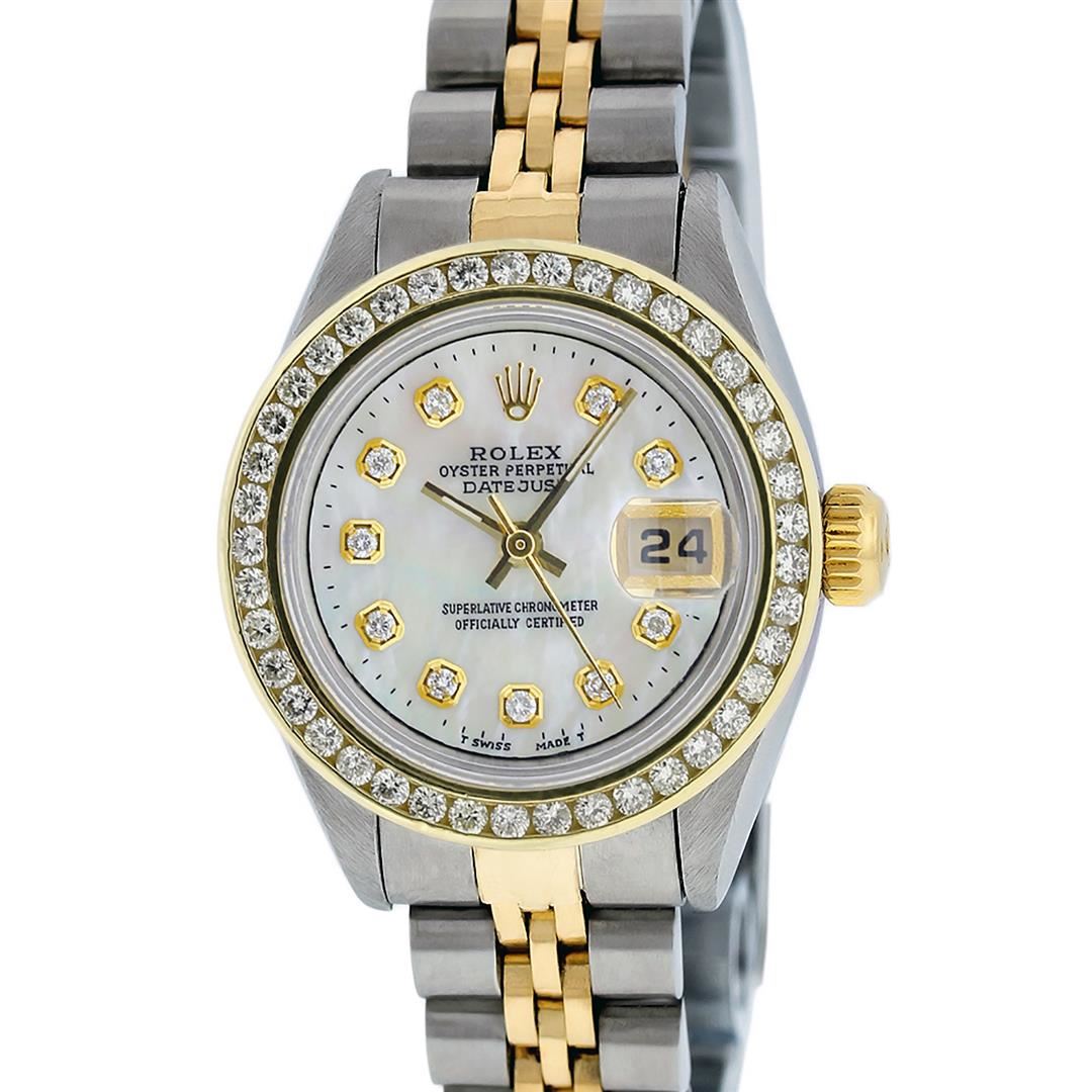 One Ladies Pre Owned 18K Two Tone Rolex Datejust Polished, Serviced & Electronically Tested, 18K Yellow Gold & Stainless Steel Case: 26mm, 18K Yellow Gold Crown, Custom Bezel: New 18K Yellow Gold Channel Set Diamond Bezel, Diamond Count: 44 Diamonds in di