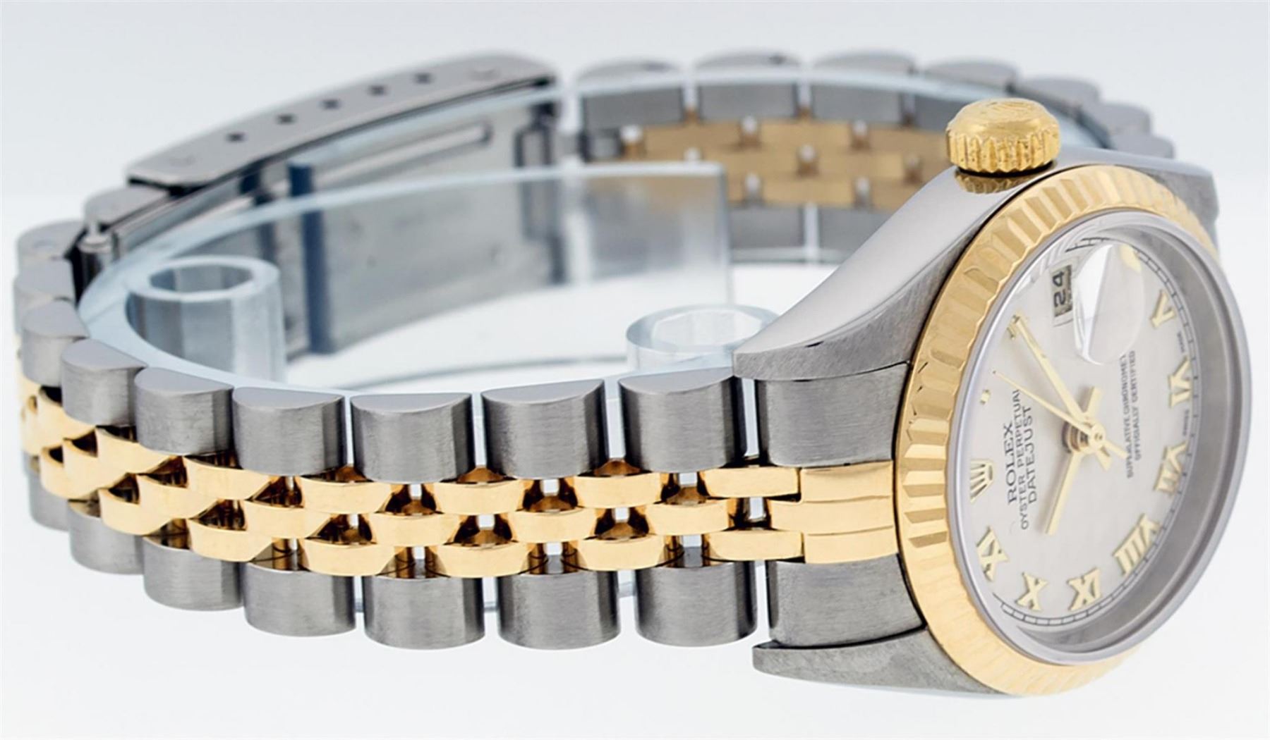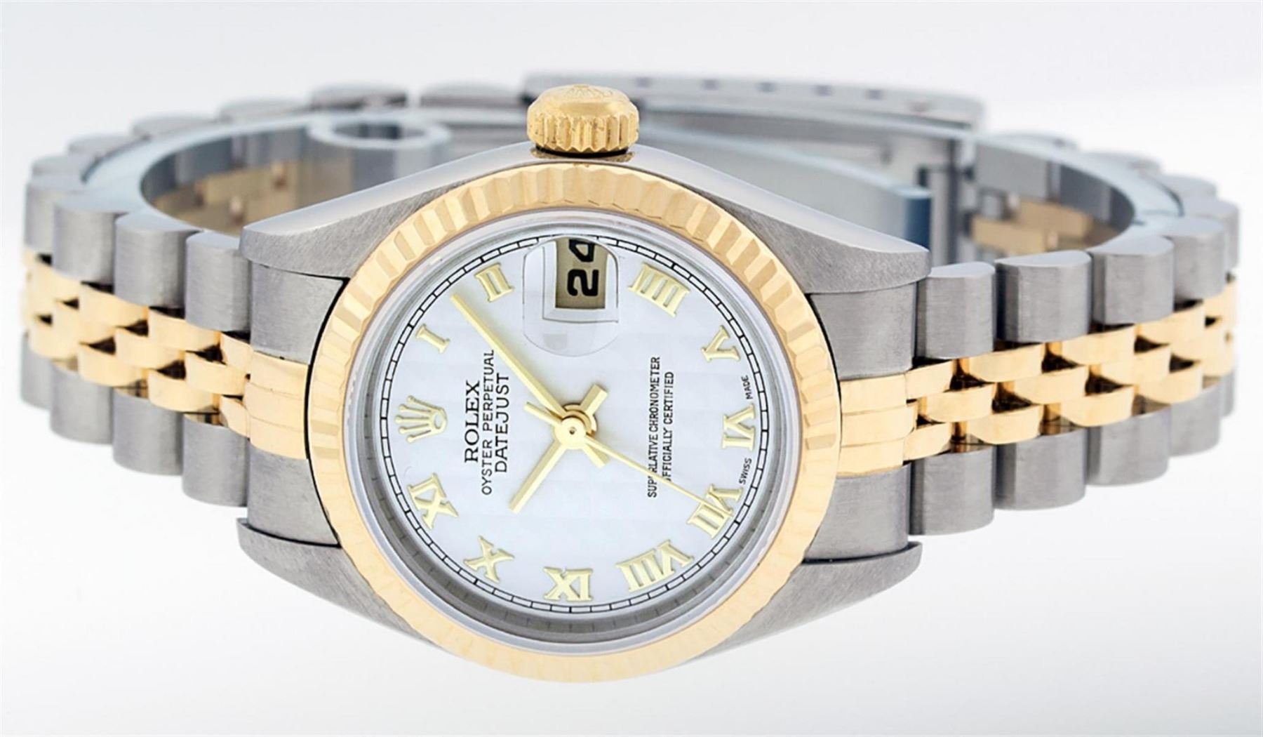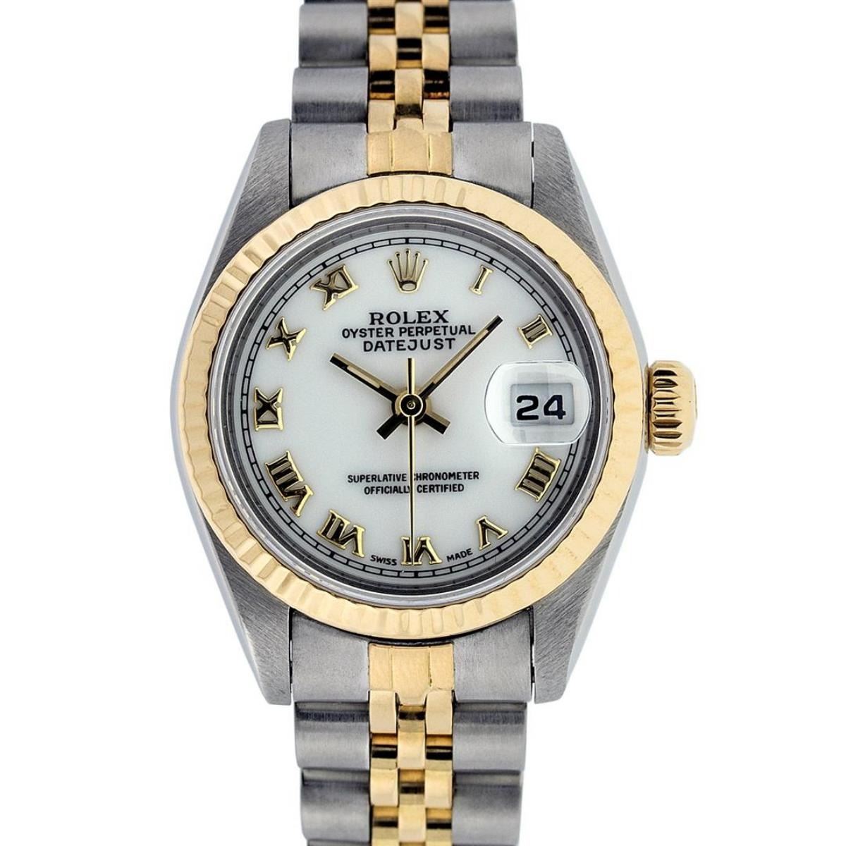 One Ladies 18K Two Tone Rolex Datejust Polished, Serviced & Electronically Tested, 18K Yellow Gold & Stainless Steel, Case Size: 26mm, 18K Yellow Gold Crown, Bezel: 18K Yellow Gold Fluted Bezel. Custom Crystal: New Scratch Resistant Sapphire Crystal With Cyclops Lens. Custom Hands: New Luminescent Hands. Movement: Automatic Winding Movement. Custom Dial: Mother Of Pearl Roman Dial With Square Track. Date Window: 3 O'Clock Position Date Display, Model: Datejust Caliber 2230. Condition: G-6 Extra Fine. Bracelet: Two Tone 18K Yellow Gold & Stainless Steel Jubilee Band. Bright Polish. 6.0 Inch Length, Adjustable. Standard Clasp, With Rolex Logo. This Watch Has Been Serviced Time Tested And Is In Excellent Condition It Is Free Of All Scratches And Dents.