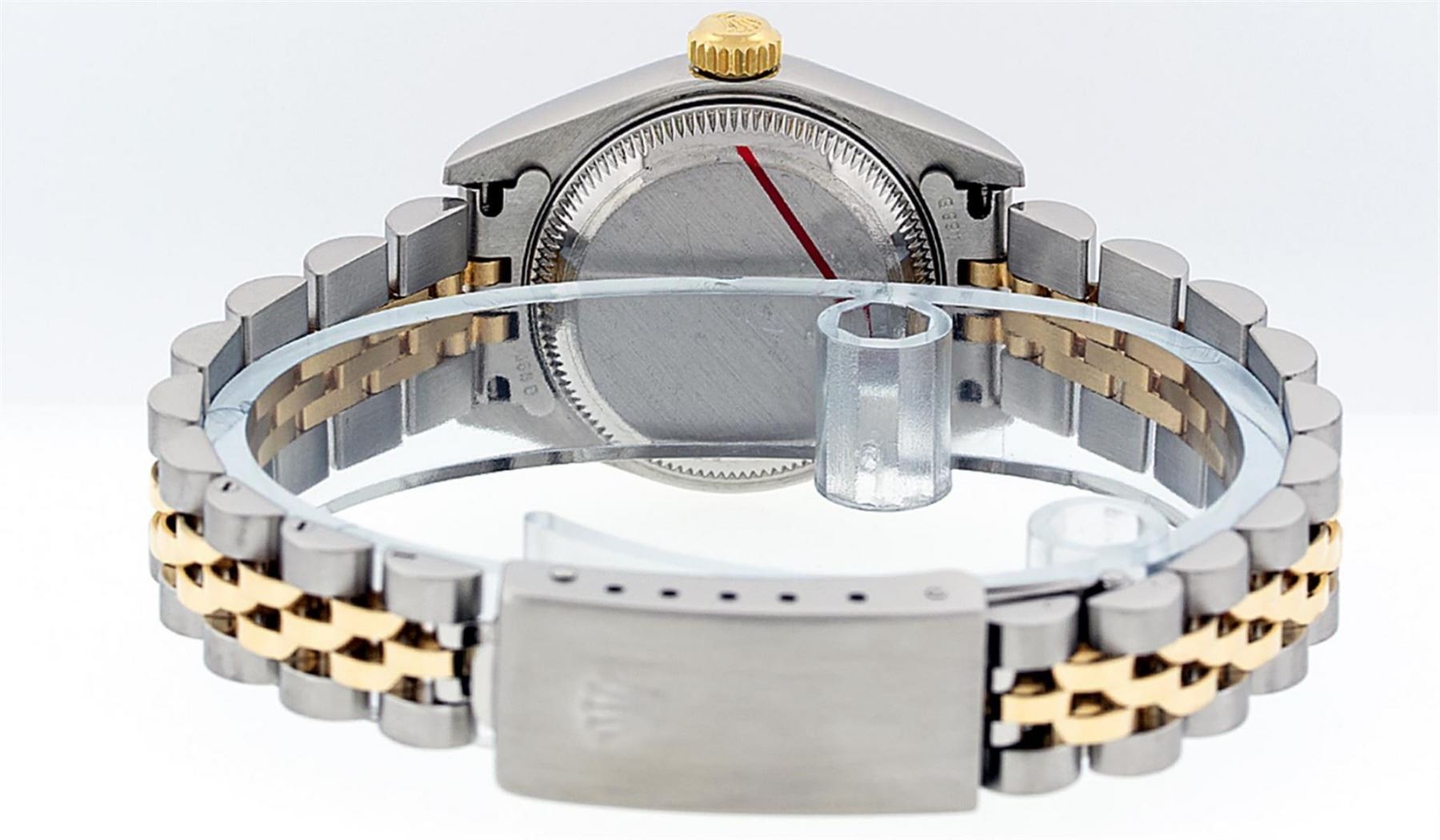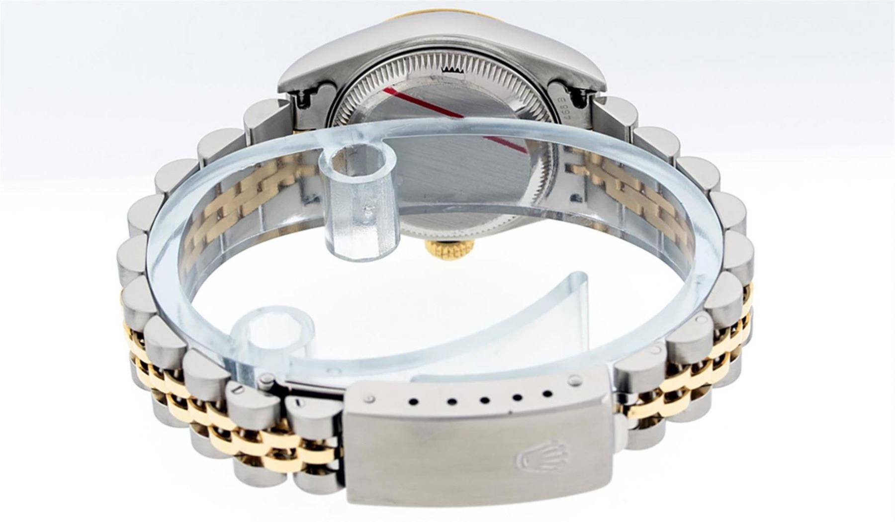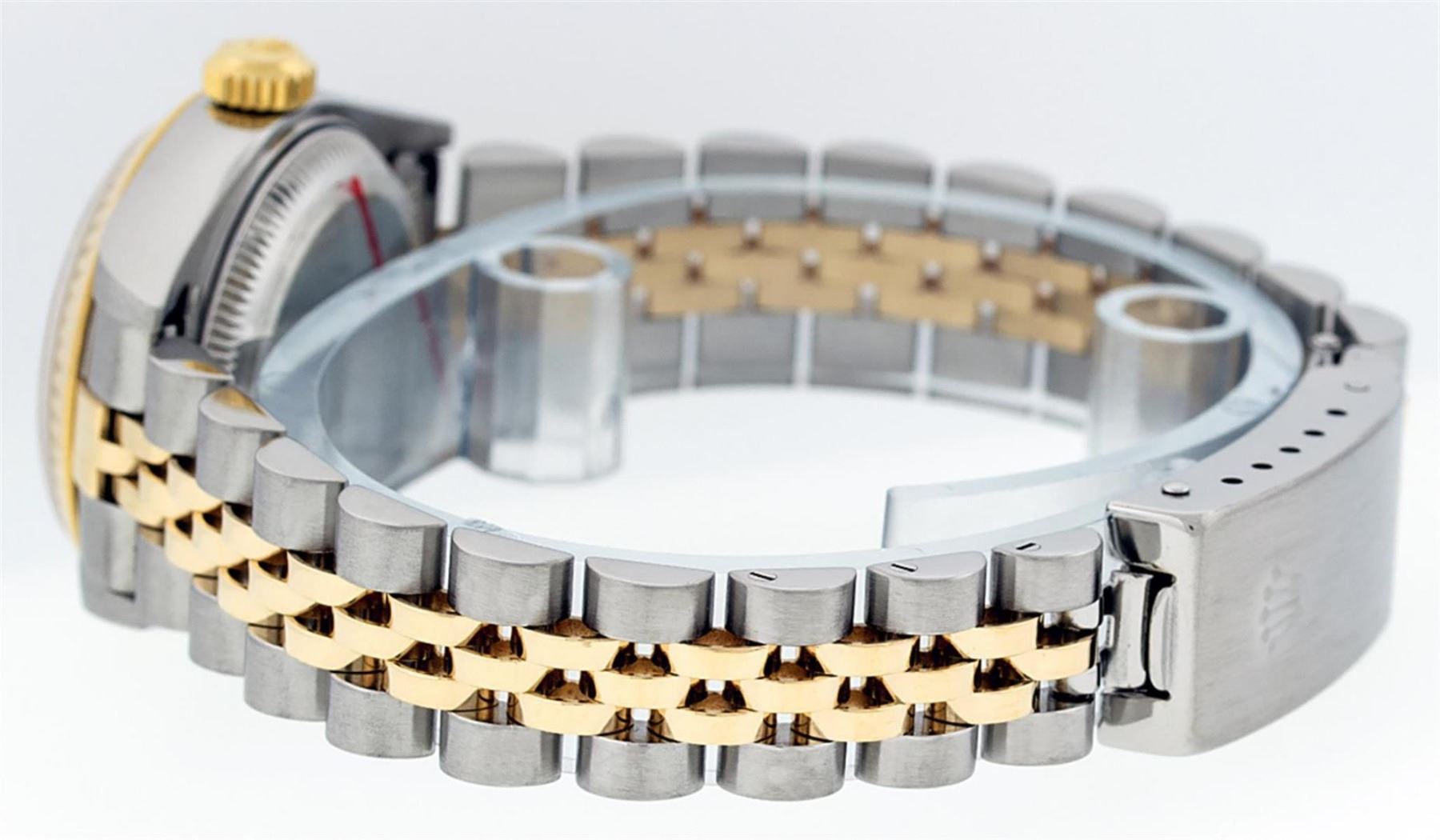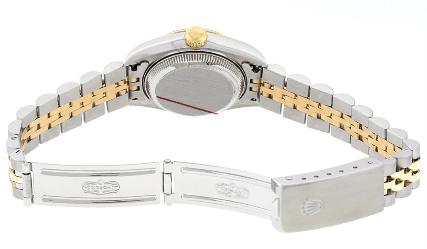 One Ladies 18K Two Tone Rolex Datejust Polished, Serviced & Electronically Tested, 18K Yellow Gold & Stainless Steel, Case Size: 26mm, 18K Yellow Gold Crown, Bezel: 18K Yellow Gold Fluted Bezel. Custom Crystal: New Scratch Resistant Sapphire Crystal With Cyclops Lens. Custom Hands: New Luminescent Hands. Movement: Automatic Winding Movement. Custom Dial: Mother Of Pearl Roman Dial With Square Track. Date Window: 3 O'Clock Position Date Display, Model: Datejust Caliber 2230. Condition: G-6 Extra Fine. Bracelet: Two Tone 18K Yellow Gold & Stainless Steel Jubilee Band. Bright Polish. 6.0 Inch Length, Adjustable. Standard Clasp, With Rolex Logo. This Watch Has Been Serviced Time Tested And Is In Excellent Condition It Is Free Of All Scratches And Dents.