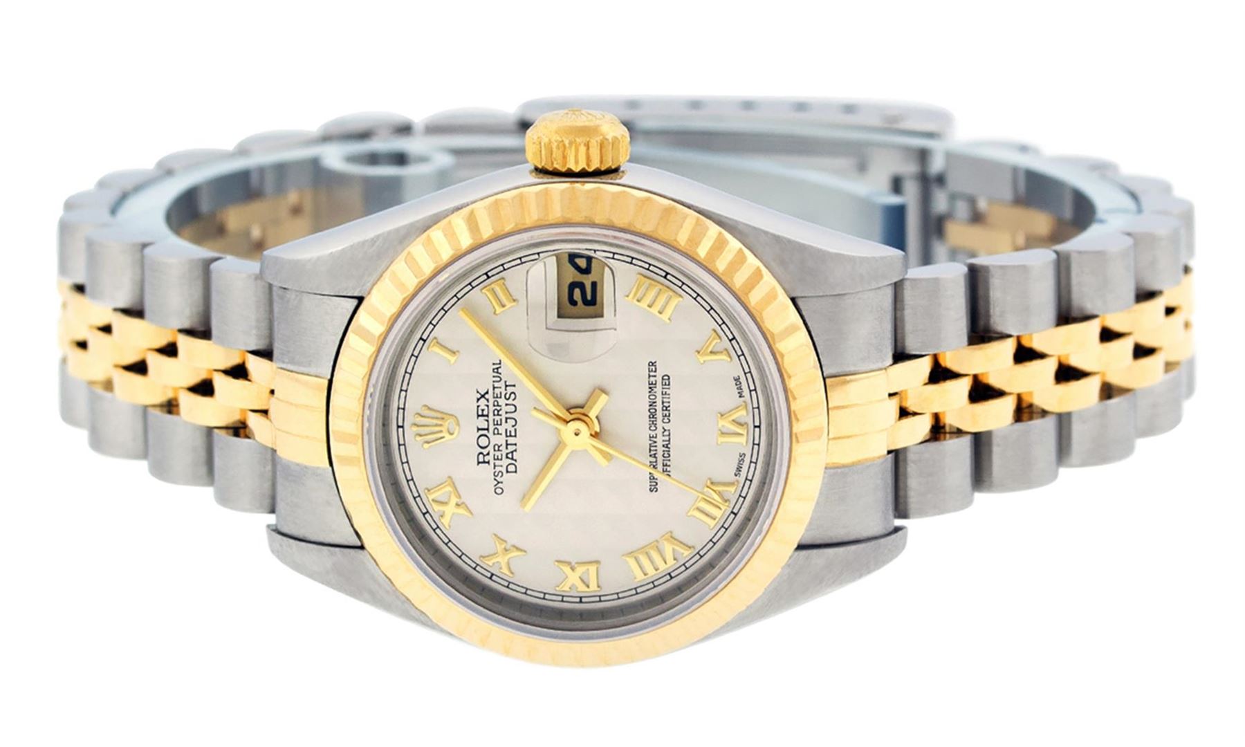 One Ladies Quickset Pre Owned 18K Two Tone Rolex Datejust Polished, Serviced & Electronically Tested, Rolex 18K Yellow Gold & Stainless Steel, Rolex Case Size: 26mm, Rolex 18K Yellow Gold Crown, Rolex Bezel: 18K Yellow Gold Fluted Bezel. Crystal: Sapphire With Magnified Date Window. Hands: Solid Hands. Rolex Movement: Automatic Winding Movement Caliber 2235. Rolex Dial: Ivory Pyramid Roman Dial With Square Track. Date Window: 3 O'Clock Position Date Display, Model: Quickset Datejust. Condition: G-6 Extra Fine. Rolex Bracelet: Two Tone 18K Yellow Gold & Stainless Steel Jubilee Band. Bright Polish. 6.0 Inch Length, Adjustable. Standard Clasp, With Rolex Logo. This Watch Has Been Serviced Time Tested And Is In Excellent Condition It Is Free Of All Scratches And Dents.