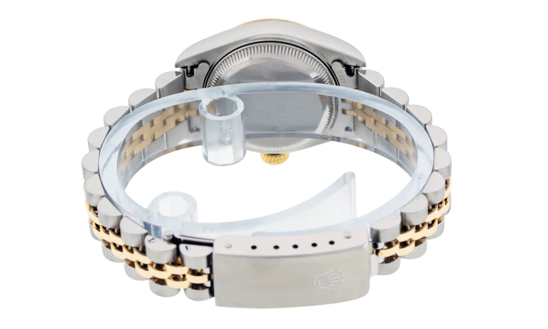 One Ladies Quickset Pre Owned 18K Two Tone Rolex Datejust Polished, Serviced & Electronically Tested, Rolex 18K Yellow Gold & Stainless Steel, Rolex Case Size: 26mm, Rolex 18K Yellow Gold Crown, Rolex Bezel: 18K Yellow Gold Fluted Bezel. Crystal: Sapphire With Magnified Date Window. Hands: Solid Hands. Rolex Movement: Automatic Winding Movement Caliber 2235. Rolex Dial: Ivory Pyramid Roman Dial With Square Track. Date Window: 3 O'Clock Position Date Display, Model: Quickset Datejust. Condition: G-6 Extra Fine. Rolex Bracelet: Two Tone 18K Yellow Gold & Stainless Steel Jubilee Band. Bright Polish. 6.0 Inch Length, Adjustable. Standard Clasp, With Rolex Logo. This Watch Has Been Serviced Time Tested And Is In Excellent Condition It Is Free Of All Scratches And Dents.