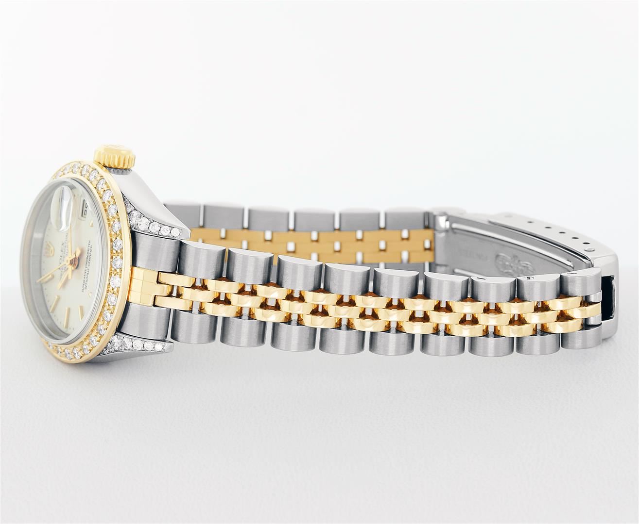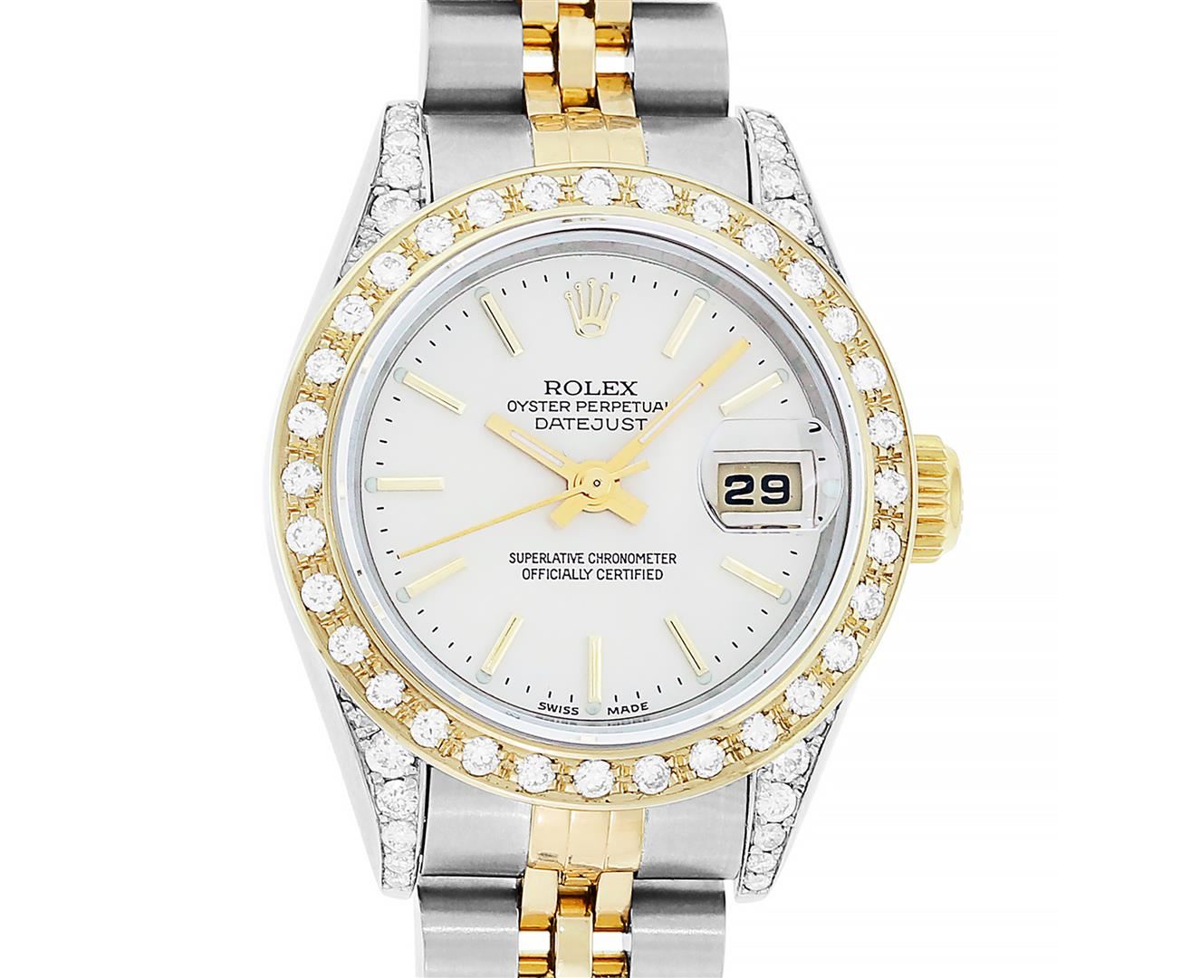 One Pre Owned Quickset Ladies Two Tone 18K Yellow Gold & Stainless Rolex Polished, Serviced & Electronically Tested, Rolex 18K Yellow Gold & Stainless Steel Case: 26mm, Custom Diamond Lugs: Added Diamonds On Lugs, Diamond Count: 24 Diamonds On Lugs. Rolex Yellow Gold Crown, Custom Bezel: New 18K Yellow Gold Diamond Bezel, Diamond Count: 32 Diamonds, Clarity: SI-VS, Color: G to H. Custom Crystal: New Sapphire With Magnified Date Window. Custom Hands: New Lumi Hands. Rolex Movement: Automatic Quickset Winding Movement 2235. Rolex Dial: Silver Index With Lumi Dots And Dash Track. Date Window: 3 O'Clock Position Date Display, Model: Quickset Datejust, Condition: G-6 Extra Fine. Rolex Bracelet: Two Tone 18K Yellow Gold & Stainless Steel Jubilee Band. Bright Polish. 6.0 Inch Length, Adjustable. Standard Clasp, With Rolex Logo. This Watch Has Been Serviced Time Tested And Is In Excellent Condition It Is Free Of All Scratches And Dents.