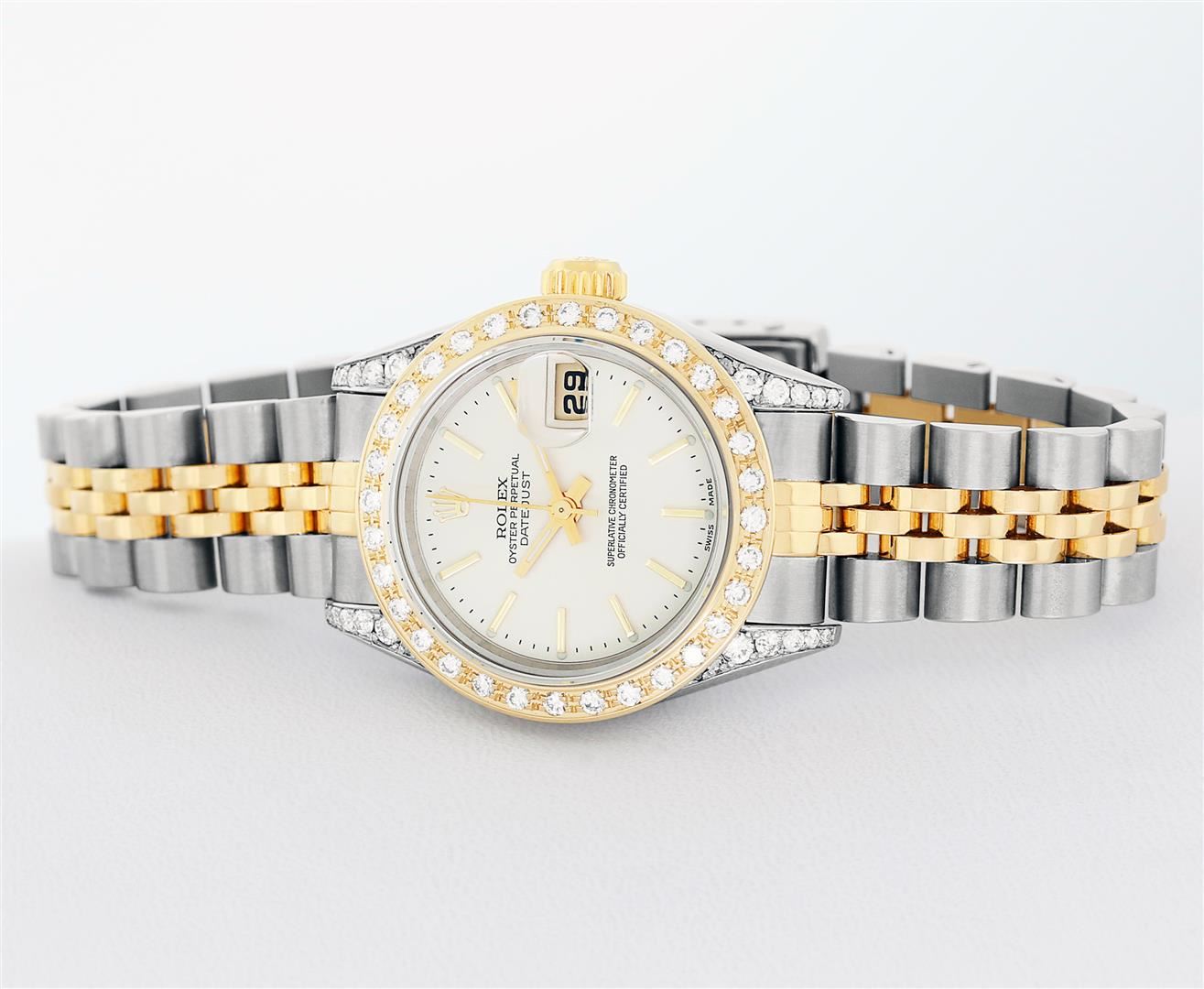 One Pre Owned Quickset Ladies Two Tone 18K Yellow Gold & Stainless Rolex Polished, Serviced & Electronically Tested, Rolex 18K Yellow Gold & Stainless Steel Case: 26mm, Custom Diamond Lugs: Added Diamonds On Lugs, Diamond Count: 24 Diamonds On Lugs. Rolex Yellow Gold Crown, Custom Bezel: New 18K Yellow Gold Diamond Bezel, Diamond Count: 32 Diamonds, Clarity: SI-VS, Color: G to H. Custom Crystal: New Sapphire With Magnified Date Window. Custom Hands: New Lumi Hands. Rolex Movement: Automatic Quickset Winding Movement 2235. Rolex Dial: Silver Index With Lumi Dots And Dash Track. Date Window: 3 O'Clock Position Date Display, Model: Quickset Datejust, Condition: G-6 Extra Fine. Rolex Bracelet: Two Tone 18K Yellow Gold & Stainless Steel Jubilee Band. Bright Polish. 6.0 Inch Length, Adjustable. Standard Clasp, With Rolex Logo. This Watch Has Been Serviced Time Tested And Is In Excellent Condition It Is Free Of All Scratches And Dents.