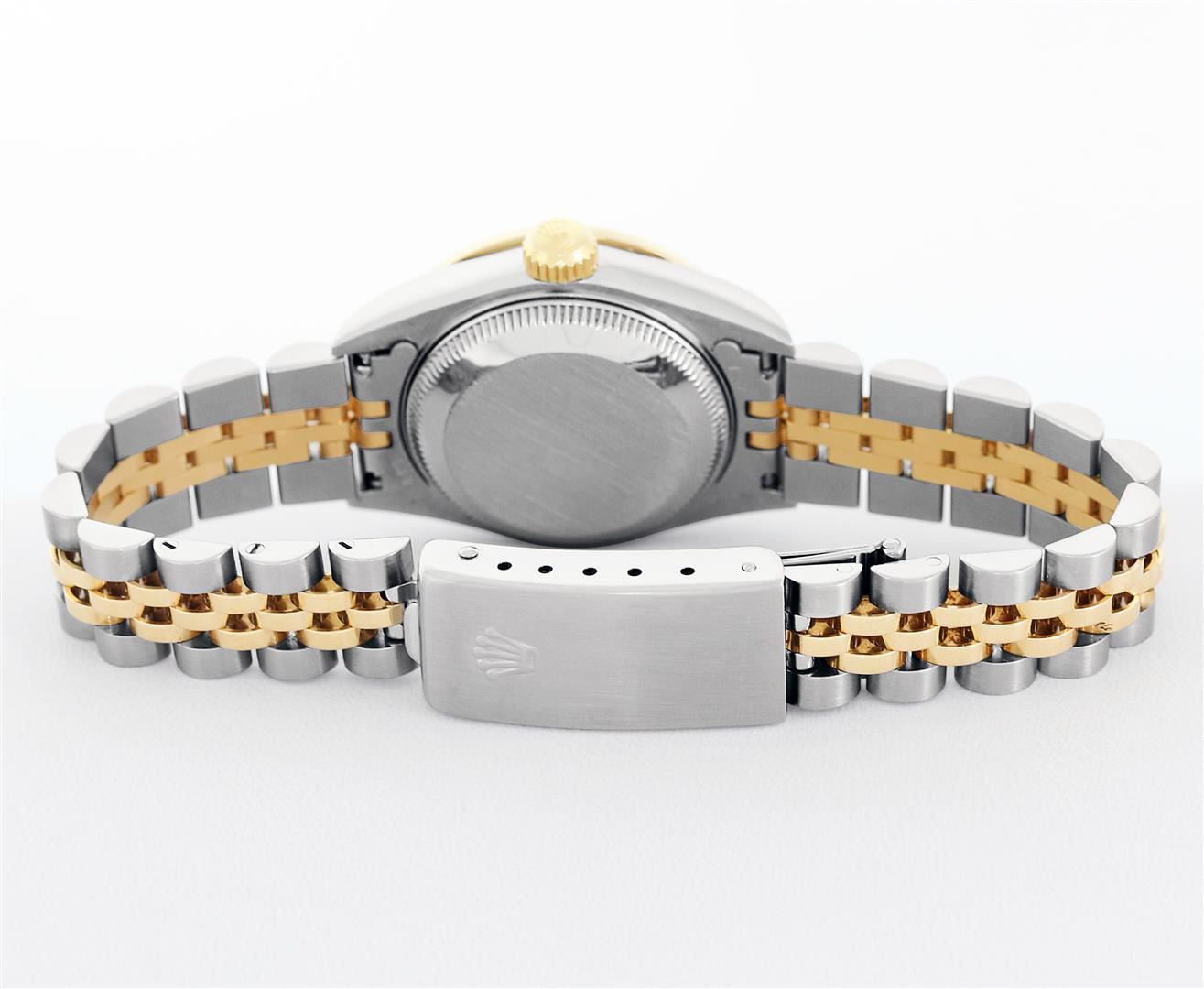 One Pre Owned Quickset Ladies Two Tone 18K Yellow Gold & Stainless Rolex Polished, Serviced & Electronically Tested, Rolex 18K Yellow Gold & Stainless Steel Case: 26mm, Custom Diamond Lugs: Added Diamonds On Lugs, Diamond Count: 24 Diamonds On Lugs. Rolex Yellow Gold Crown, Custom Bezel: New 18K Yellow Gold Diamond Bezel, Diamond Count: 32 Diamonds, Clarity: SI-VS, Color: G to H. Custom Crystal: New Sapphire With Magnified Date Window. Custom Hands: New Lumi Hands. Rolex Movement: Automatic Quickset Winding Movement 2235. Rolex Dial: Silver Index With Lumi Dots And Dash Track. Date Window: 3 O'Clock Position Date Display, Model: Quickset Datejust, Condition: G-6 Extra Fine. Rolex Bracelet: Two Tone 18K Yellow Gold & Stainless Steel Jubilee Band. Bright Polish. 6.0 Inch Length, Adjustable. Standard Clasp, With Rolex Logo. This Watch Has Been Serviced Time Tested And Is In Excellent Condition It Is Free Of All Scratches And Dents.