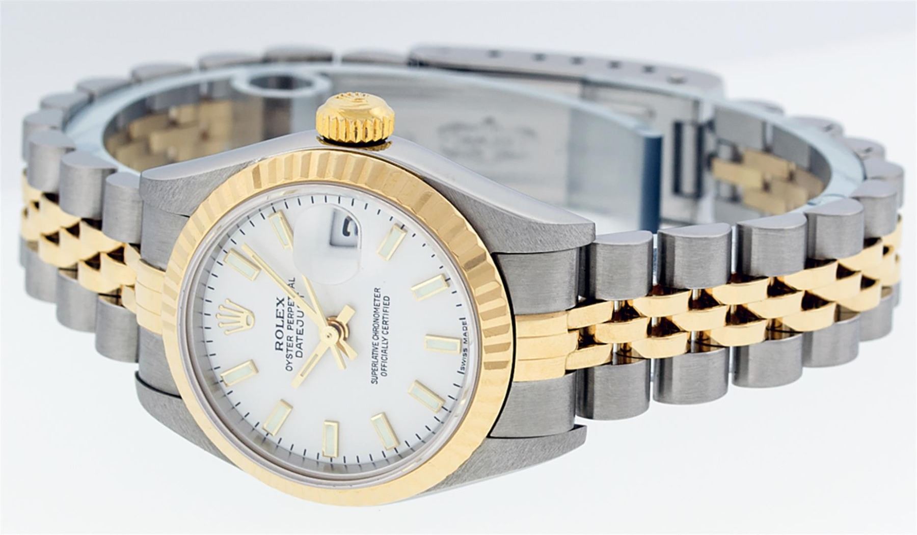 One Ladies Pre Owned 18K Two Tone Rolex Datejust Polished, Serviced & Electronically Tested, 18K Yellow Gold & Stainless Steel, Case Size: 26mm, 18K Yellow Gold Crown, Rolex Bezel: 18K Yellow Gold Fluted Bezel. Custom Crystal: New Sapphire With Magnified Date Window. Custom Hands: New Luminescent Hands. Rolex Movement: Automatic Winding Movement 2235. Custom Dial: White Roman Dial With Roman Track. Date Window: 3 O'Clock Position Date Display, Model: Datejust. Condition: G-6 Extra Fine. Rolex Bracelet: Two Tone 18K Yellow Gold & Stainless Steel Jubilee Band. Bright Polish. 6.0 Inch Length, Adjustable. Standard Clasp, With Rolex Logo. This Watch Has Been Serviced Time Tested And Is In Excellent Condition It Is Free Of All Scratches And Dents.