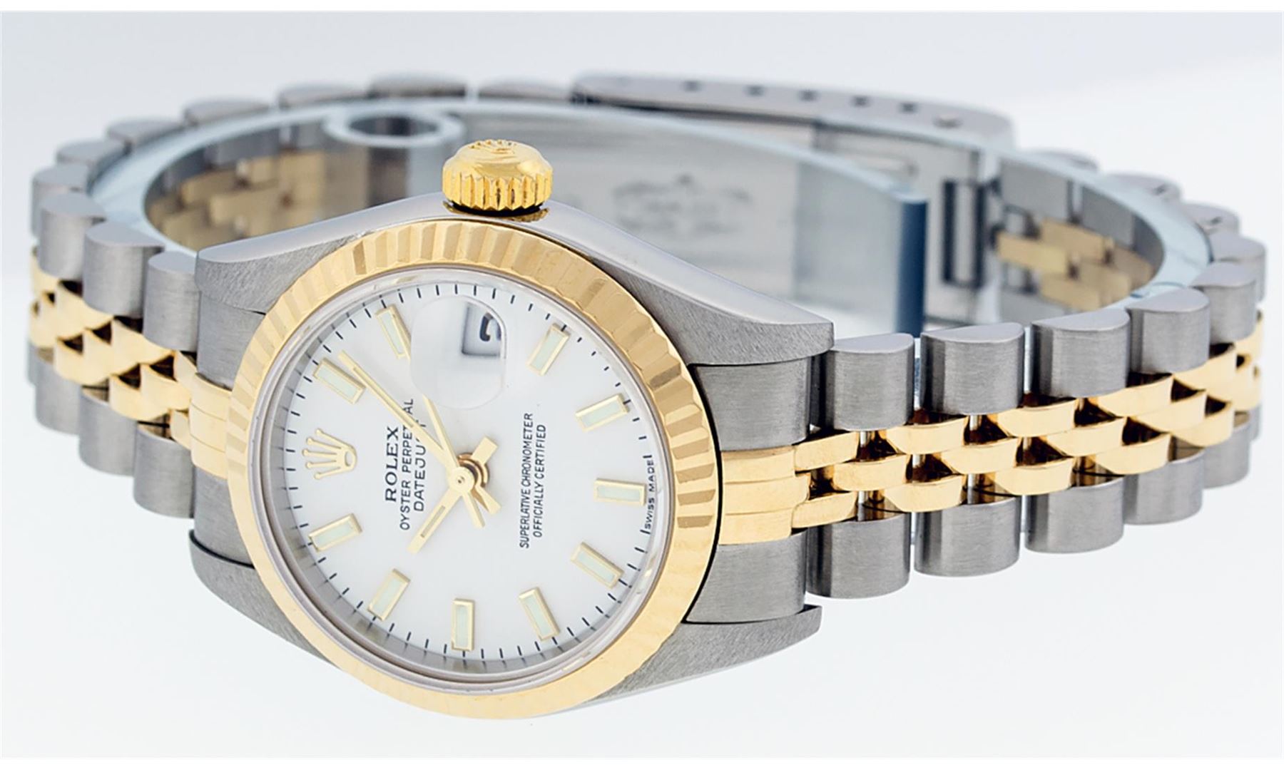 One Ladies Pre Owned 18K Two Tone Rolex Datejust Polished, Serviced & Electronically Tested, 18K Yellow Gold & Stainless Steel, Case Size: 26mm, 18K Yellow Gold Crown, Rolex Bezel: 18K Yellow Gold Fluted Bezel. Custom Crystal: New Sapphire With Magnified Date Window. Custom Hands: New Luminescent Hands. Rolex Movement: Automatic Winding Movement 2235. Custom Dial: White Roman Dial With Roman Track. Date Window: 3 O'Clock Position Date Display, Model: Datejust. Condition: G-6 Extra Fine. Rolex Bracelet: Two Tone 18K Yellow Gold & Stainless Steel Jubilee Band. Bright Polish. 6.0 Inch Length, Adjustable. Standard Clasp, With Rolex Logo. This Watch Has Been Serviced Time Tested And Is In Excellent Condition It Is Free Of All Scratches And Dents.