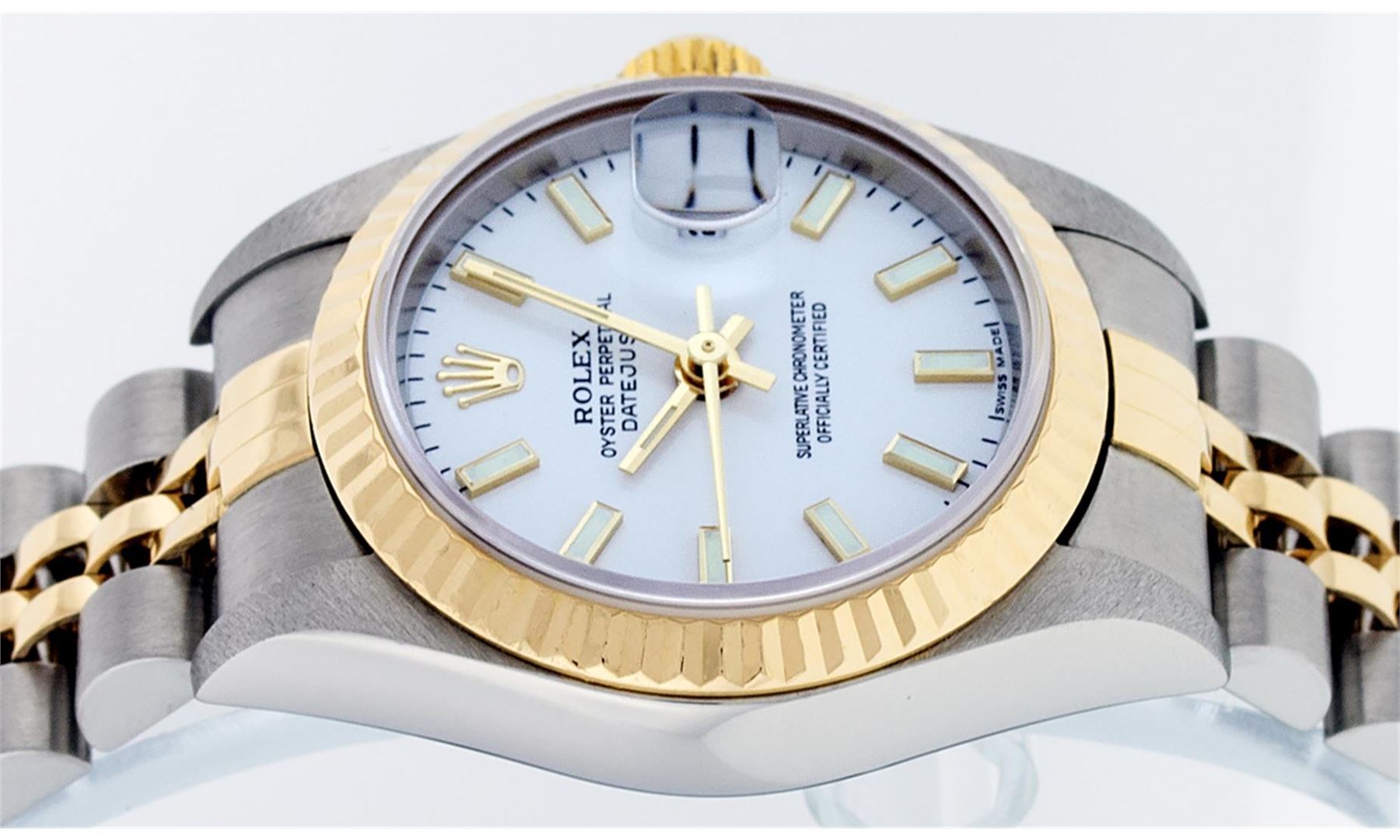 One Ladies Pre Owned 18K Two Tone Rolex Datejust Polished, Serviced & Electronically Tested, 18K Yellow Gold & Stainless Steel, Case Size: 26mm, 18K Yellow Gold Crown, Rolex Bezel: 18K Yellow Gold Fluted Bezel. Custom Crystal: New Sapphire With Magnified Date Window. Custom Hands: New Luminescent Hands. Rolex Movement: Automatic Winding Movement 2235. Custom Dial: White Roman Dial With Roman Track. Date Window: 3 O'Clock Position Date Display, Model: Datejust. Condition: G-6 Extra Fine. Rolex Bracelet: Two Tone 18K Yellow Gold & Stainless Steel Jubilee Band. Bright Polish. 6.0 Inch Length, Adjustable. Standard Clasp, With Rolex Logo. This Watch Has Been Serviced Time Tested And Is In Excellent Condition It Is Free Of All Scratches And Dents.