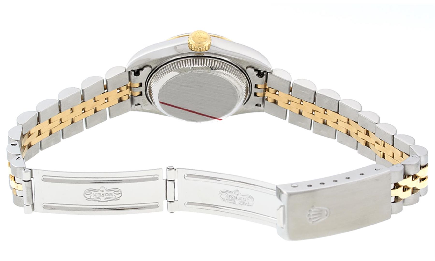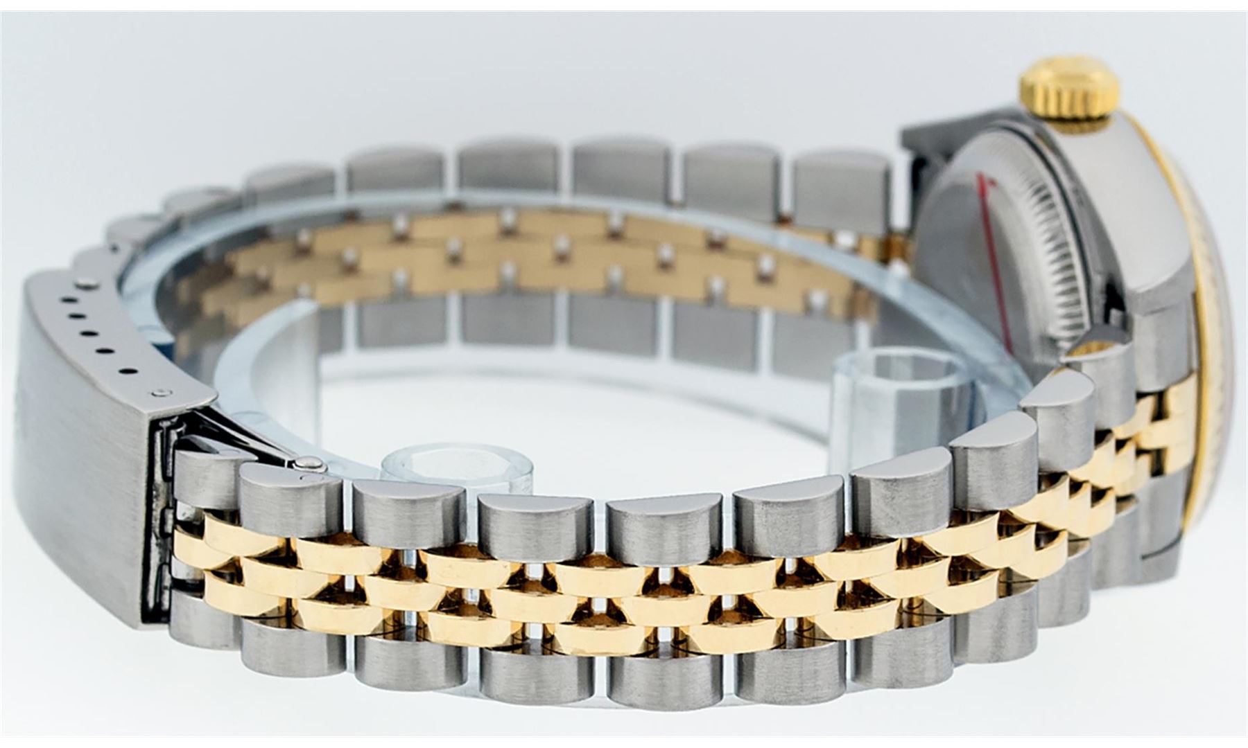 One Ladies Pre Owned 18K Two Tone Rolex Datejust Polished, Serviced & Electronically Tested, 18K Yellow Gold & Stainless Steel, Case Size: 26mm, 18K Yellow Gold Crown, Rolex Bezel: 18K Yellow Gold Fluted Bezel. Custom Crystal: New Sapphire With Magnified Date Window. Custom Hands: New Luminescent Hands. Rolex Movement: Automatic Winding Movement 2235. Custom Dial: White Roman Dial With Roman Track. Date Window: 3 O'Clock Position Date Display, Model: Datejust. Condition: G-6 Extra Fine. Rolex Bracelet: Two Tone 18K Yellow Gold & Stainless Steel Jubilee Band. Bright Polish. 6.0 Inch Length, Adjustable. Standard Clasp, With Rolex Logo. This Watch Has Been Serviced Time Tested And Is In Excellent Condition It Is Free Of All Scratches And Dents.