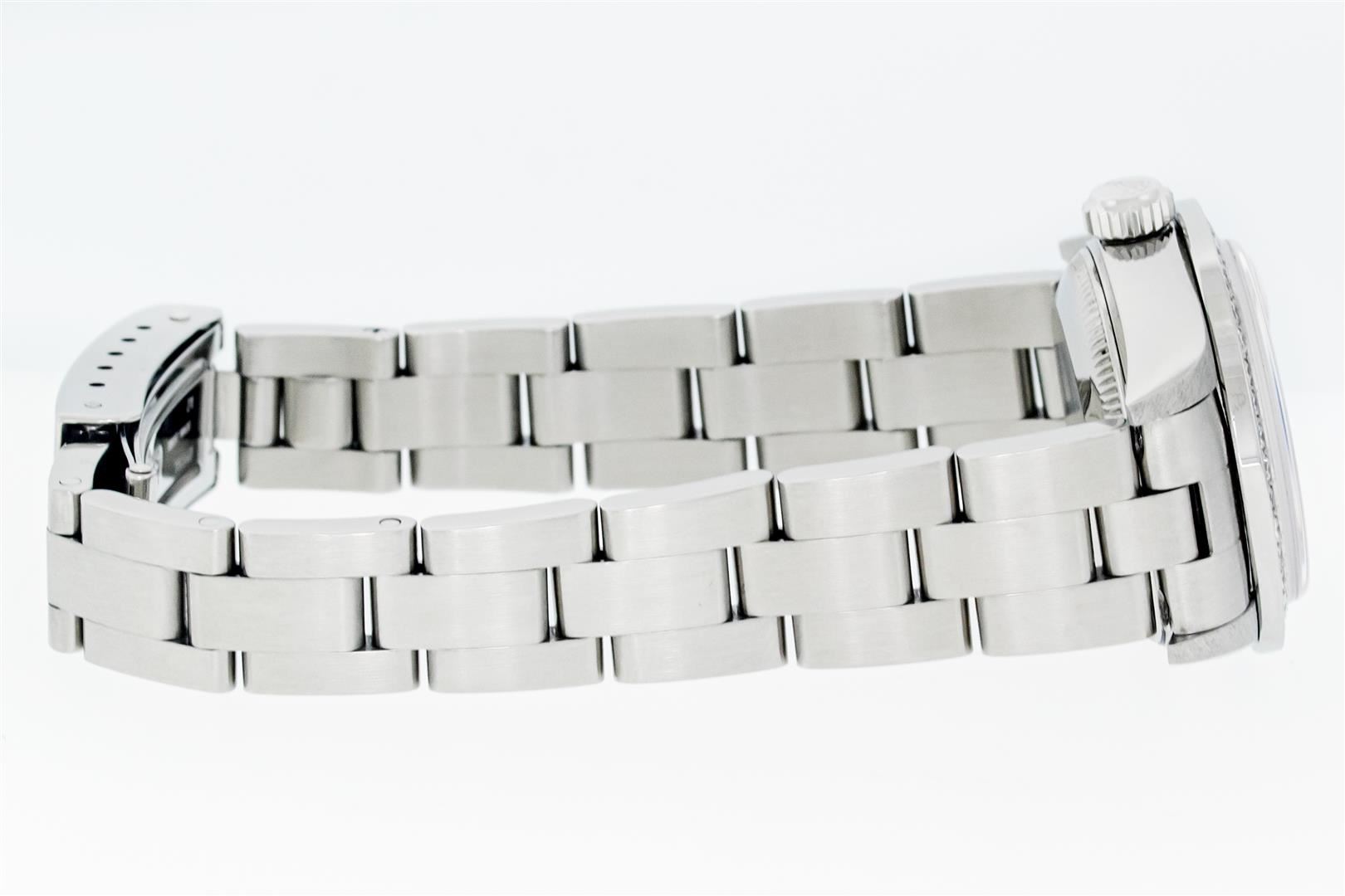 One Ladies Pre Owned Quickset Stainless Steel Rolex Datejust Polished Bright with Satin Finish, Serviced & Electronically Tested, Stainless Steel Case: 26mm, Rolex Stainless Steel Crown, Custom Bezel: New Stainless Steel Bead Set Diamond Bezel, Diamond Count: 40 Diamonds, Clarity: SI-VS, Color: G to H. Custom Crystal: New Sapphire With Magnified Date Window. Custom Hands: New Luminescent Hands. Rolex Movement: Automatic Winding Movement 2235. Rolex Dial: Black With Index Hour Markers & Dash Track. Date Window: 3 O'Clock Position Date Display, Model: Quickset Datejust. Condition: G-6 Extra Fine. Rolex Bracelet: Stainless Steel Oyster Band. Bright Polish & Satin Finish. 6.0 Inch Length, Adjustable. Standard Clasp, With Rolex Logo. This Watch Has Been Serviced Time Tested And Is In Excellent Condition It Is Free Of All Scratches And Dents.